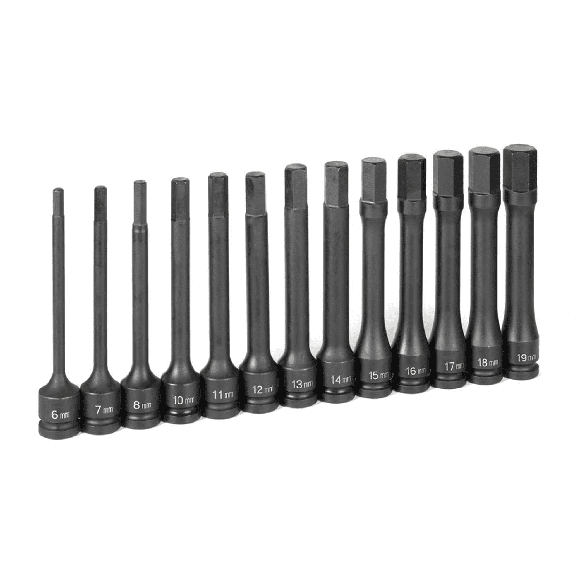 Set contains one piece impact hex drivers 6″ length in sizes 6mm to 19mm Made from high quality chrome-molybdenum steel Heat treated for strength and durability Size markings are hard stamped into the socket for easy identification