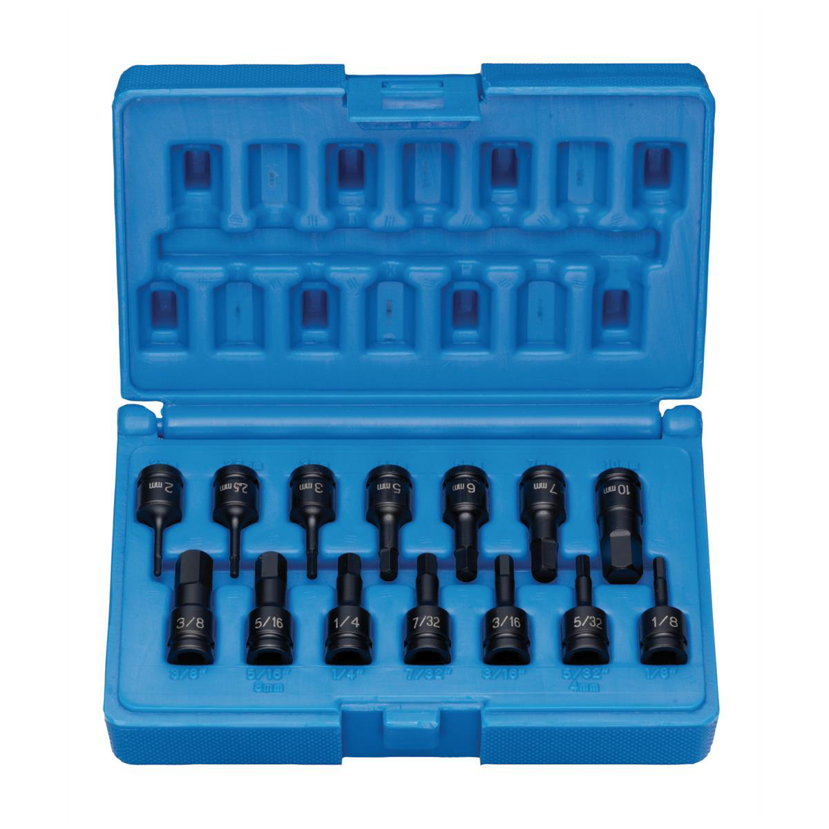 Features and Benefits: Made of high quality steel (chrome-molybdenum); thorough and exact heat treatment insures the correct balance of strength and durability Thorough and exact heat treatment insures the correct balance of strength and durability Packaged in a molded storage case Lifetime warranty Set includes: 1/8″, 5/32″ / 4mm, 3/16″, 7/32″, 1/4″, 5/16″ / 8mm, 3/8″, 2mm, 2.5mm, 3mm, 5mm, 6mm, 7mm, 10mm. 1/4 in. Drive 14-Piece Impact Hex Driver Set.