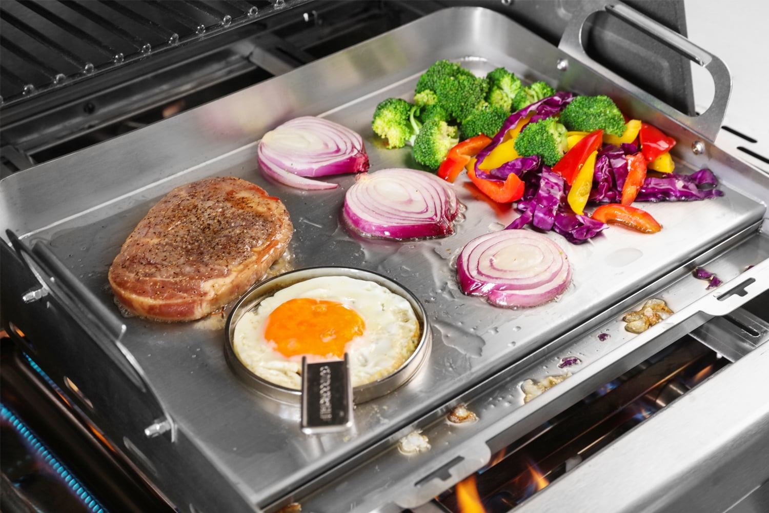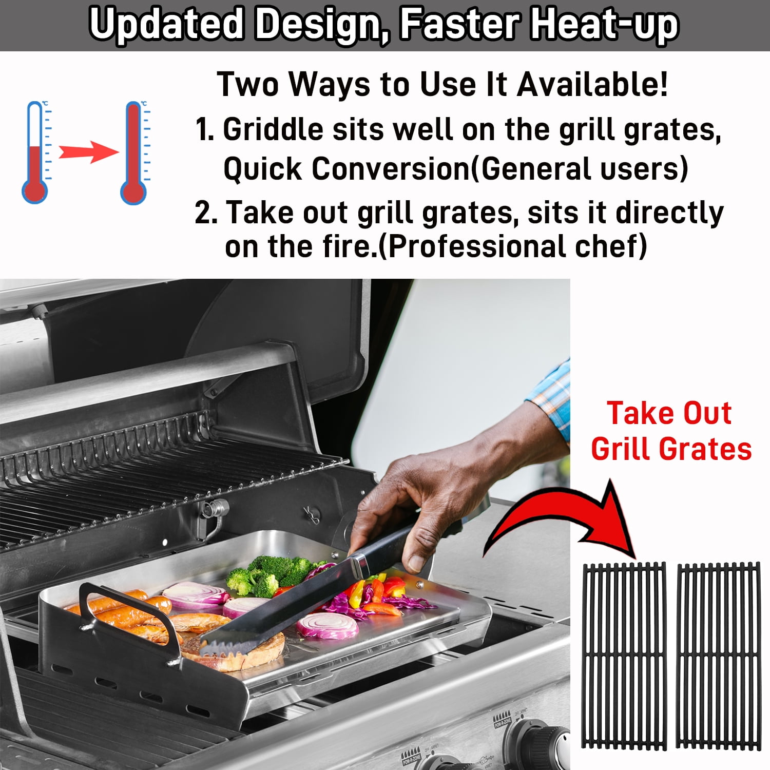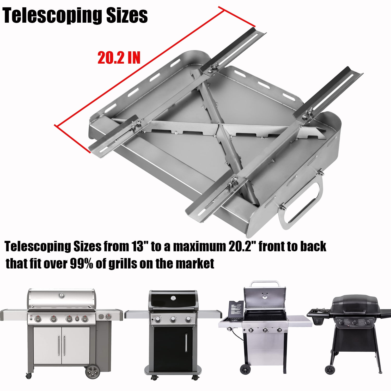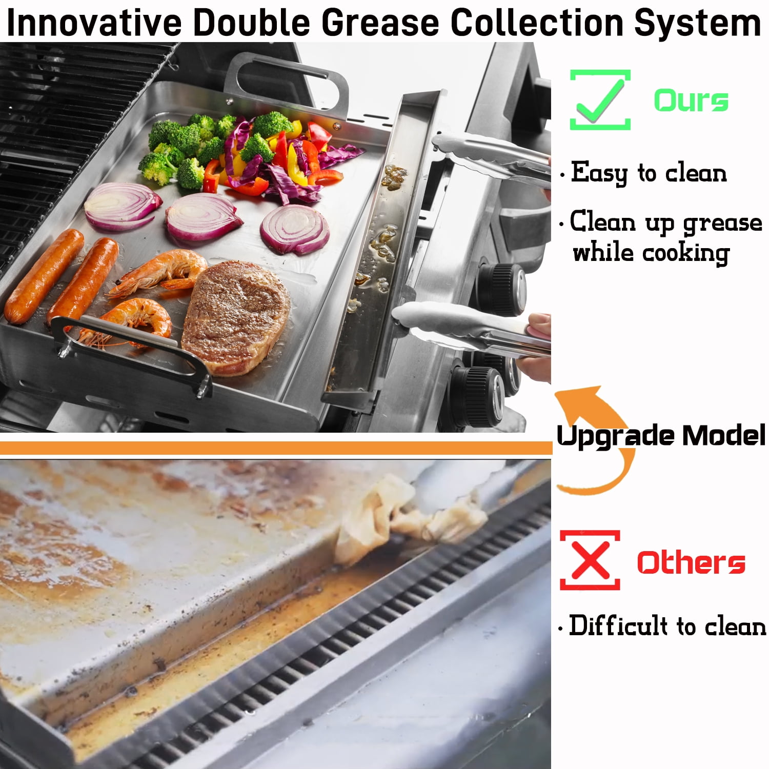 GRIDDLE PERFECTLY FITS GAS GRILL &CHARCOAL GRILL &GAS STOVE Innovative double grease collection system, so you don’t have to worry about grease buildup on the griddle during cooking and can clean it at any time! With the telescopic support design, the griddle sits directly on the fire, which will allow you to start your cooking faster and enjoy your food faster. All forged with professional grade stainless steel, the surface is meticulously treated to not hurt your hands, heat resistant without warping, and high heat resistance.a