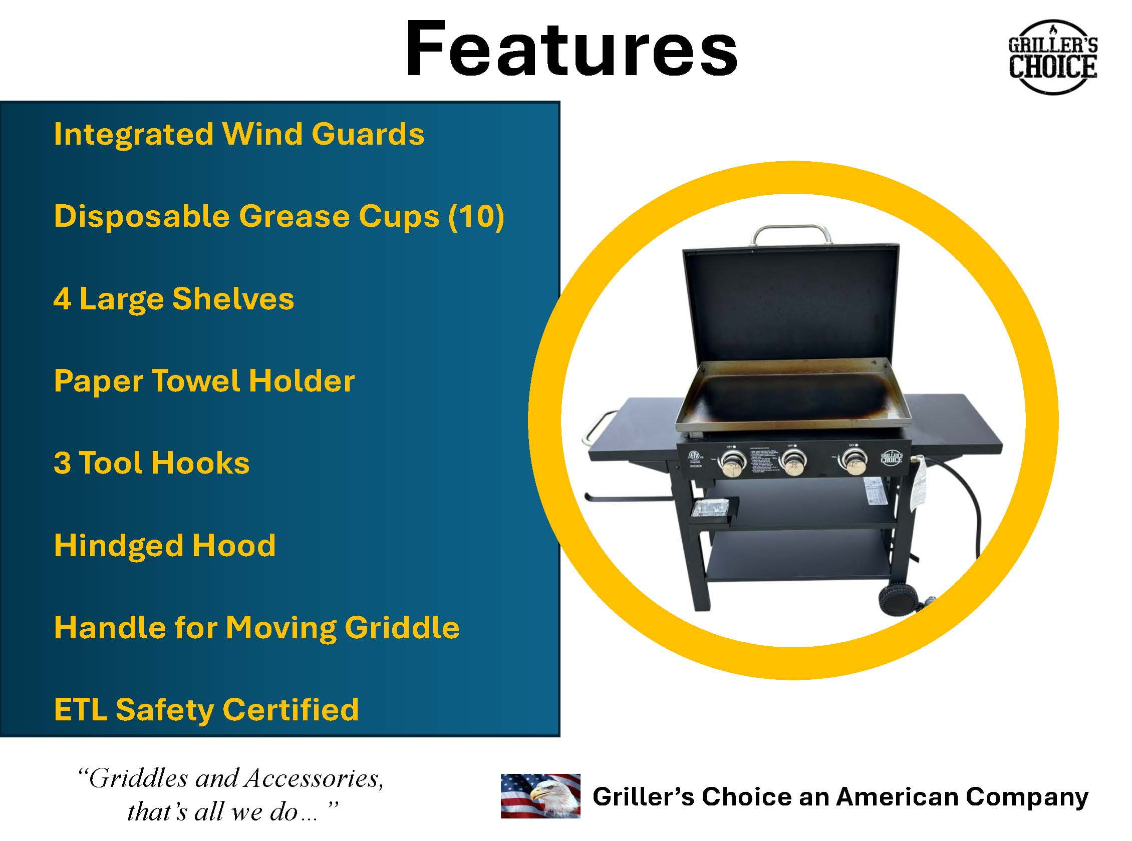 Griller’s Choice Propane Gas Griddle with Hinged Hood, Integrated Wind Guards, Front Grease Management, 4 Shelves