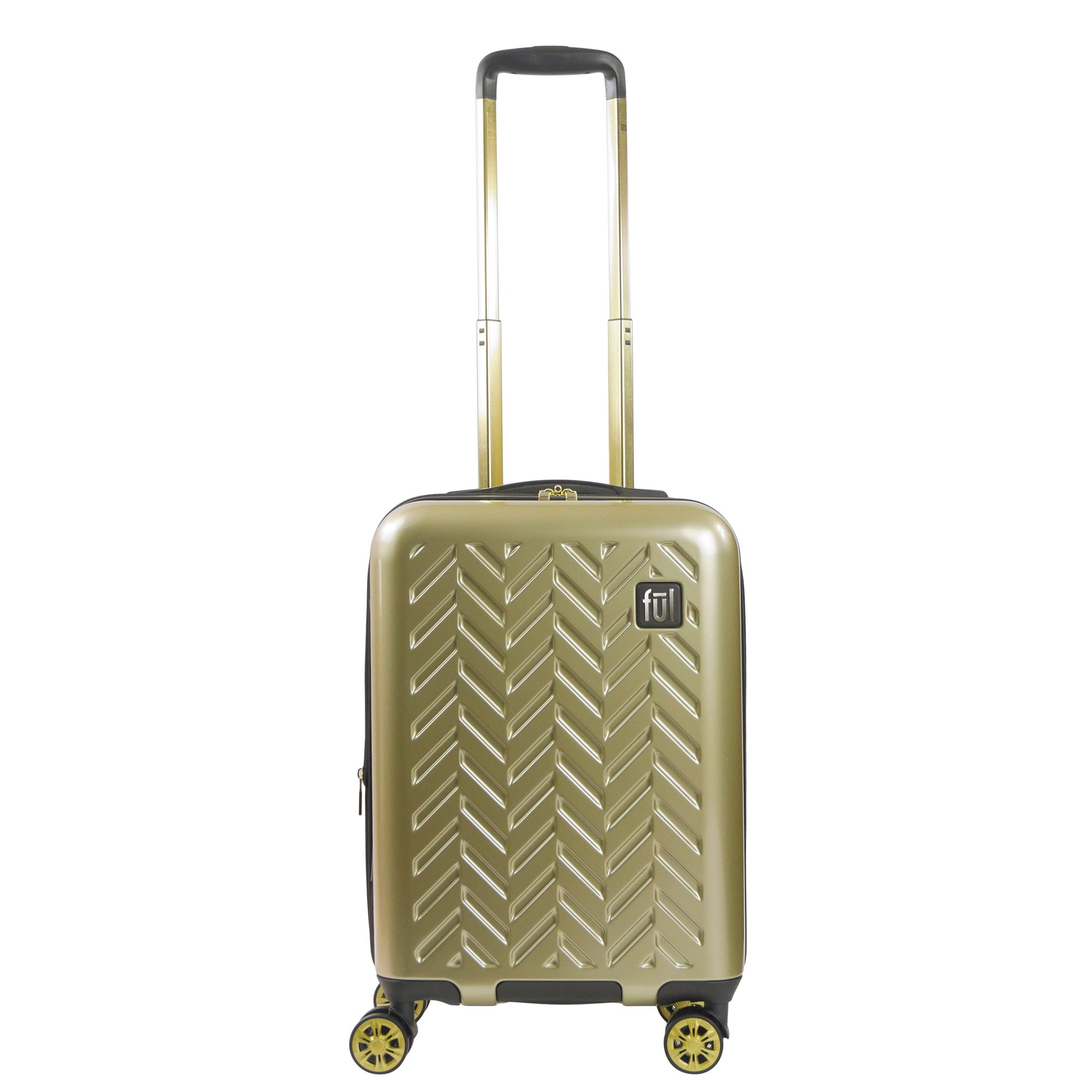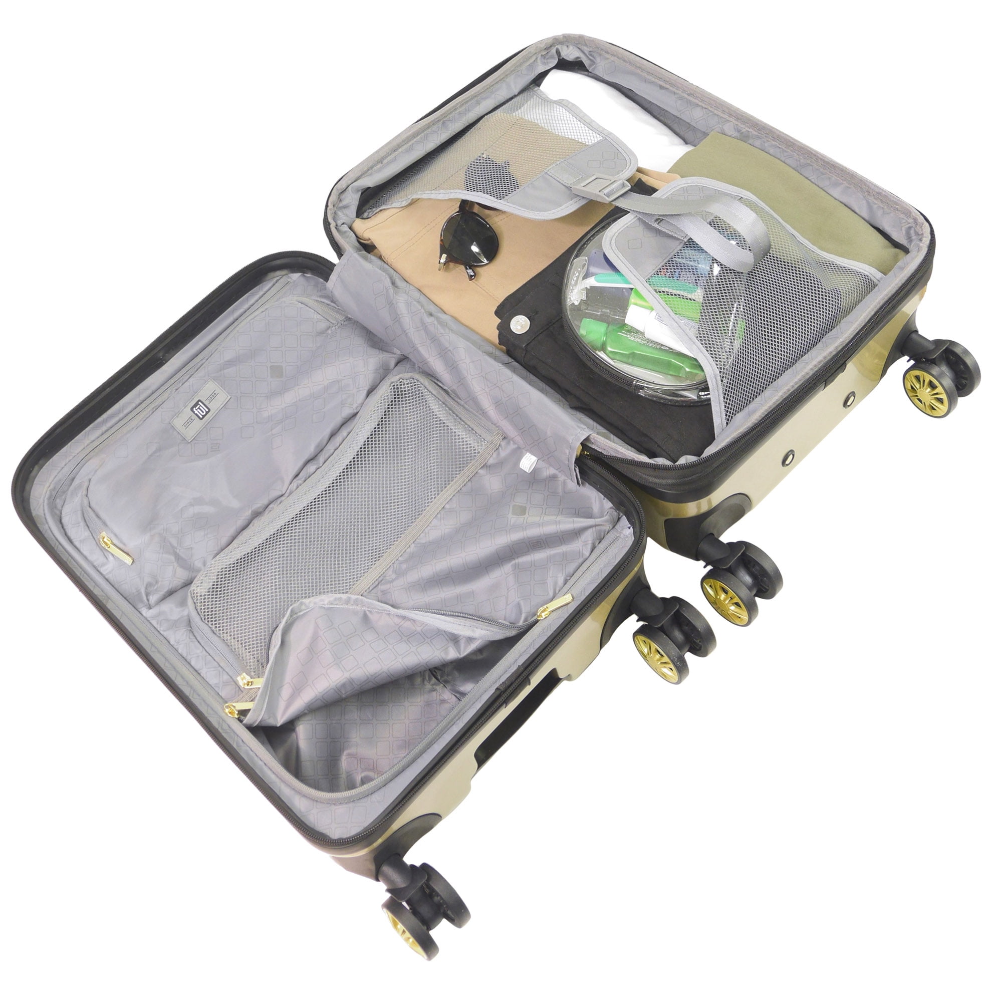 Hardside luggage with a sleek luxurious design with striking gold hardware; Hardshell luggage carrier meets most airline requirements for carry-on luggage and fits into most overhead bins Hard luggage features a divided full-body main compartment and 2 interior zipper compartments for storing your belongings, clothing compression straps to keep clothing from wrinkling, and features expandable storage with 2-inch zipper gusset Wheeled luggage bags feature a lightweight upright design with eight 360-degree multi-directional spinner wheels and a retractable handle which allows for effortless movement Travel luggage bag features a hard shell ABS plastic case which protects your luggage and is easy to spot clean Hard shell suitcases measure 22 H x 14 W x 9.75 D in inches, and weigh 6.5 lbs