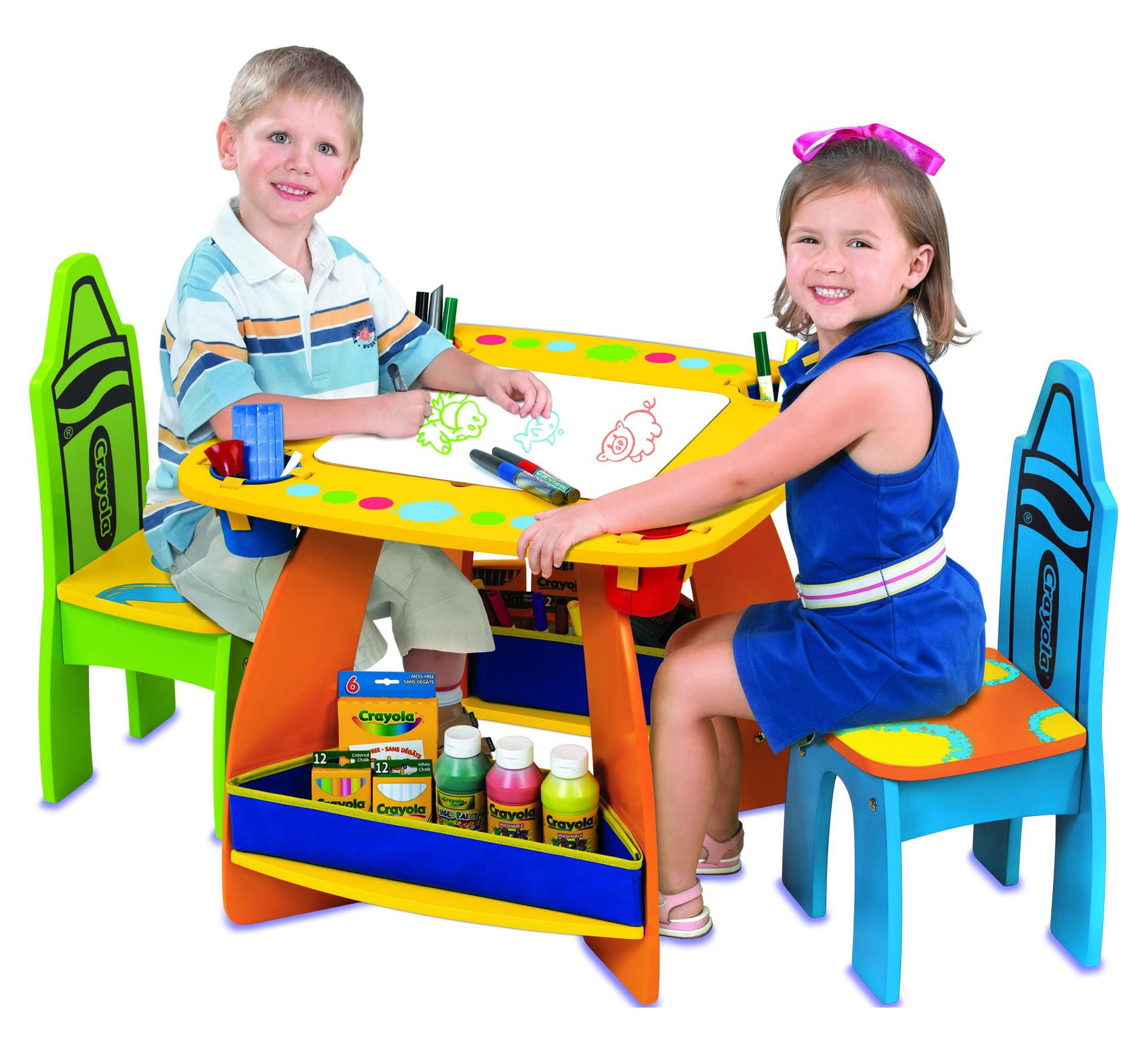 The Grow’n Up Crayola Wooden Table and Chair Set is a wonderful and practical gift for your toddler. Not only is it fun, but functional too. You can use it to store your child’s arts and crafts accessories. Keeping in mind children love attractive and dazzling colors, the Crayola wooden art table and chairs set is eye-catching in bright, yellow and orange. The tabletop can be flipped over to reveal a chalkboard top for doodling in chalk. This table will bring out the creativity in your child, allowing them to convert their ideas and thoughts into images. The set includes one table and two chairs with adorable crayon-shaped backs. It also includes two storage bins connected to the table legs and four fabric holders to keep drawing accessories neat. The children’s wooden table and chairs require assembly. Bring home the Crayola table and chair set and watch your child’s artistic genius unfold.
