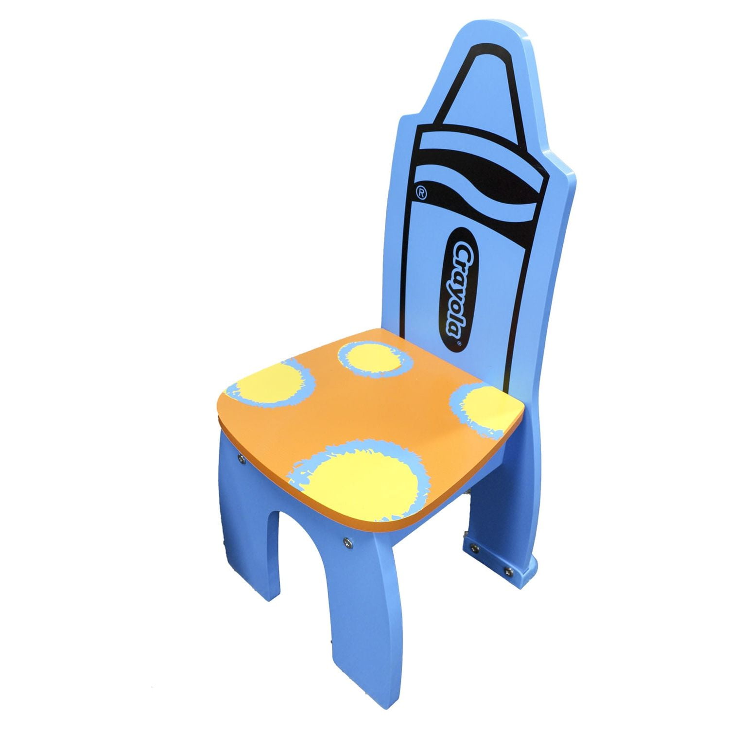 Grow’n up #9001 Crayola Wooden Table & Chair Set Dimensions: 23 L x 23 W x 19 H inches Made from durable wood Recommended for children ages 3 and up A brightly colored table in orange and yellow Colorful chair backs shaped like crayons Kids will discover the world of creativity