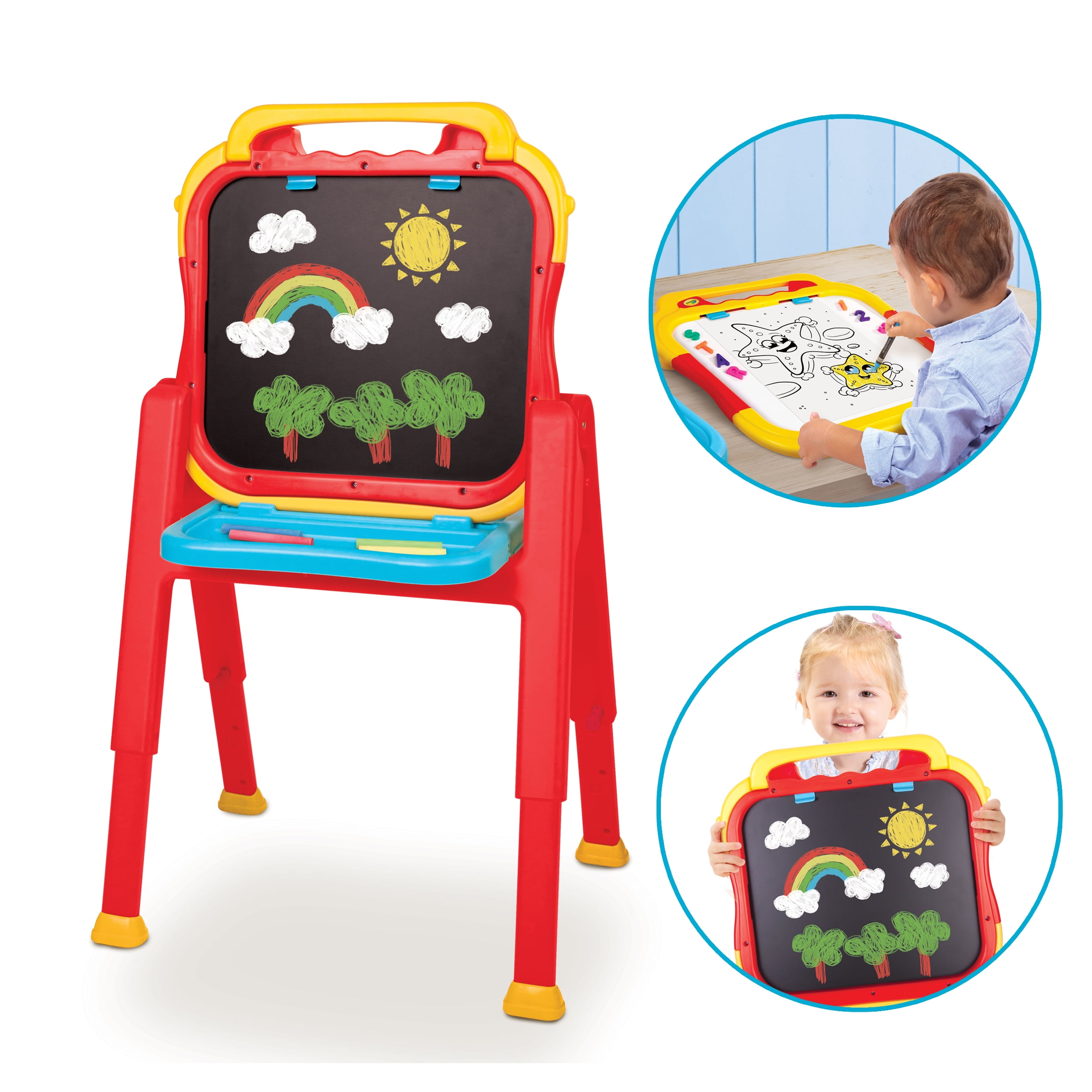 Crayola #5107 Triple the Fun Art Plastic Easel, will Bring the Creativity Out in Your Little Artist. This Easel Features a 3 in 1 Magnetic/Dry-Erase, Chalkboard. This Colorful Easel has So Many Play Functions, It’s Sure to Keep Your Little One Busy. The Easel Can be Positioned in Landscape or Portrait and has 4 Level Adjustable Legs to Adjust the Height. The Foldable Design Makes It Perfect for Easy Storage. This Easel Is the Perfect addition to Your Little Ones, Bedroom or Playroom.
