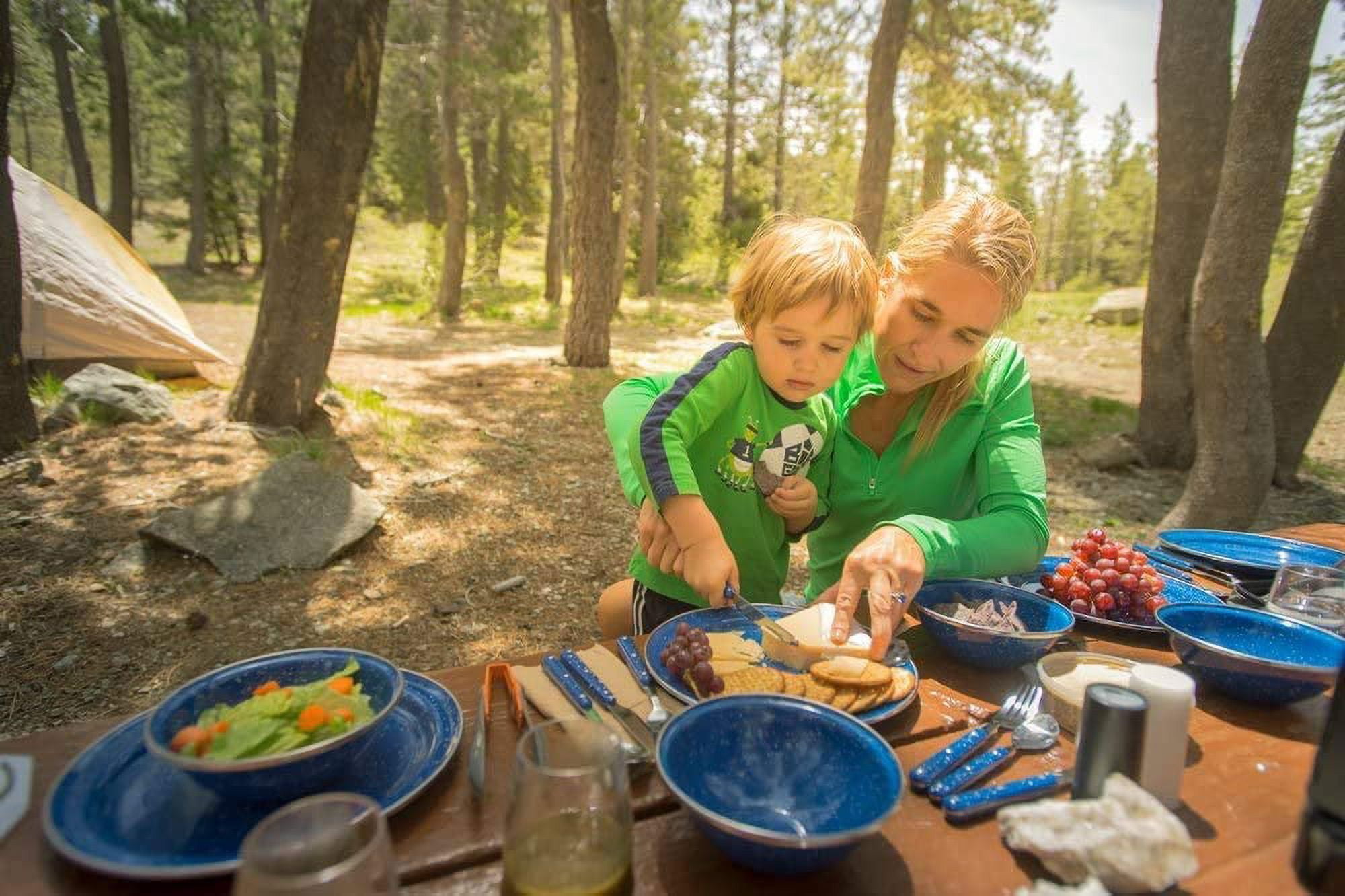 Four person enamelware camp set blends classic style with beautiful blue porcelained finish and brilliant stainless steel rim. Heavy glaze; twice kiln-hardened to 1000 F (537.8 C) for superior durability. Enduring steel construction is dishwasher safe and perfectly suited to both indoor and outdoor use. GSI Outdoors Pioneer Table Set – Blue SKU : 1304.1936 UPC : 90497399121
