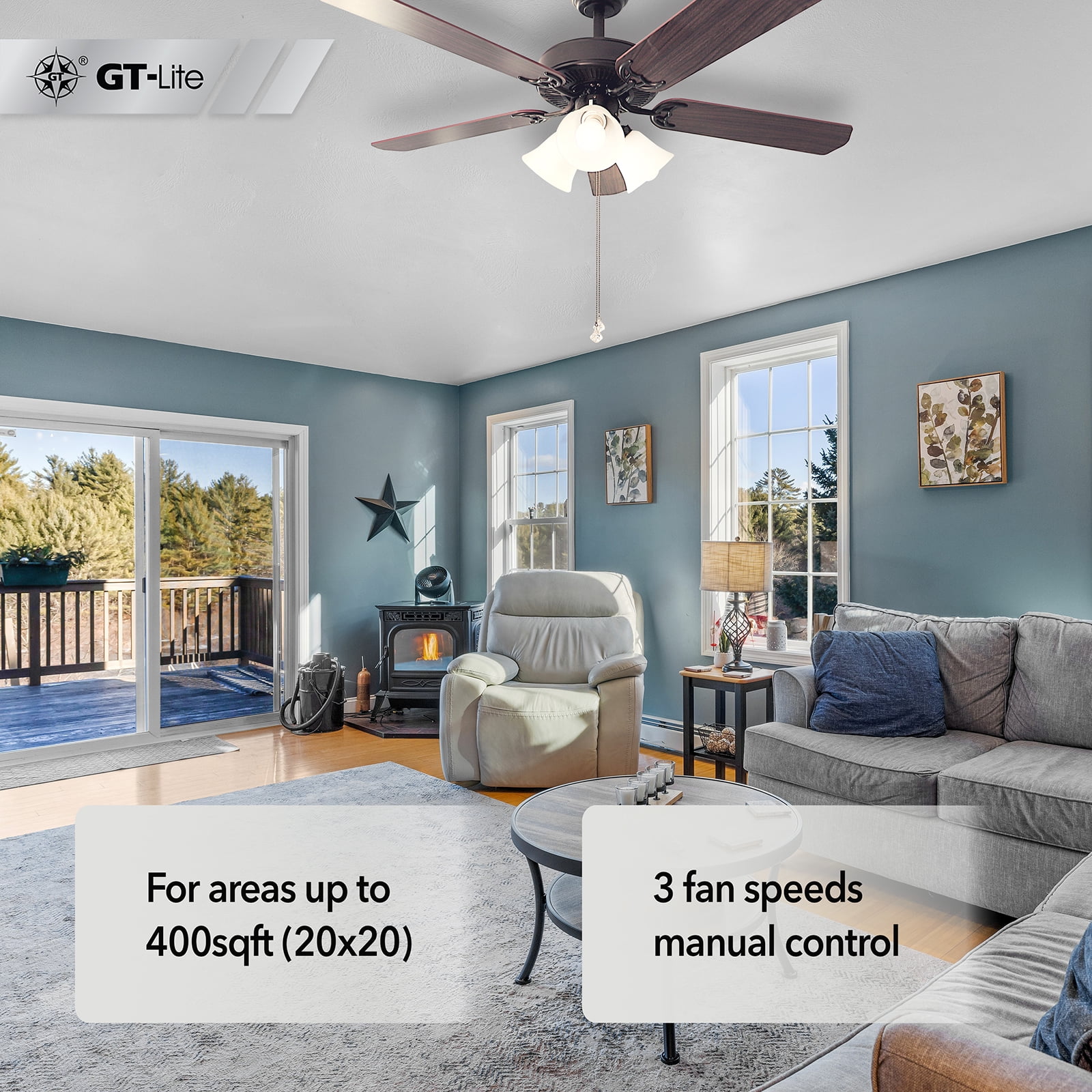 Reversible 65W motor is reliable for all seasons, pushing warmer air down in the winter and cold air down in the summer, evenly distributing the air even at the low setting. This GT-Lite ceiling fan is durable, long-lasting, and offers comfort for years to come. Our LED bulbs offer a low wattage solution for lower energy consumptions, brighter light output, and longer lifespan than traditional incandescent bulbs. The simple on/off pull chains allow you to use the lights and fan together or independently to optimize your comfort.