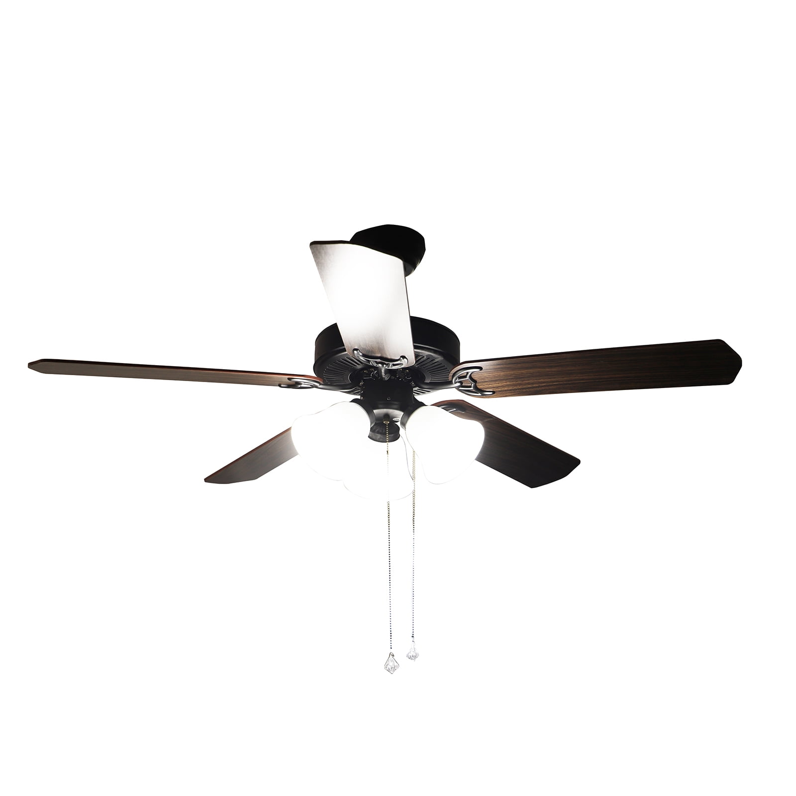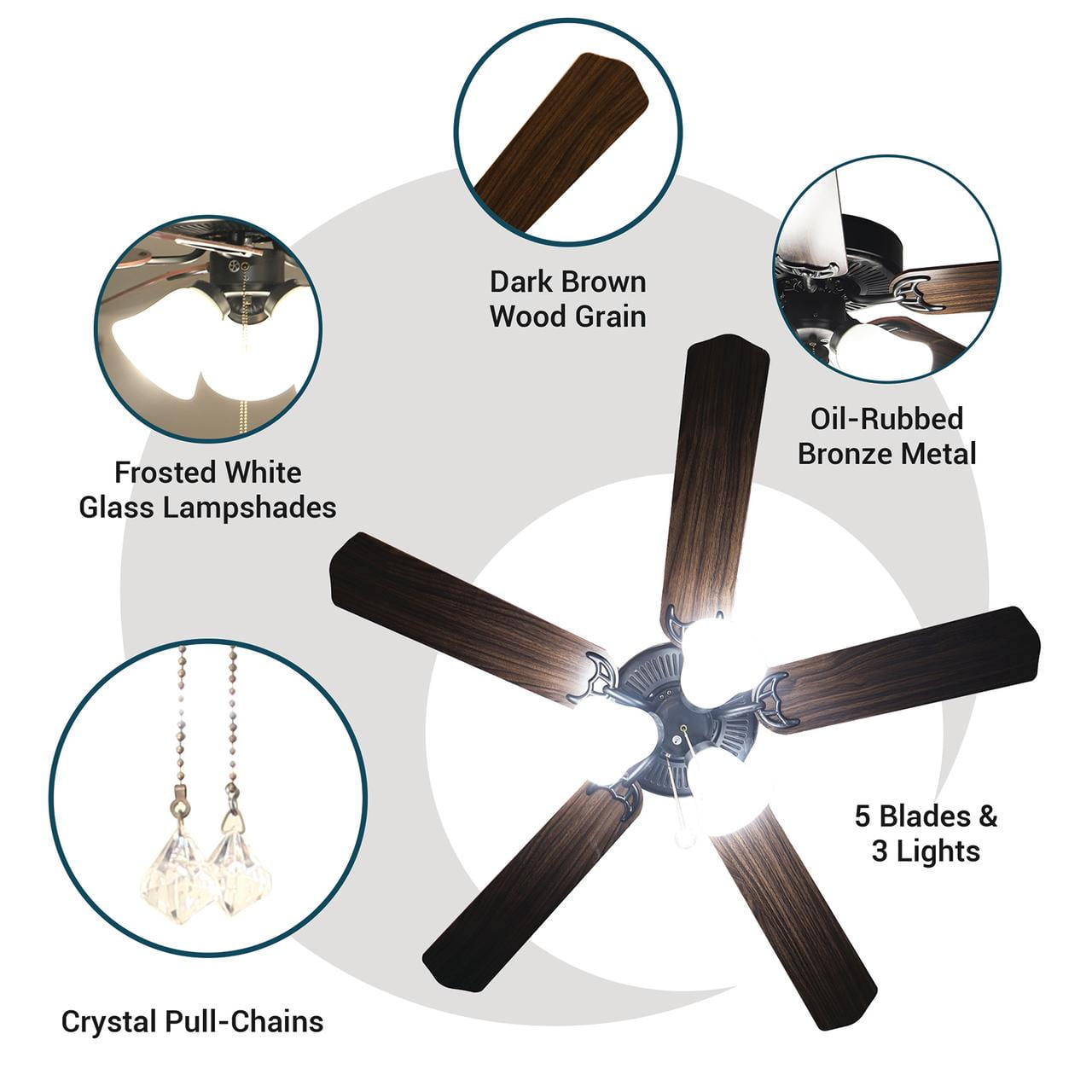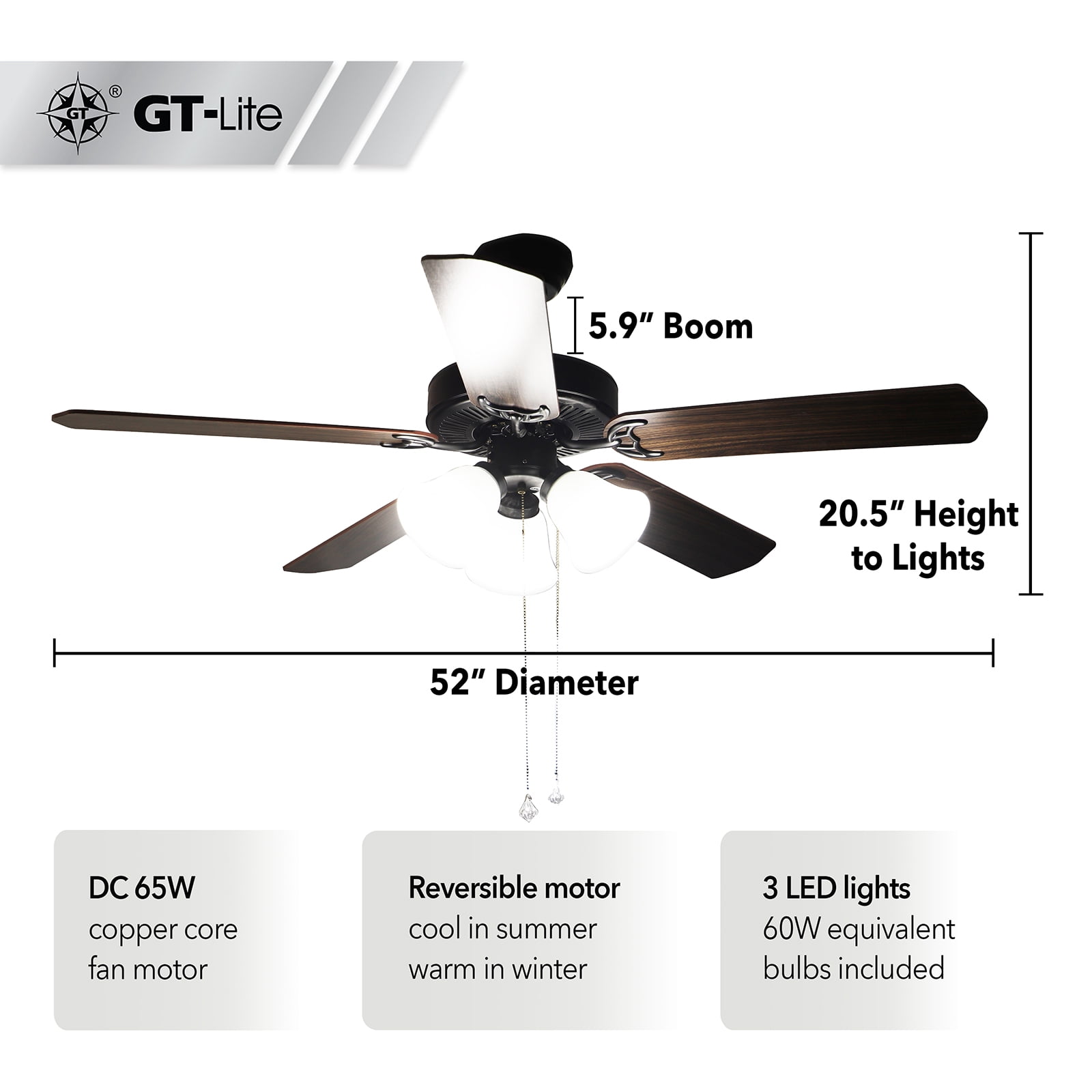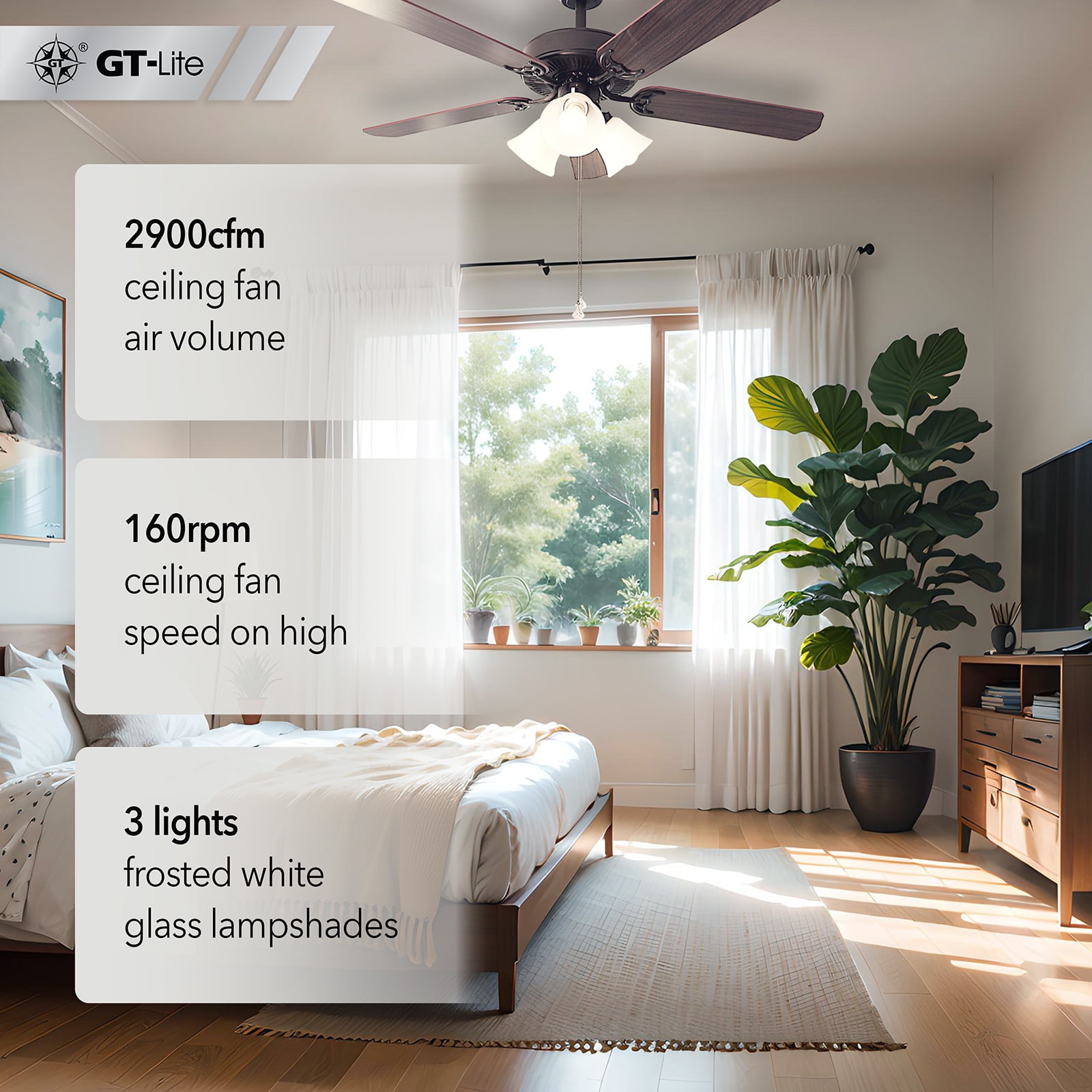 GT-Lite 52” 5-blade indoor ceiling fan with 3 lampshades and 3 fan speeds, brown woodgrain blades and oil-rubbed bronze Finish