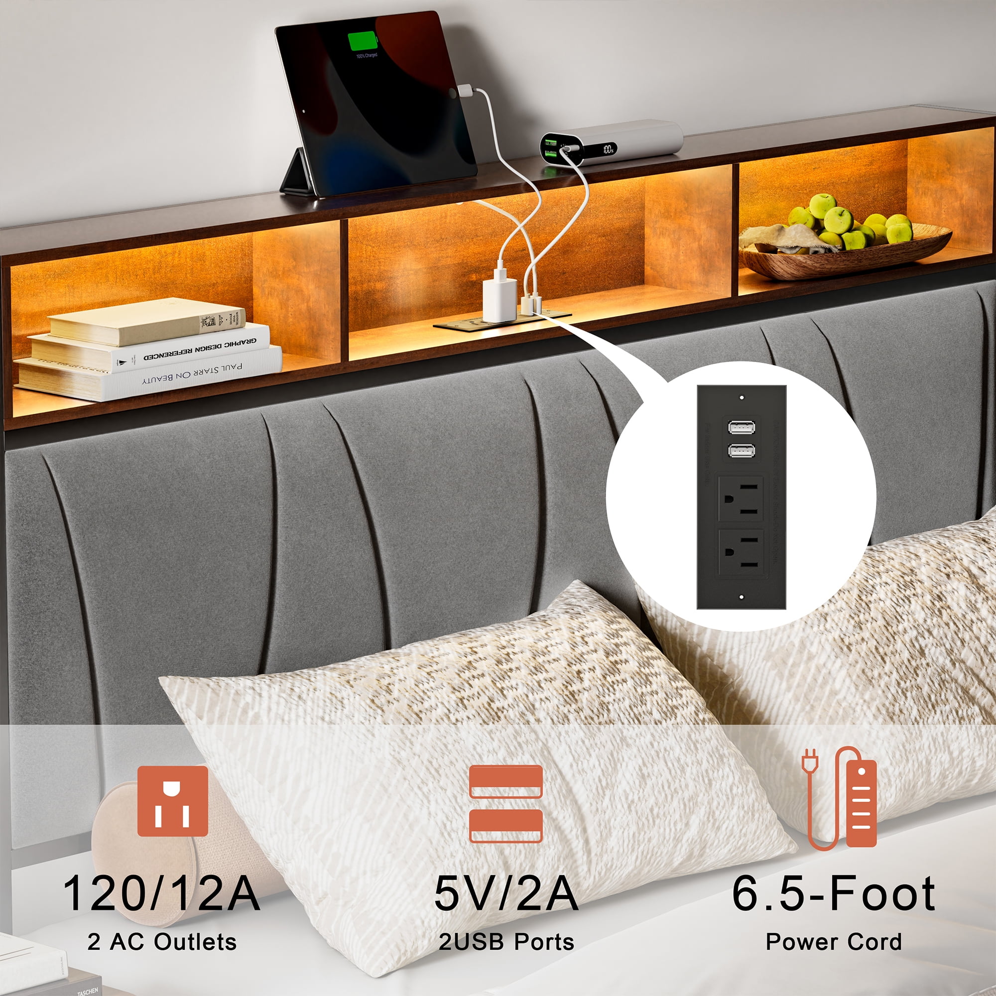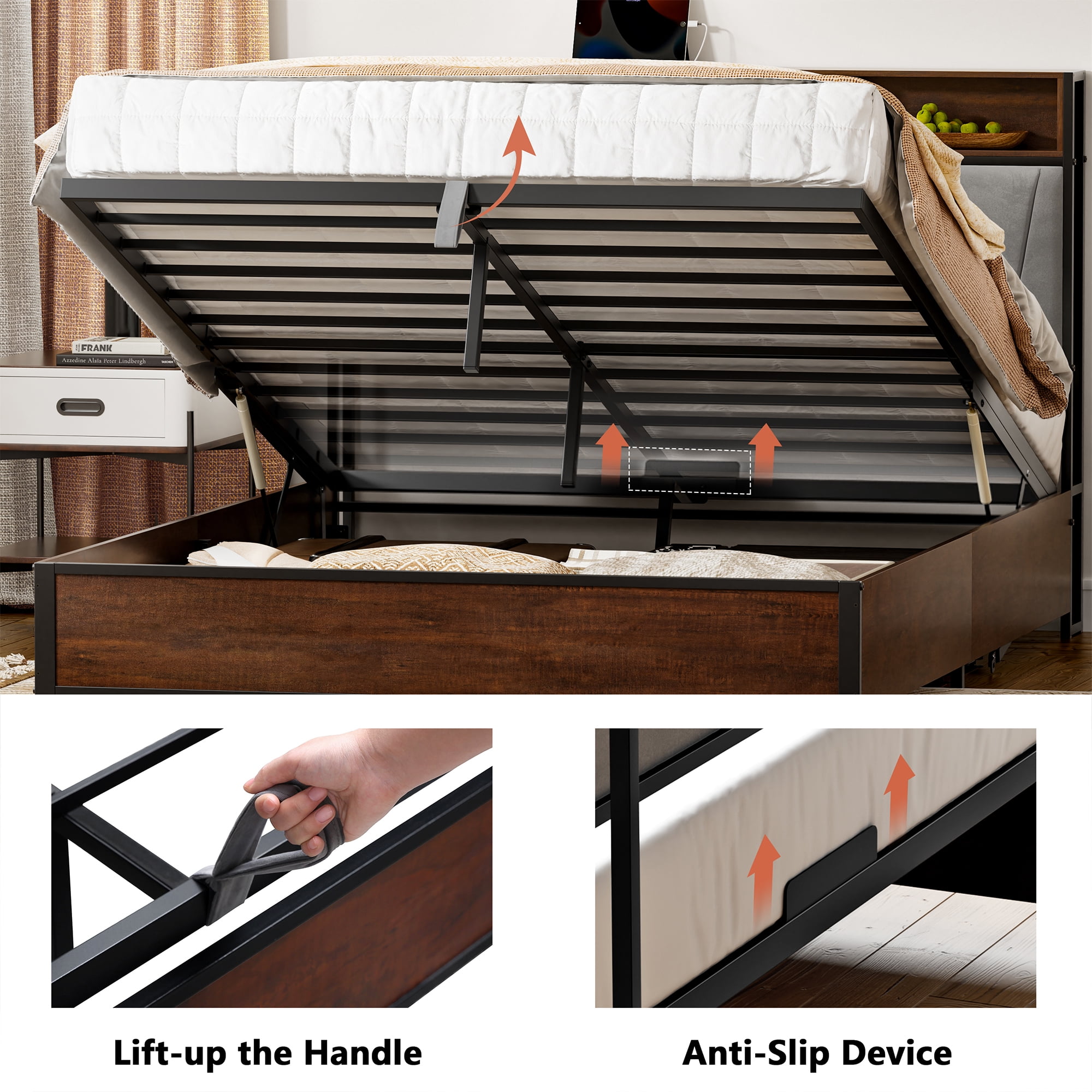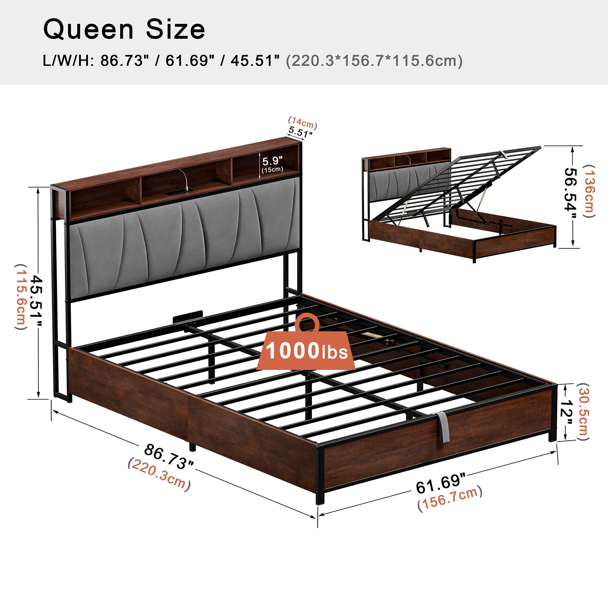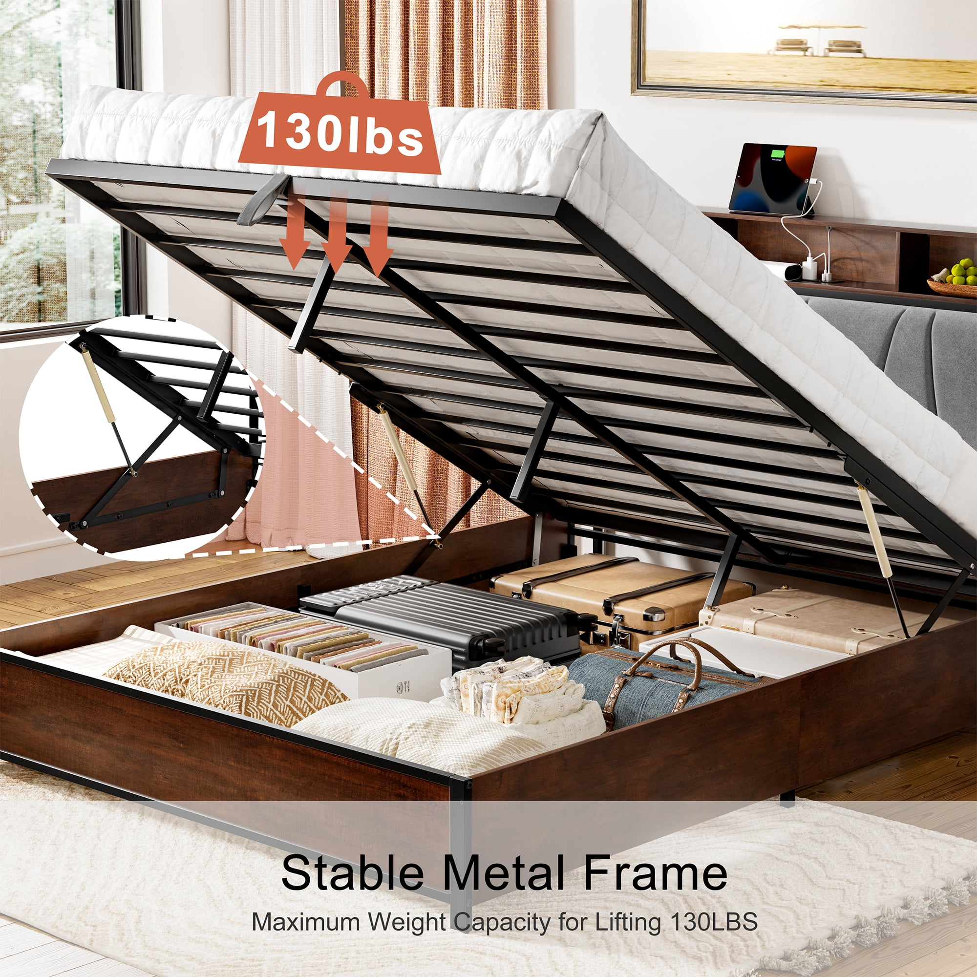 【Lift-up Storage Functionality】The lift-up storage feature is a game-changer for those in need of extra storage space. The hydraulic mechanism effortlessly lifts the mattress, revealing a spacious compartment underneath. This feature is perfect for storing bedding, seasonal clothing, or anything else you might want to keep out of sight. The mechanism is smooth and easy to operate, and it feels sturdy and reliable. 【Power Strip】A sturdy, well-designed bed including a storage headboard and power strip. With two outlets and two USB ports on the power strip, you can simply charge your phones or use it as a book light to read comfortably when reclining in bed. 【Elegant Headboard】The tufted headboard not only provides a stylish look but also ensures comfortable support for those late-night reading sessions.High wingback headboard adds elegant aesthetics to your bedroom. Horizontal channel pattern illuminates stylish and minimalist trends 【Sturdy Frame & Noise-Free】The platform bed frame can handle up to 1300 pounds and features a heavy-duty metal central bar, eight sturdy support legs, ten wood slat supports for improved weight distribution, and no springs for stability and noise reduction.The materials used are of high quality, and the overall construction feels robust and well-engineered. The frame is solid, and the upholstery is easy to clean and maintain. 【Easy to Assemble】Thanks to the comprehensive instructions provided and all necessary tools are included. Each part of the bed frame set is labeled and numbered for easy assembly, with clear step-by-step instructions Once assembled, it’s very stable and secure.