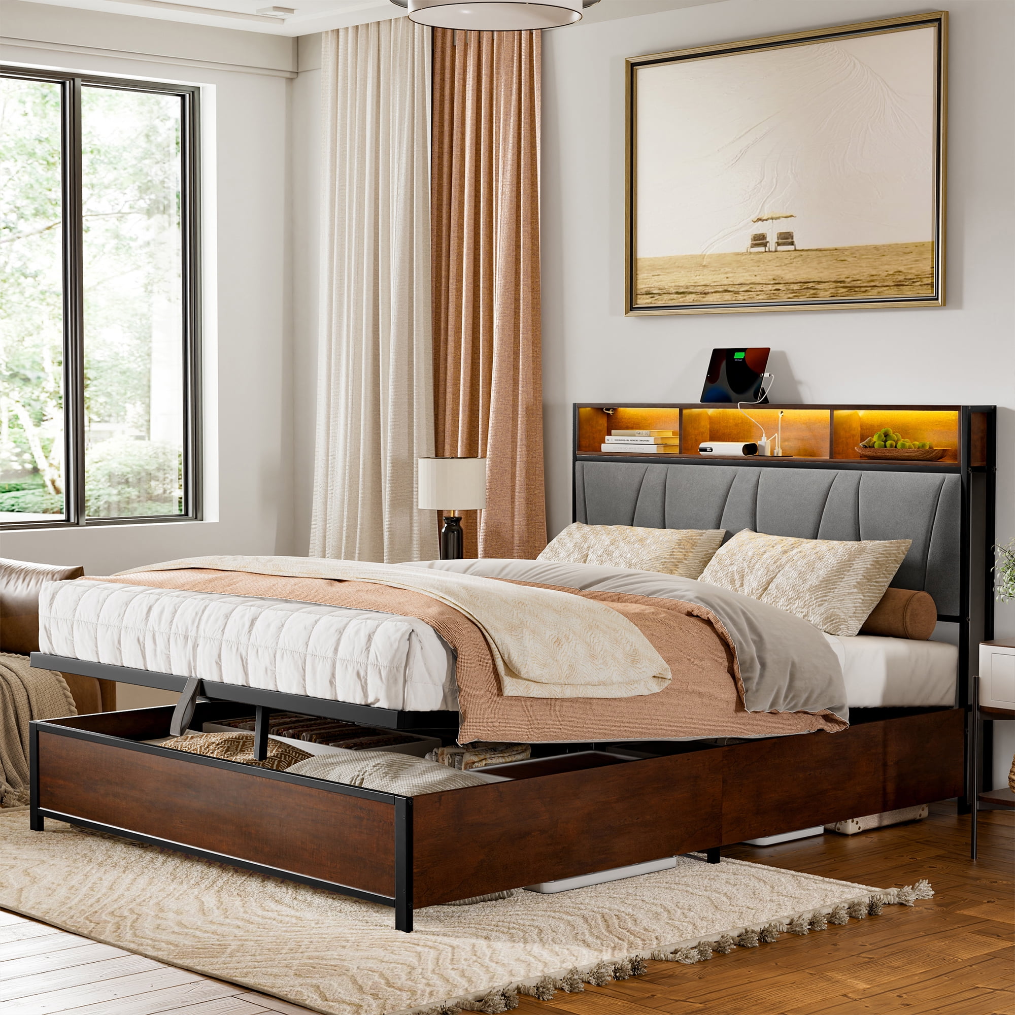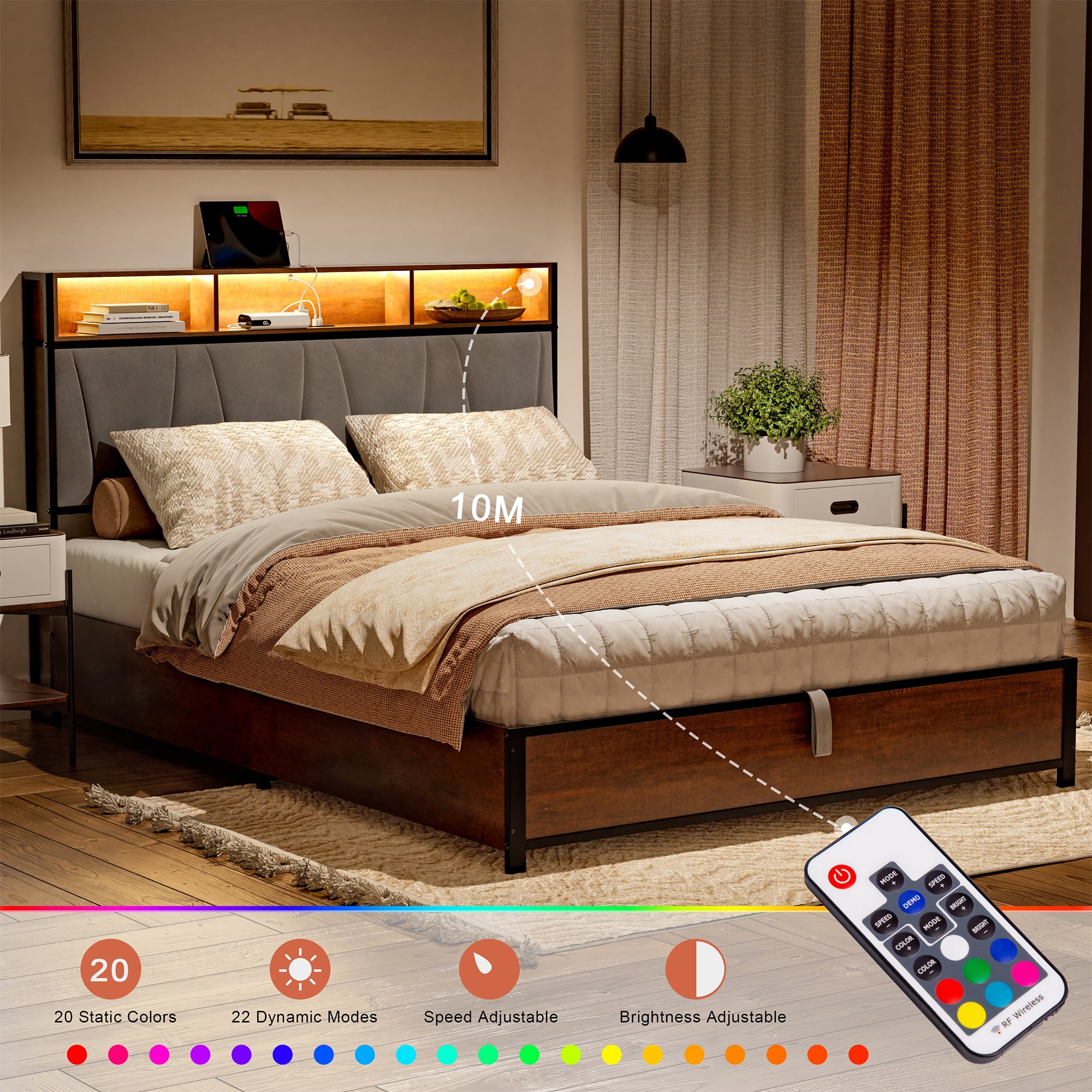 GUNAITO Queen Lift Up Bed Frame Storage Platform Bed with Wingback Headboard Upholstered Bed Frame with Charging Station & LED Lights