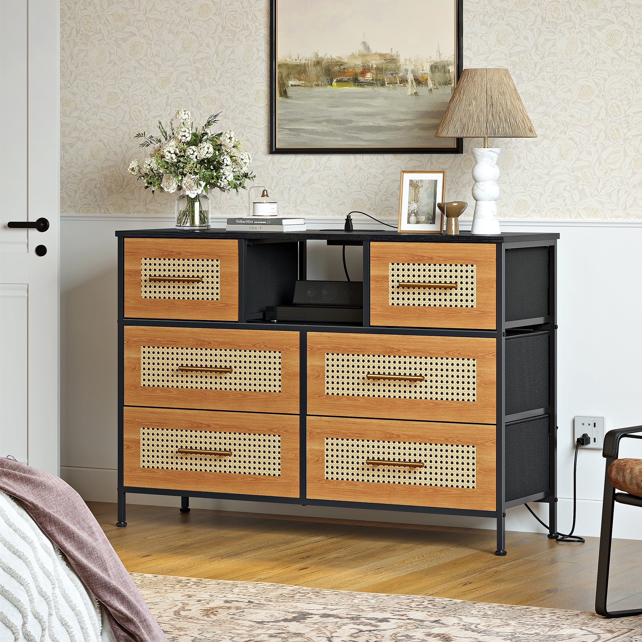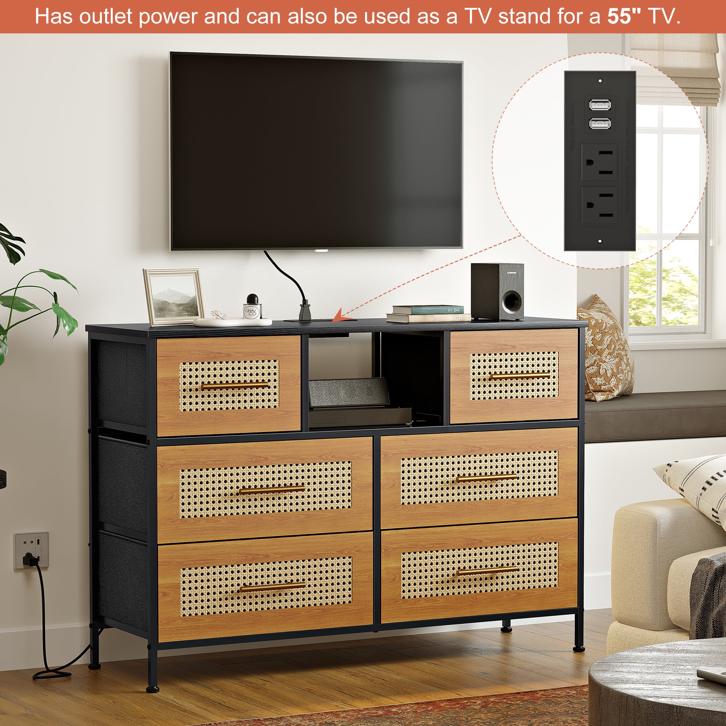 GUNAITO Rattan Dresser 6 Drawer Dressers for Bedroom with Power Outlet Fabric Chest of Drawer for Adult Boho Dresser TV Stand