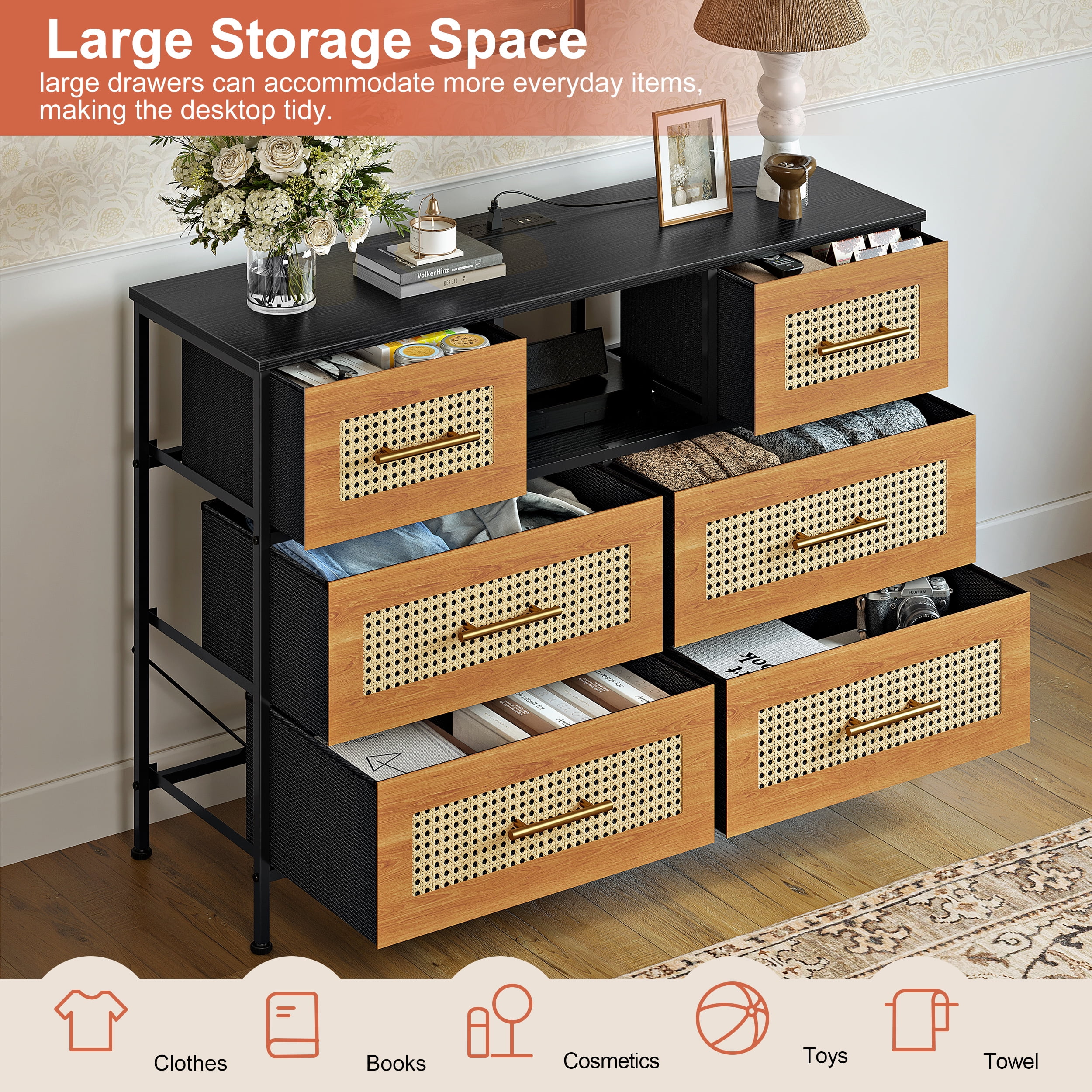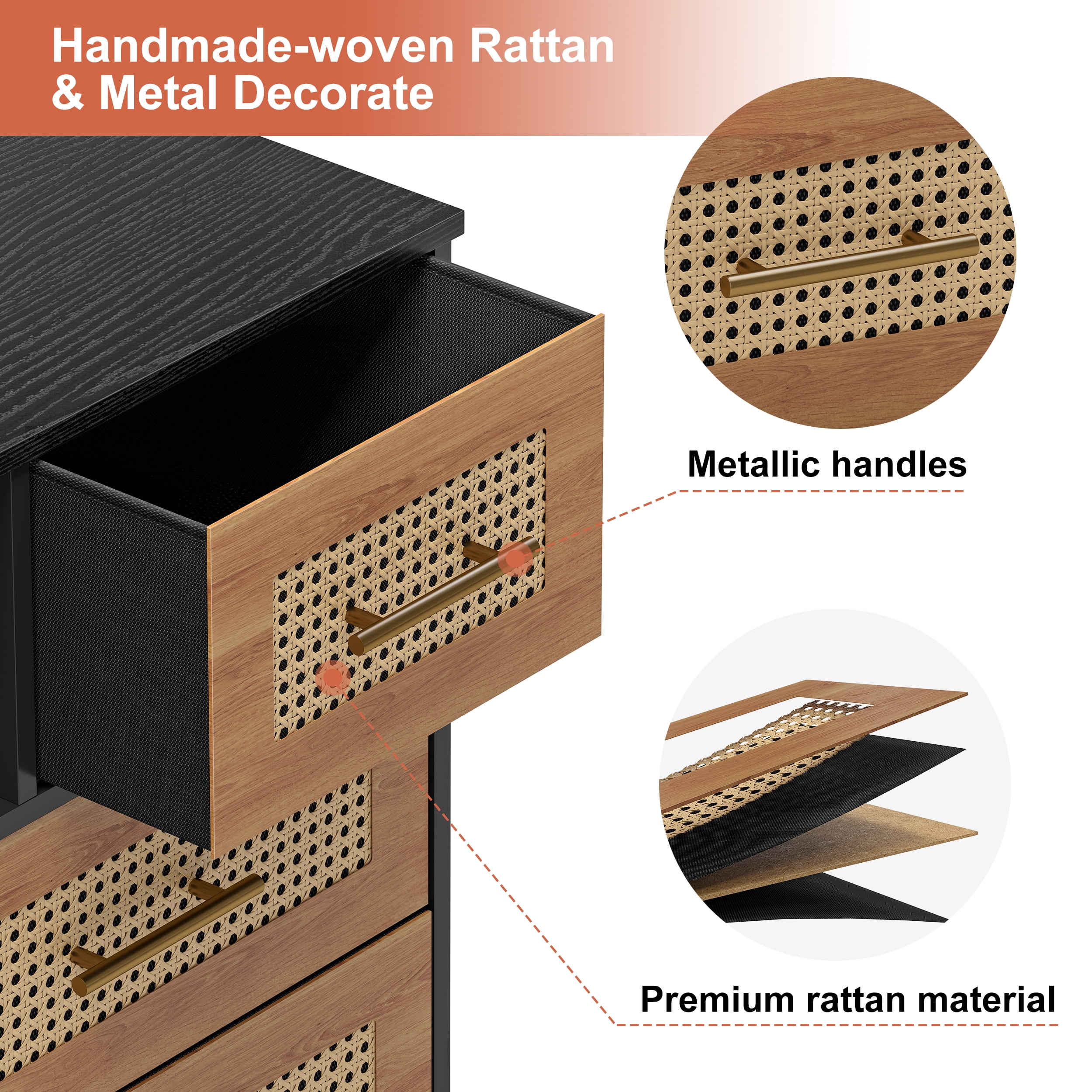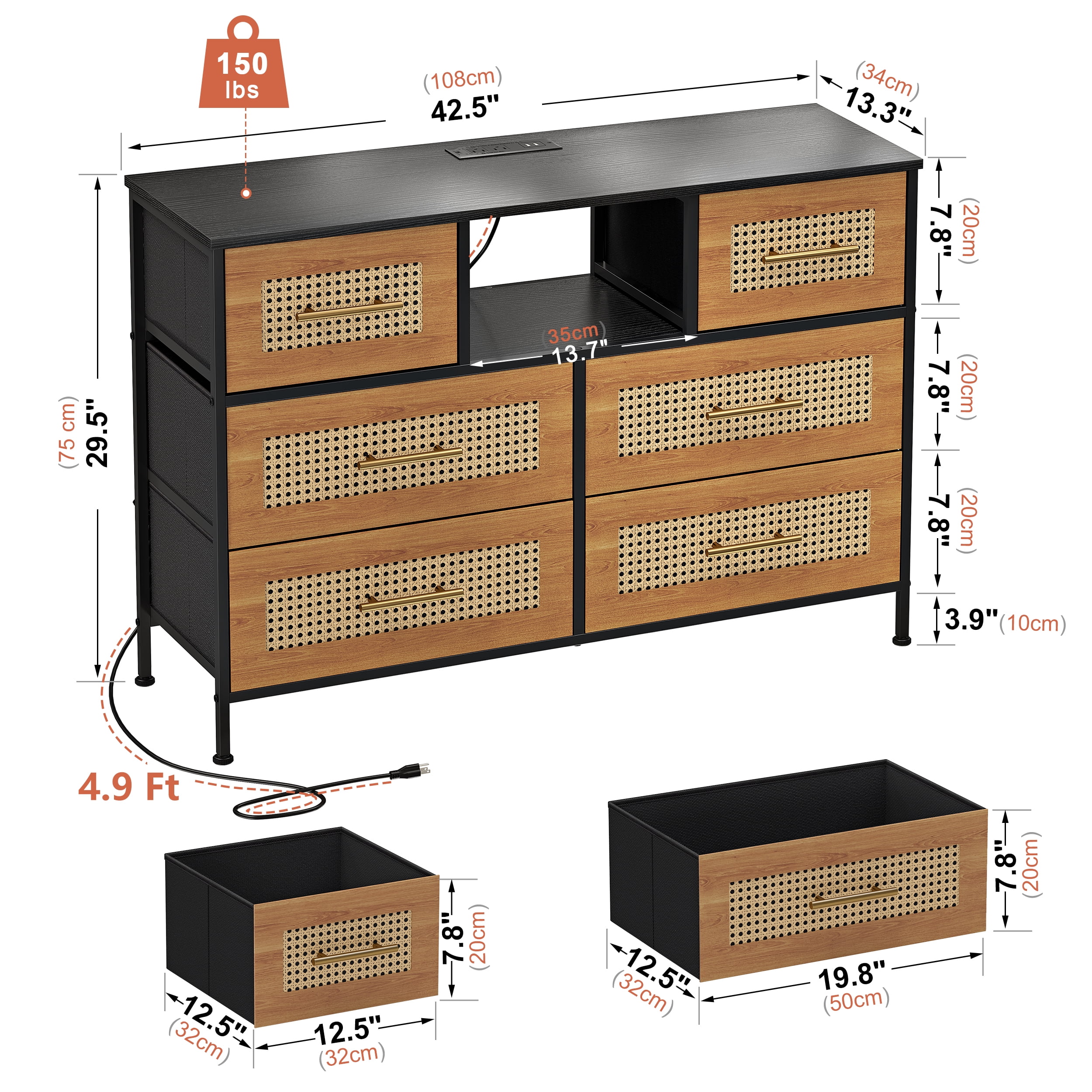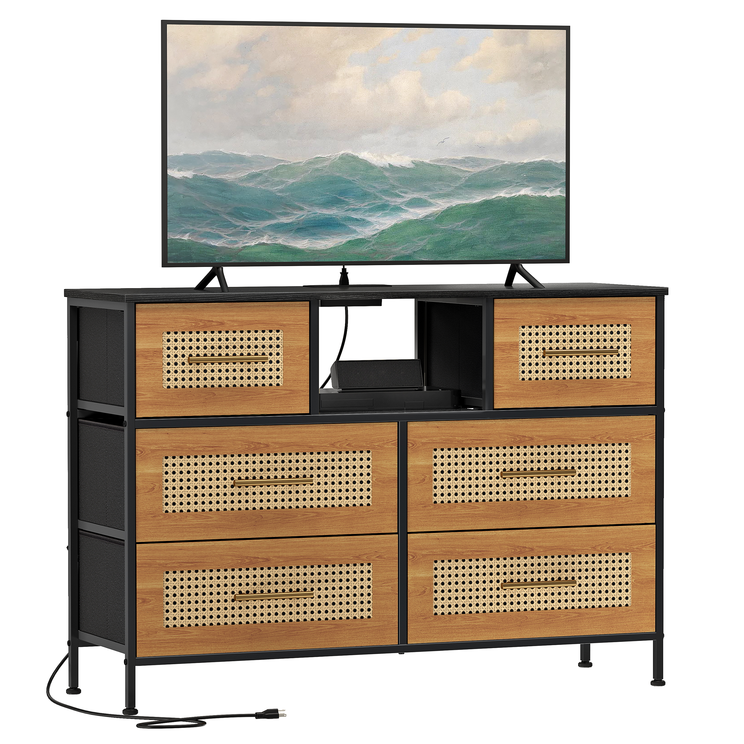 Convenient Charging Outlets. The top panel is configured with two charging outlets and two USB ports to provide convenient power for your lamp, stereo, electronic devices and more. Used As a TV Stand. The dresser is sturdy and smooth, with a wide top panel that can hold up to 150 pounds and can hold a 55″ TV. The center shelf can hold a stereo, game console and more. Handcrafted Rattan Weave. The drawer finishes are hand-woven with MDF and rattan to absorb heat and breathe in elegant style. High Quality Material. The top panel is made of thickened MDF, and the frame is made of solid steel with a matte coating that prevents the iron frame from rusting and increases its service life. Large Capacity Drawer. With folding function, it can also be used as an organizer basket to store clothes, small odds and ends, books and other items. Applicable To A Variety of Scenes. Bohemian style, rustic style, suitable for bedroom, living room, study, office and other places. Anti-tipping Setting. With the wall-mounted device, the safety factor is higher, which can protect you and your family’s safety. Adjustable Feet Design. The feet can be adjusted to keep smooth on uneven ground. It won’t scratch the ground when you move it. Easy To Assemble. One person can complete the installation in only 30 minutes. Instructions are included in the box. After-sales Service. We provide 24/7 after-sales service, if the product you receive is damaged or has other problems, please feel free to contact us for solution.