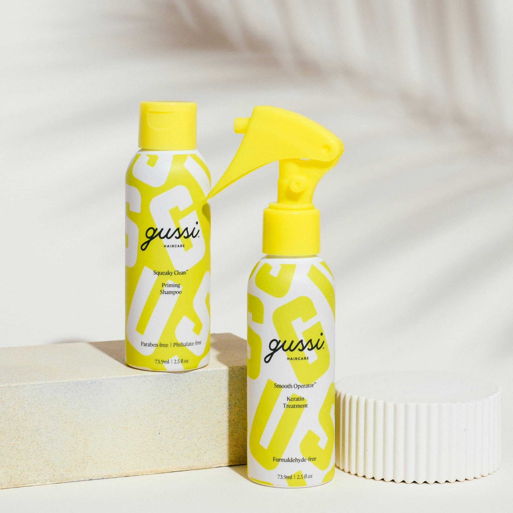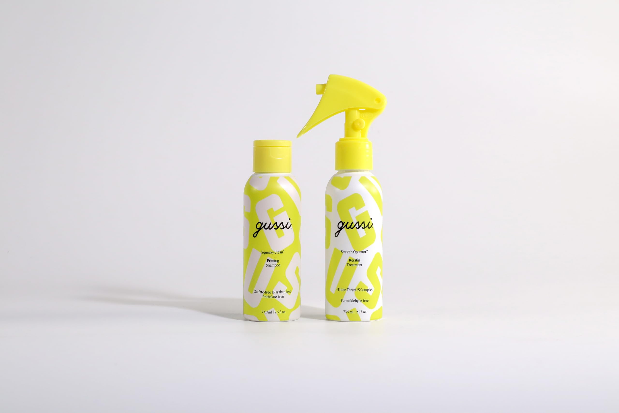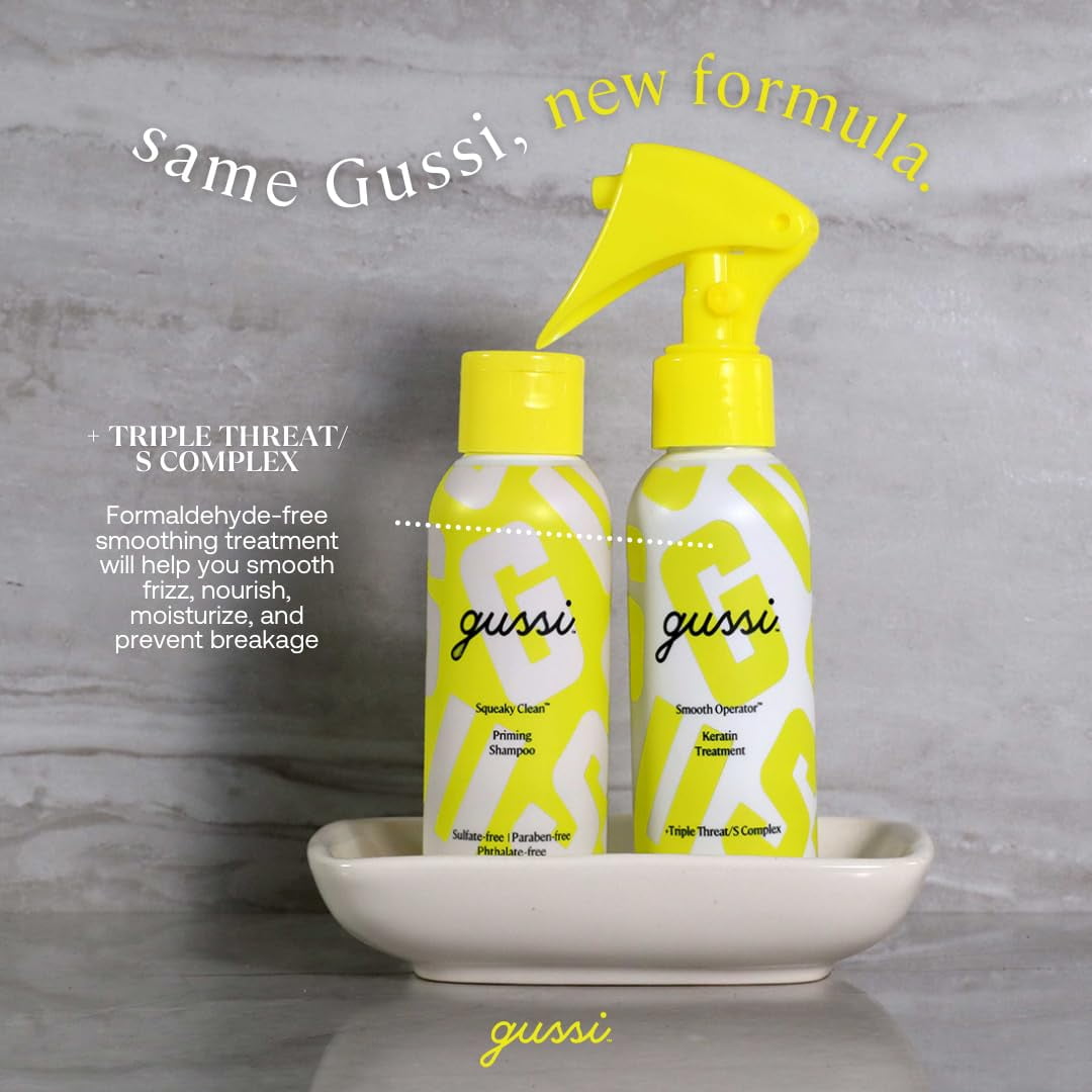 100% formaldehyde-free at-home keratin treatment that smooths and strengthens hair, increases shine, and removes frizz in only 20 minutes. Includes Squeaky Clean Priming Shampoo to clarify and prep your hair for the treatment and Smooth Operator Keratin Treatment for smooth, frizz-free hair that lasts 6 weeks. If your hair is shoulder-length or longer, thick or coarse, you should use all of the treatment provided. If you’ve have shorter, finer hair, you may be able to get two uses out of the kit. Keratin at-home treatment kit for smooth, frizz-free hair. Say hello to major hair goals with frizz-free hair for up to six weeks! Easy, at-home, and done in about an hour from start to finish. Smooth frizz Deeply nourish & moisturize Add strength & rebuild elasticity Repair split ends Reveal silky, reflective shine Cut blow-dry time by ~30% Start with Squeaky Clean™ Priming Shampoo to clarify and prep your hair for treatment. Apply Smooth Operator™ Keratin Treatment and let it process for 15-20 minutes before rinsing off. Activate the frizz-fighting power by blow drying then flat ironing – the heat locks in the smooth. Style however you like: immediately following treatment you’re free to wash, color, braid, curl your hair and even work out – whatever your hair desires. It’s safe, clean and super easy, promise. For all hair types. Results may vary slightly based on hair texture, coarseness, porosity, and overall hair condition. Color-safe. For best results, Gussi up prior to coloring hair. If you recently colored your hair, wait at least three washes before applying Gussi. Keep those curls – if you want! Gussi will not break the bonds of your hair, so your natural texture remains with a smoother, more manageable, elongated pattern for the duration of the treatment. PETA-CERTIFIED CRUELTY-FREE , CLEAN , MADE IN USA. Safe for all hair types and colored hair.