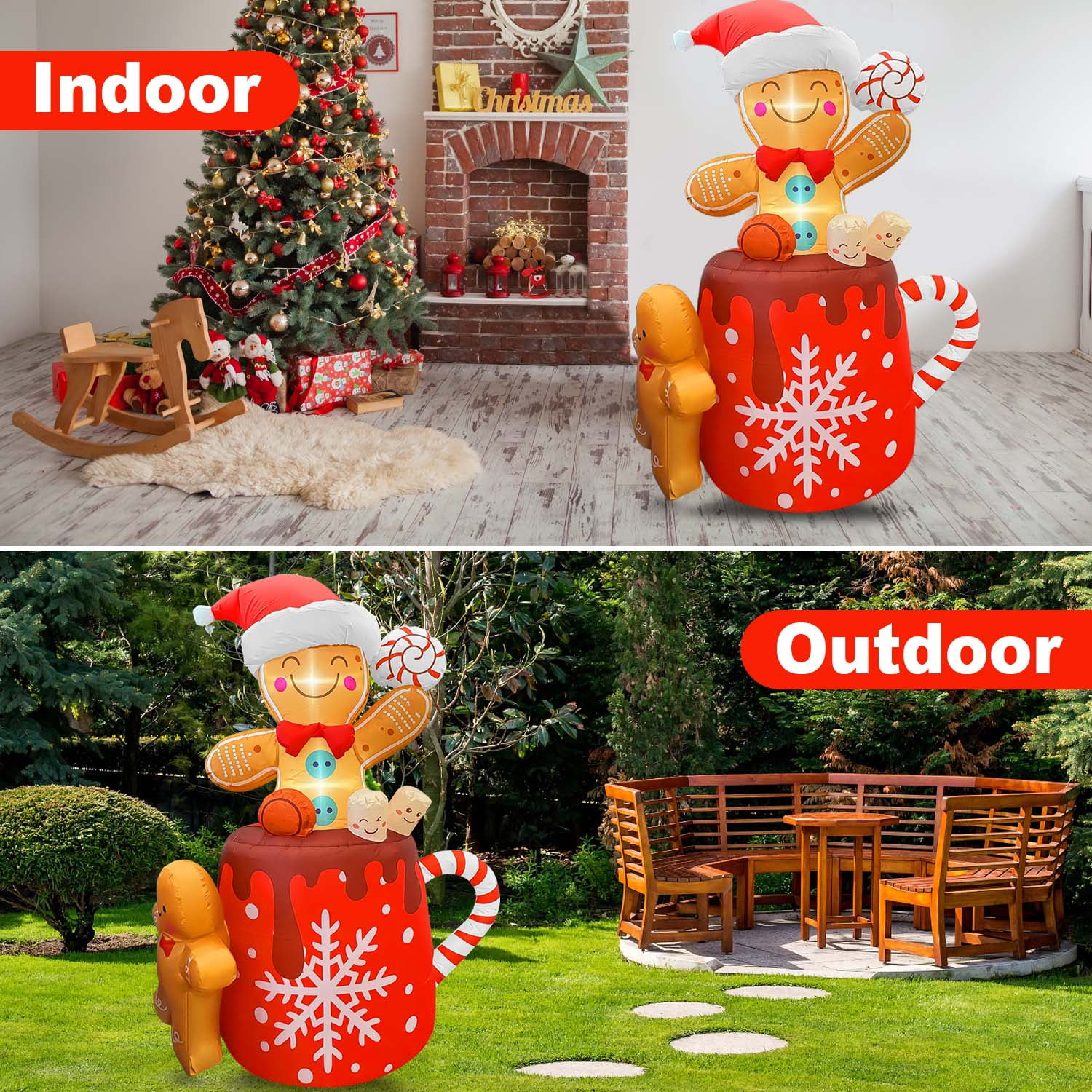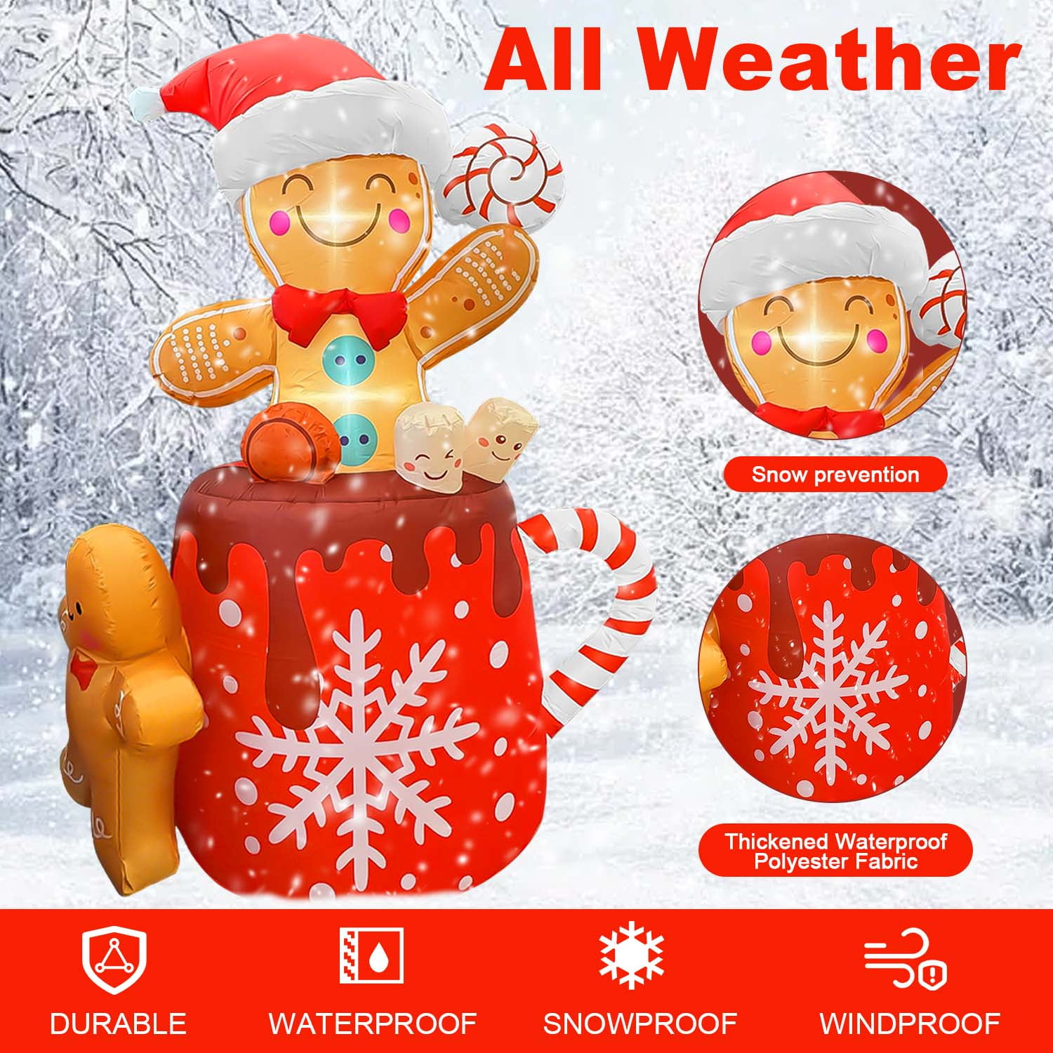 Eye-Catching Design: Make your Christmas decor more enjoyable with GVDV 6-foot-tall giant gingerbread man inflatable. It’s a guaranteed hit that will add charm and create a festive atmosphere, perfect for both indoor and outdoor settings. Premium Quality: Crafted from high-quality, rip-resistant, and waterproof 210T polyester, our Christmas inflatable is designed to withstand snow and resist fading. Its durable construction and vibrant color ensure lasting use year after year. Easy Installation: Setting up this Christmas gingerbread man is quick and effortless. Simply unpack, zip up the rear, plug it in, and watch it inflate in just 1 minute. Don’t forget to zip up the bottom zipper closely before inflation and keep it standing while blowing for fully inflating. Safe and Secure: Equipped with a built-in brushless IP68 air blower, our gingerbread decoration is safe and reliable for worry-free installation. After holiday, it stores easily and compactly, requiring minimal space. Versatile Decoration: Ideal for any holiday celebration, our Gingerbread Man Inflatable withstands any weather and stays secure with included ground stakes and tethers. Enjoy this fun decoration in your yard, backyard, or any indoor/outdoor space—it’s perfect for both kids and adults. Specifications: Material: Polyester Size: 6 ft in height Shape: Gingerbread Man In Hot Cocoa Condition: Brand New