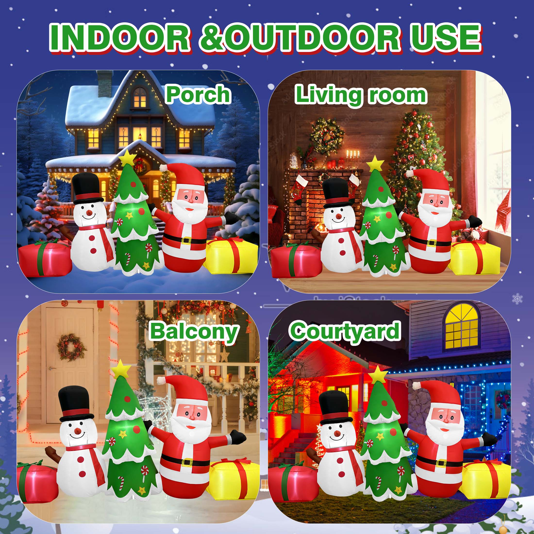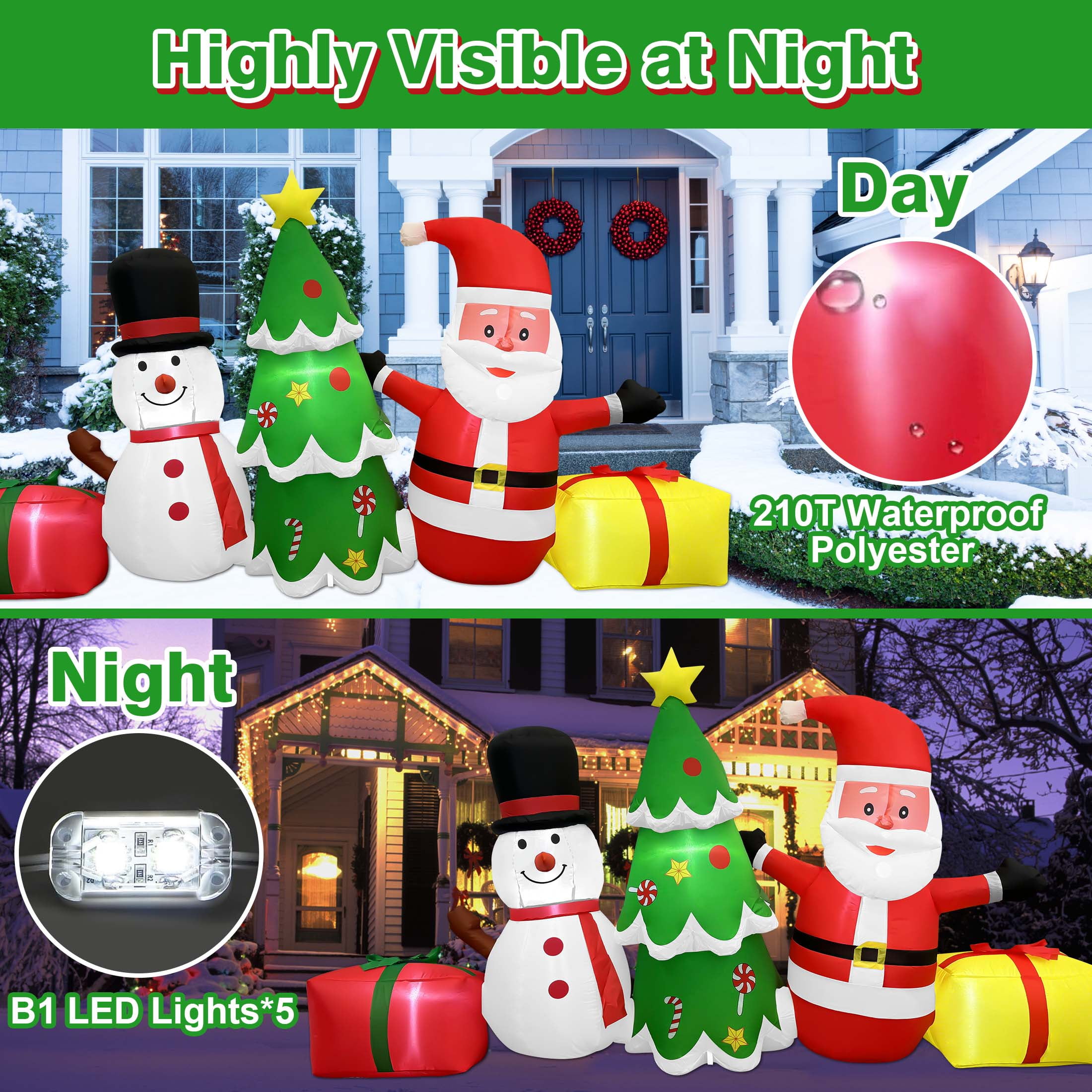 Vibrant and Eye-Catching: Standing at an impressive 6 feet tall, this inflatable decoration is sure to catch the attention of neighbors and passersby. The bright and colorful design features beloved holiday characters that add a touch of whimsy and cheer to your outdoor decor. Durable and Weather-Resistant: Made from high-quality 210D polyester fabric, these inflatables are designed to withstand various weather conditions, ensuring they remain looking great throughout the holiday season. Built-in LED Lights: The inflatables come with 5 built-in white LED lights that illuminate the characters, making them visible and festive even at night. These lights enhance the overall aesthetic and create a warm, inviting glow. Easy Setup and Secure Installation: The package includes 4 ground stakes, 4 ropes, and 4 sandbags to ensure the inflatables stay securely in place. The included blower and adaptor make inflation quick and hassle-free, allowing you to set up your decorations in no time. Versatile Use: Ideal for various outdoor spaces such as lawns, gardens, and yards, these inflatables are also perfect for holiday parties and events. They create a fun and festive atmosphere wherever they are placed. Convenient Storage: After the holiday season, the inflatables can be easily deflated and stored compactly until next year. The lightweight design and included manual make both setup and storage straightforward and convenient.
