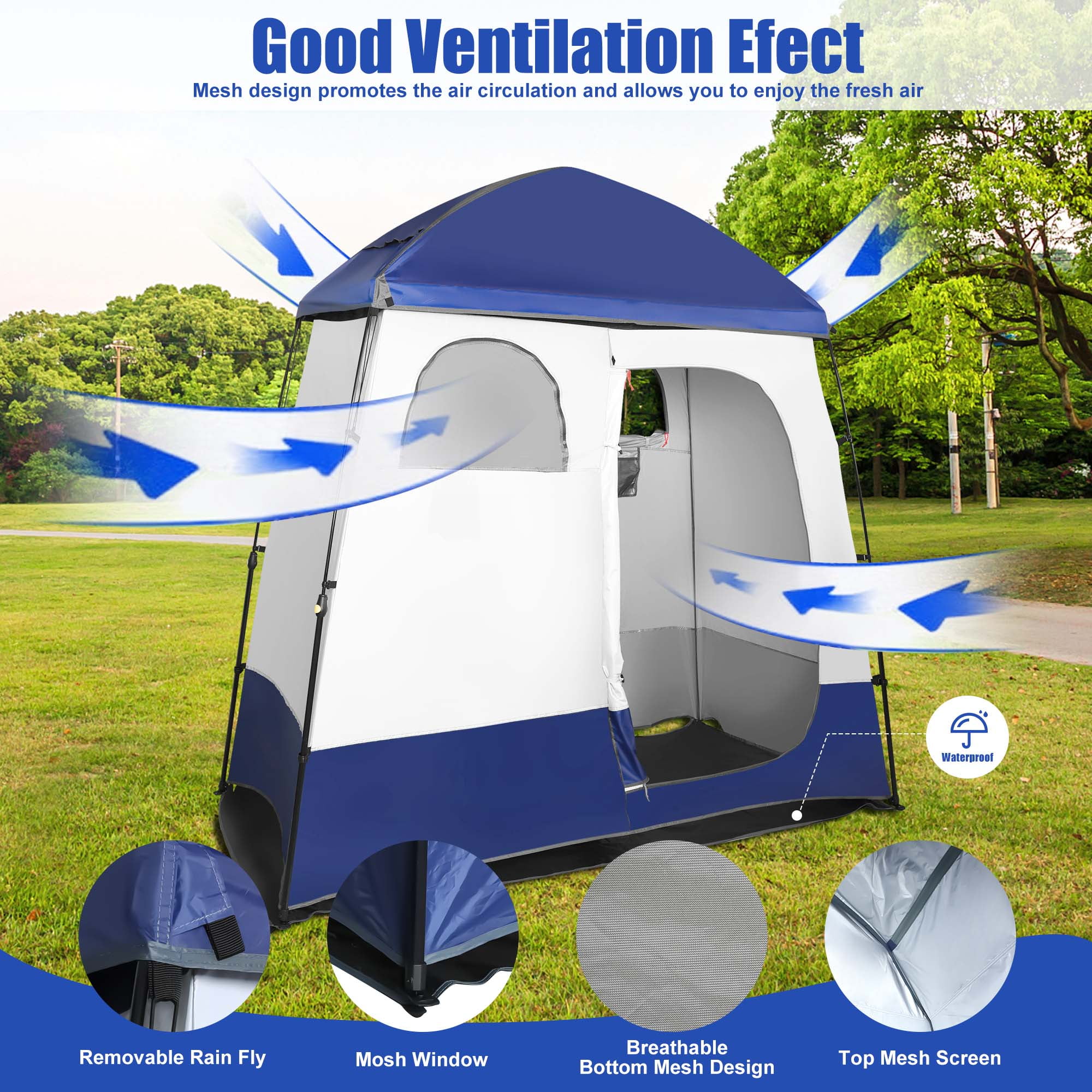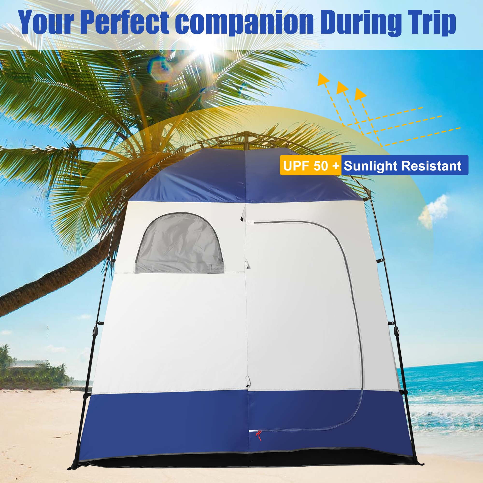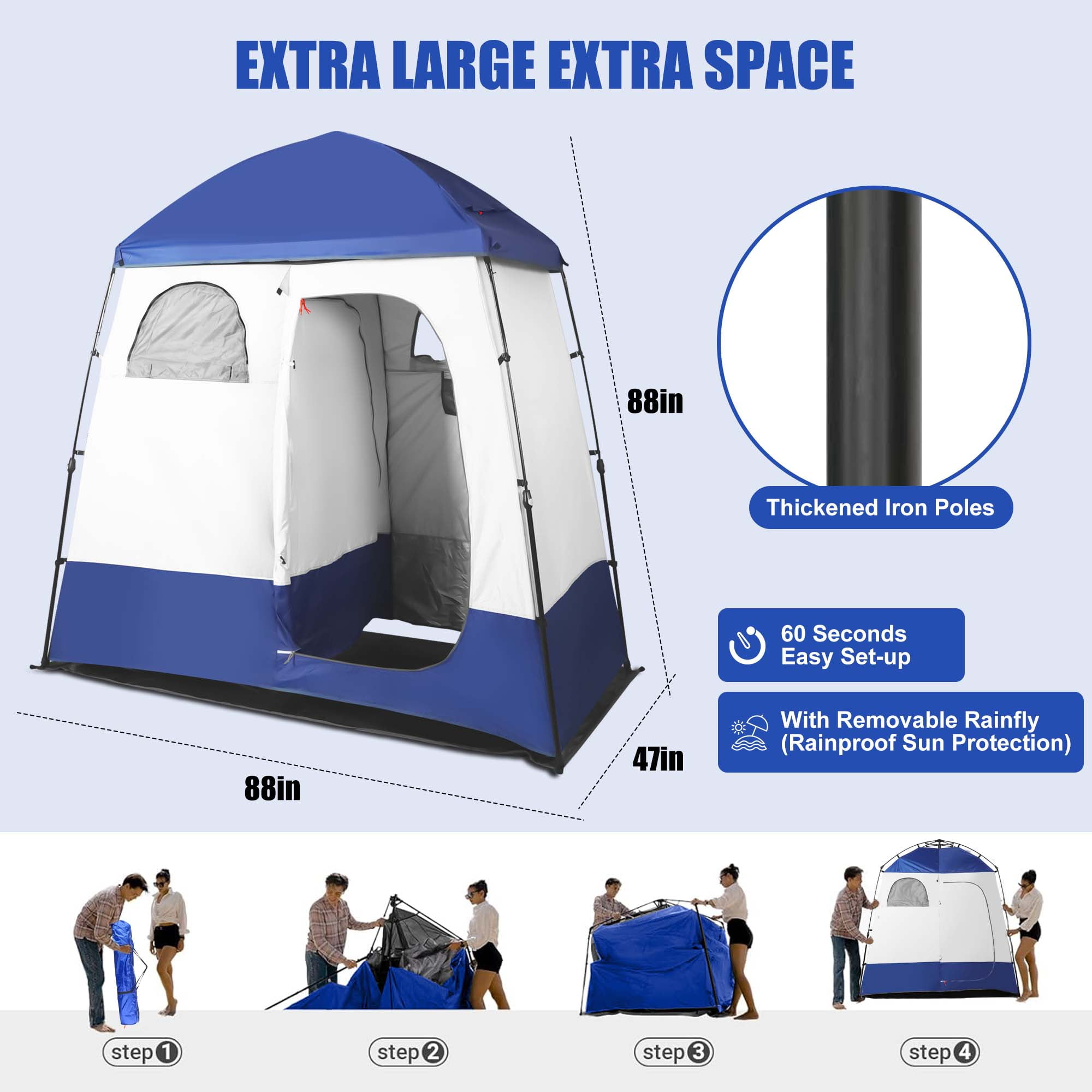 Easy Set Up: The camping shower tent features pole clips that quickly snap over the poles for hassle-free assembly. It includes 4 steel poles, 5 fiberglass poles, 4 guy ropes, and 10 steel nails for secure outdoor use Large Space: Oversized 2-room design measuring 87” × 47” × 87” provides ample room for two adults. Packaged size is 42.5” × 6.6” × 6.6”, weighing only 11.46 lbs for easy transport in an Oxford compression bag Privacy Protection: Made from silver-plated 150D Oxford cloth, this tent ensures complete privacy while changing, showering, or using the toilet. Reflects sunlight to block up to 98% of harmful UV rays, protecting users from sunburn User-Friendly Design: Features a 120g wear-resistant PE floor mat for convenient water drainage. The 190T polyester with an anti-glare silver coating provides shade and light rain resistance. Includes a large zippered entry door, mesh roof, and side windows for ventilation Multipurpose Use: Equipped with 2 inside pockets and 4 compartments for small items, plus straps for hanging clothes and towels. Suitable for use as a changing room, camp restroom, shower storage, portable toilet tent, or privacy tent