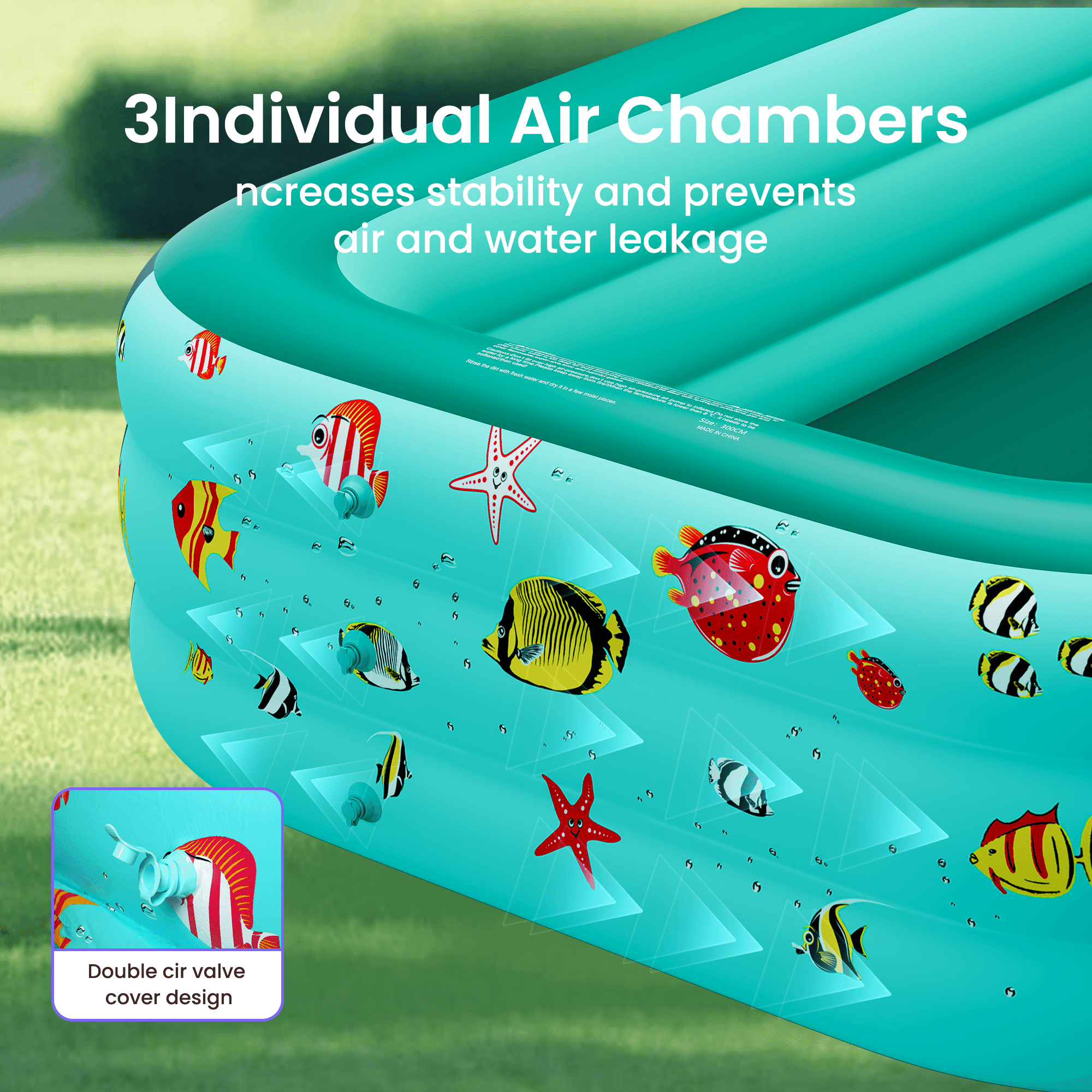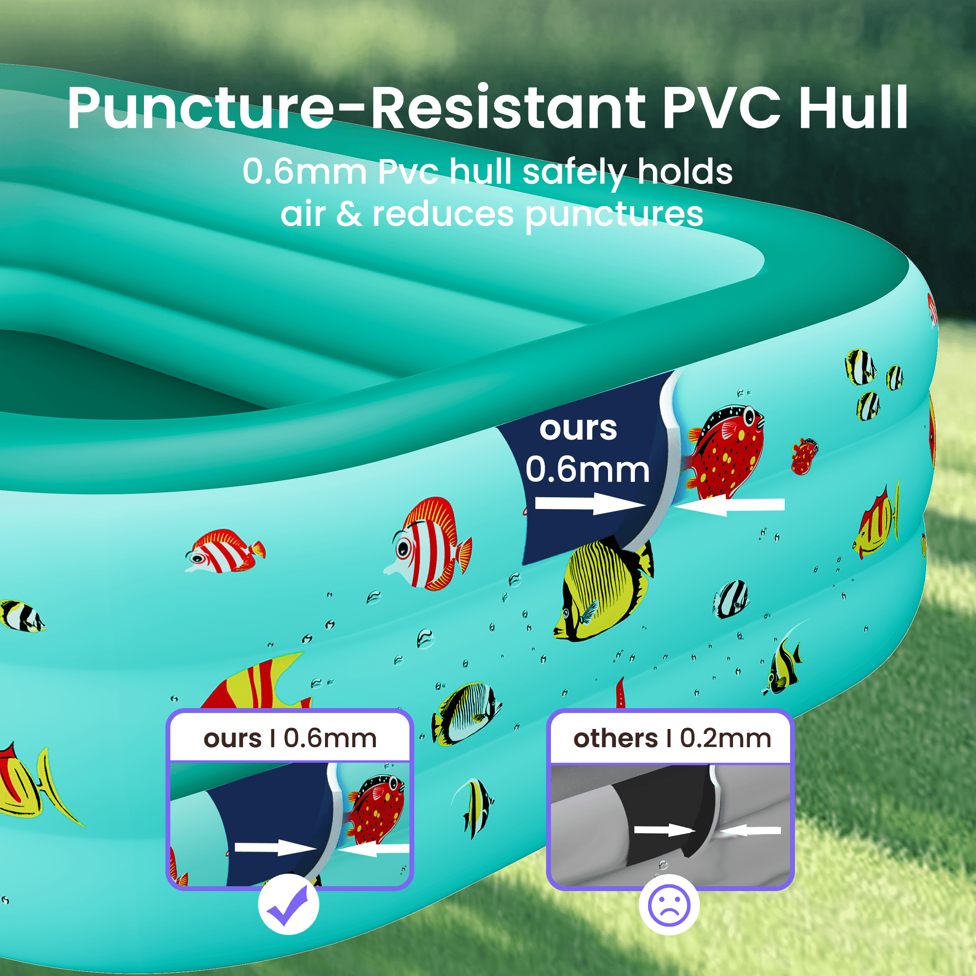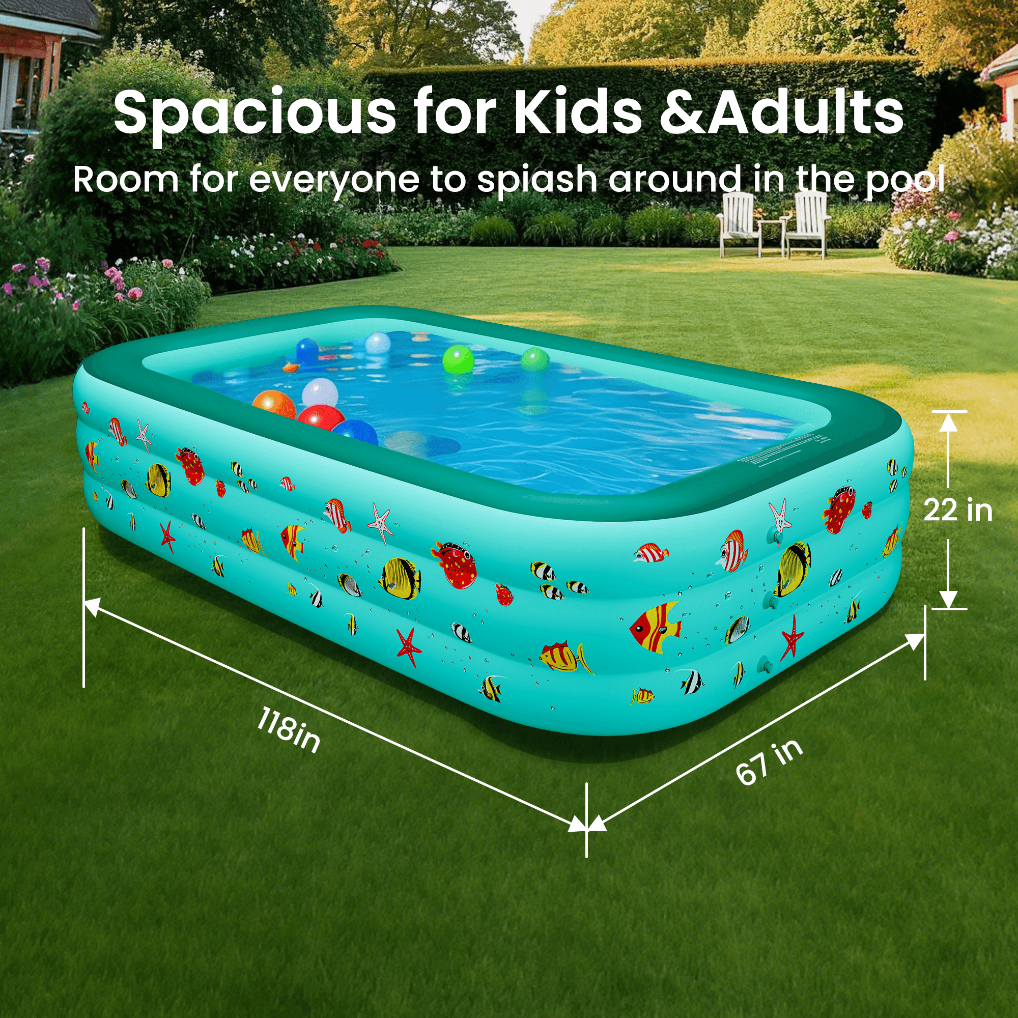 ???? [ Family-size Inflatable Pool ] With 118″ X 67″ X 22″ size, GVDV wimming pool with 312 gal water capacity can hold up to 2 adults plus 3-5 kids(Age 3+) to enjoy a splashing pool party in the backyard.This inflatable pool would be a great entertainment for your kids, pet dogs and family. ???? [ Safe & Durable Retangular Inflatable Pool ] GVDV swimming pool for kids is made with Phthalate and lead free, Using BPA-free materials that meets the standards of international children’s toys, which is twice thicker than most in the market, reducing the risk of punctures and ensuring a long service life. ???? [ Quick and Easy to Use ] The family inflatable pool is easy to set up, you just need to simply spread out on the ground level.The inflatable pool can be inflated in 3-4 minutes by electric pump (not included), built-in 2 curve water valves double the drainage speed. ???? [ Sturdy &Stable Pools for Backyard ] Comes with 3 individual air chamber each with double intake and free flow exhaust valve , the swimming pool for adults can withstand extra weight while preventing air leakage. 90° vertical drainpipe of inflatable swimming pool can facilitate the outflow of water, tidying inflatable pool up is no longer an issue. ???? [ Best Summer Gift, Swimming Pool and Ball Pit ] GVDV inflatable pool is a great gift for your kids, families, pet dogs and friends. They could not only enjoy the hot summer day time with our inflatable pool in the backyard,but also it would be used as the ball pit indoor when the weather is cool.