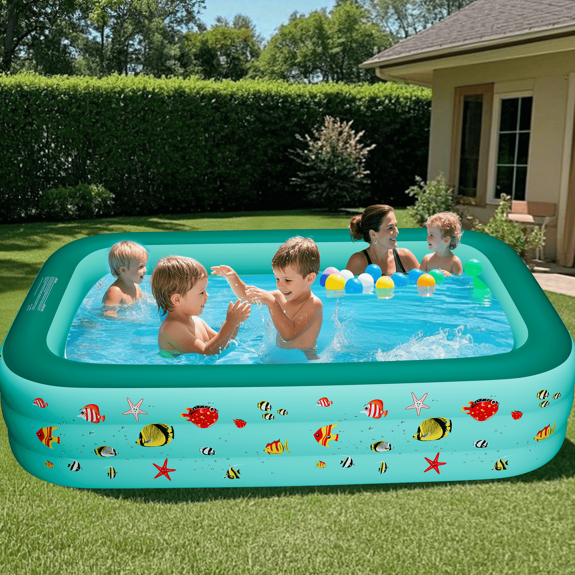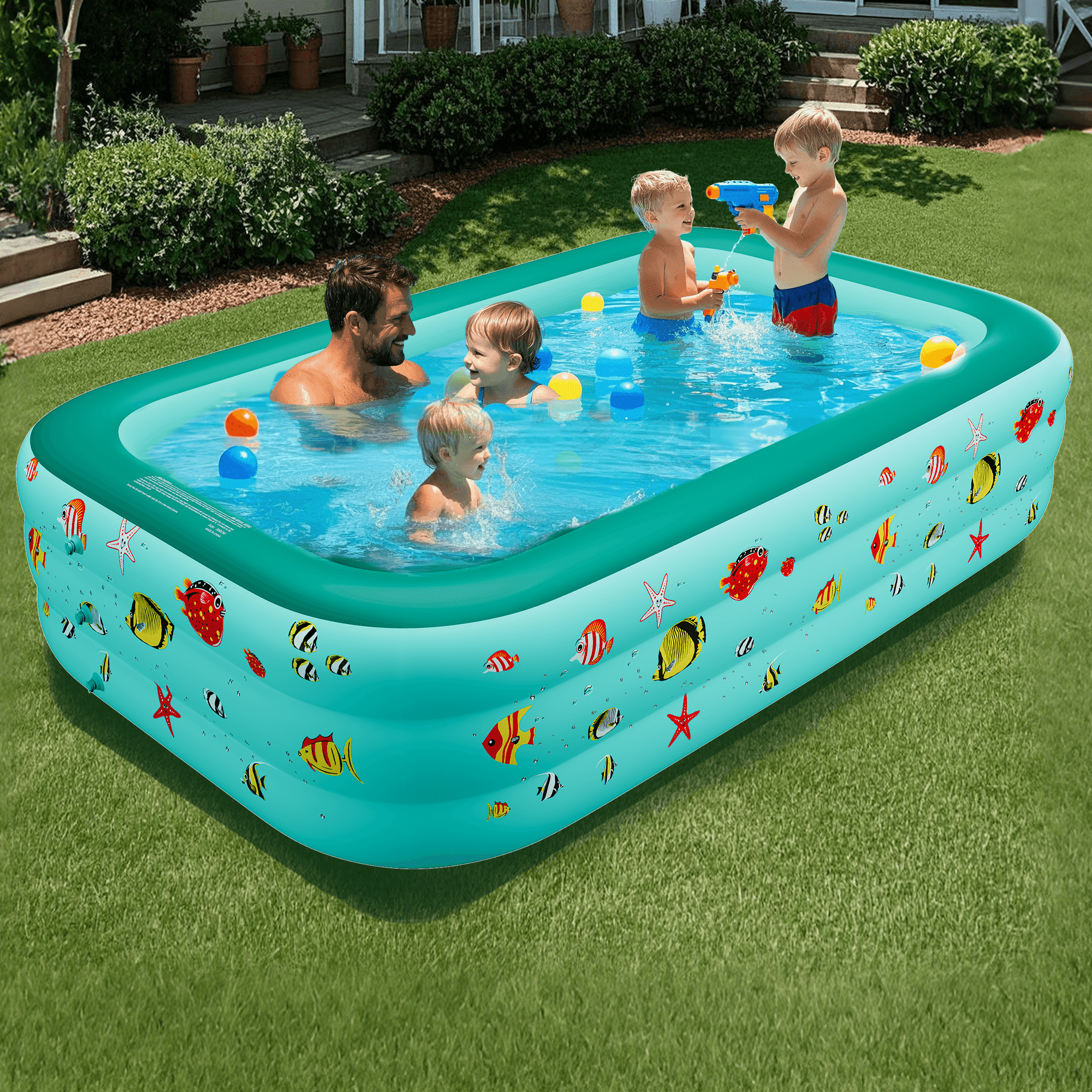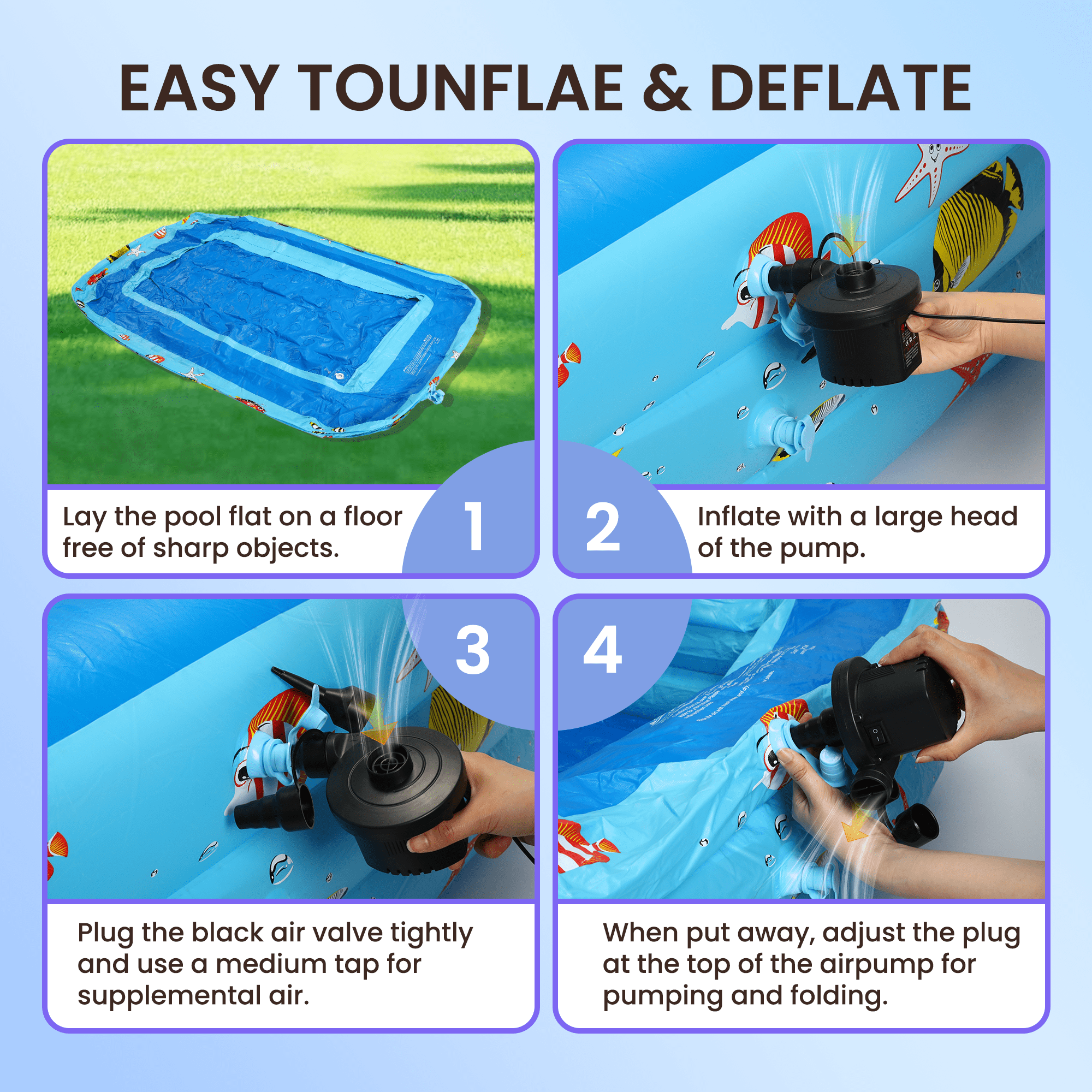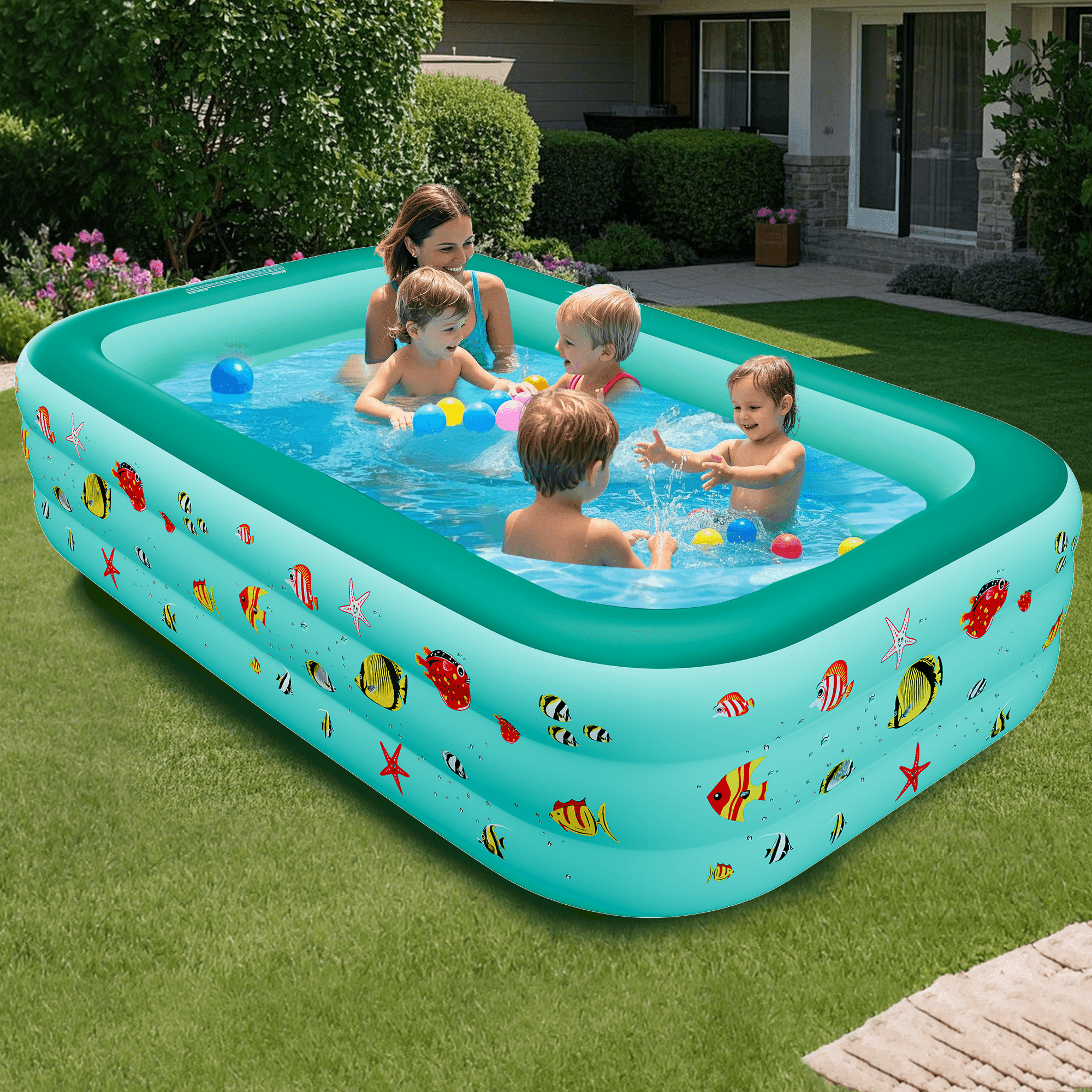 ???? [ Family-size Inflatable Pool ] With 118″ X 67″ X 22″ size, GVDV wimming pool with 312 gal water capacity can hold up to 2 adults plus 3-5 kids(Age 3+) to enjoy a splashing pool party in the backyard.This inflatable pool would be a great entertainment for your kids, pet dogs and family. ???? [ Safe & Durable Retangular Inflatable Pool ] GVDV swimming pool for kids is made with Phthalate and lead free, Using BPA-free materials that meets the standards of international children’s toys, which is twice thicker than most in the market, reducing the risk of punctures and ensuring a long service life. ???? [ Quick and Easy to Use ] The family inflatable pool is easy to set up, you just need to simply spread out on the ground level.The inflatable pool can be inflated in 3-4 minutes by electric pump (not included), built-in 2 curve water valves double the drainage speed. ???? [ Sturdy &Stable Pools for Backyard ] Comes with 3 individual air chamber each with double intake and free flow exhaust valve , the swimming pool for adults can withstand extra weight while preventing air leakage. 90° vertical drainpipe of inflatable swimming pool can facilitate the outflow of water, tidying inflatable pool up is no longer an issue. ???? [ Best Summer Gift, Swimming Pool and Ball Pit ] GVDV inflatable pool is a great gift for your kids, families, pet dogs and friends. They could not only enjoy the hot summer day time with our inflatable pool in the backyard,but also it would be used as the ball pit indoor when the weather is cool.