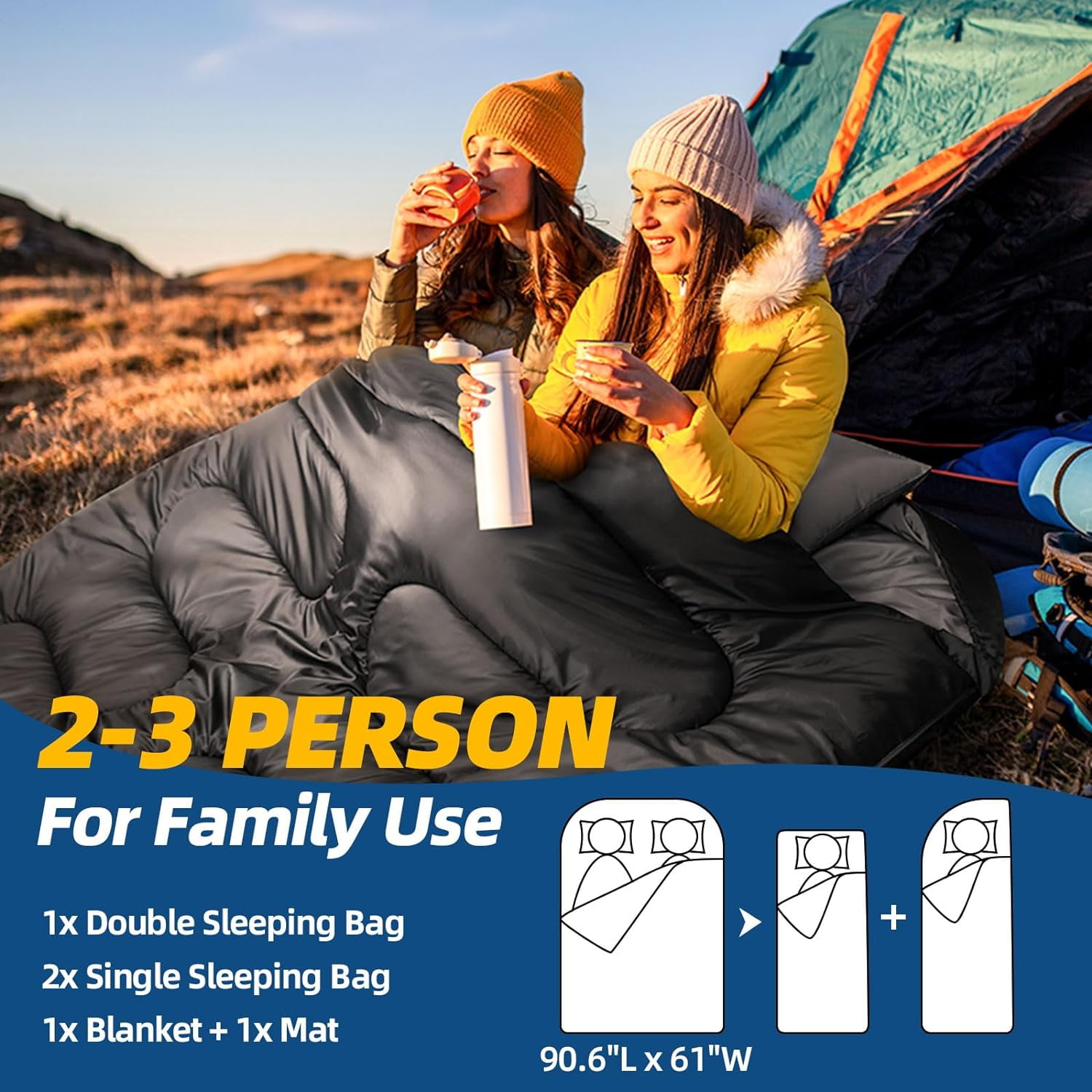 GVDV Waterproof Double Sleeping Bag, Black Luxurious Lining: Made with tightly woven 240T polyester for a skin-friendly, breathable experience mimicking a real bed Intimate Design: Features a 5.2-inch shoulder draft tube, half-circle hood with adjustable drawstring, and storage pockets for phone and valuables Cold Weather Sleeping Bag: Rated for temperatures as low as 28℉, with a 4.5lbs filling weight and waterproof, tear-resistant polyester fabric Spacious Size: Measures 90.6×63” (230x160cm) and weighs 7.2lbs (3.2kg), offering ample space for two adults Multi-Purpose Design: Full-open zipper allows use as two single sleeping bags or a quilt/blanket Durable Construction: Water-resistant 210T polyester shell with soft flannel lining and high-density hollow cotton filling Portable and Lightweight: Includes a compression sack for easy storage and transport, ideal for camping, backpacking, and traveling