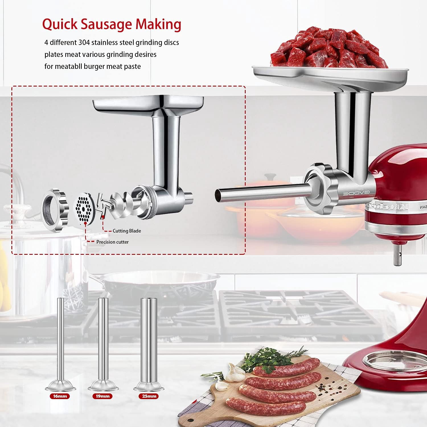 [ Perfect for KitchenAid Stand Mixer] Perfect for KitchenAid stand mixer, Gvode meat grinder attachment effortlessly transforms your mixer into a high-performance meat grinder, offering a faster and more efficient alternative to traditional manual methods [ All Metal Material] Food-grade stainless steel meat grinder Attachment Fits All KitchenAid Stand Mixer is more durable and safe than plastic aluminum alloy [ Multifunctional purpose] KitchenAid meat grinder attachment can be used for minced meat, balls, sausage, chopped garlic, chili sauce, bread crumbs, hard, cheese, salad [ Meat Grinder Attachment with Sausage Stuffer] Provide you with 2 sized enemas to make any sausage you like (German sausage Italian sausage venison summer sausage chorizo) in a healthier way to bring delicious sausage to you and your family [ Long Life use and Service ] Its high end materials and scientific design secure a long life use. Together with 12 Months Warranty, feel freely to try it. It will be one of your favorite kitchen attachment. Provide 24-hour customer service, if you have any question about the mixer attachments, please feel free to contact us