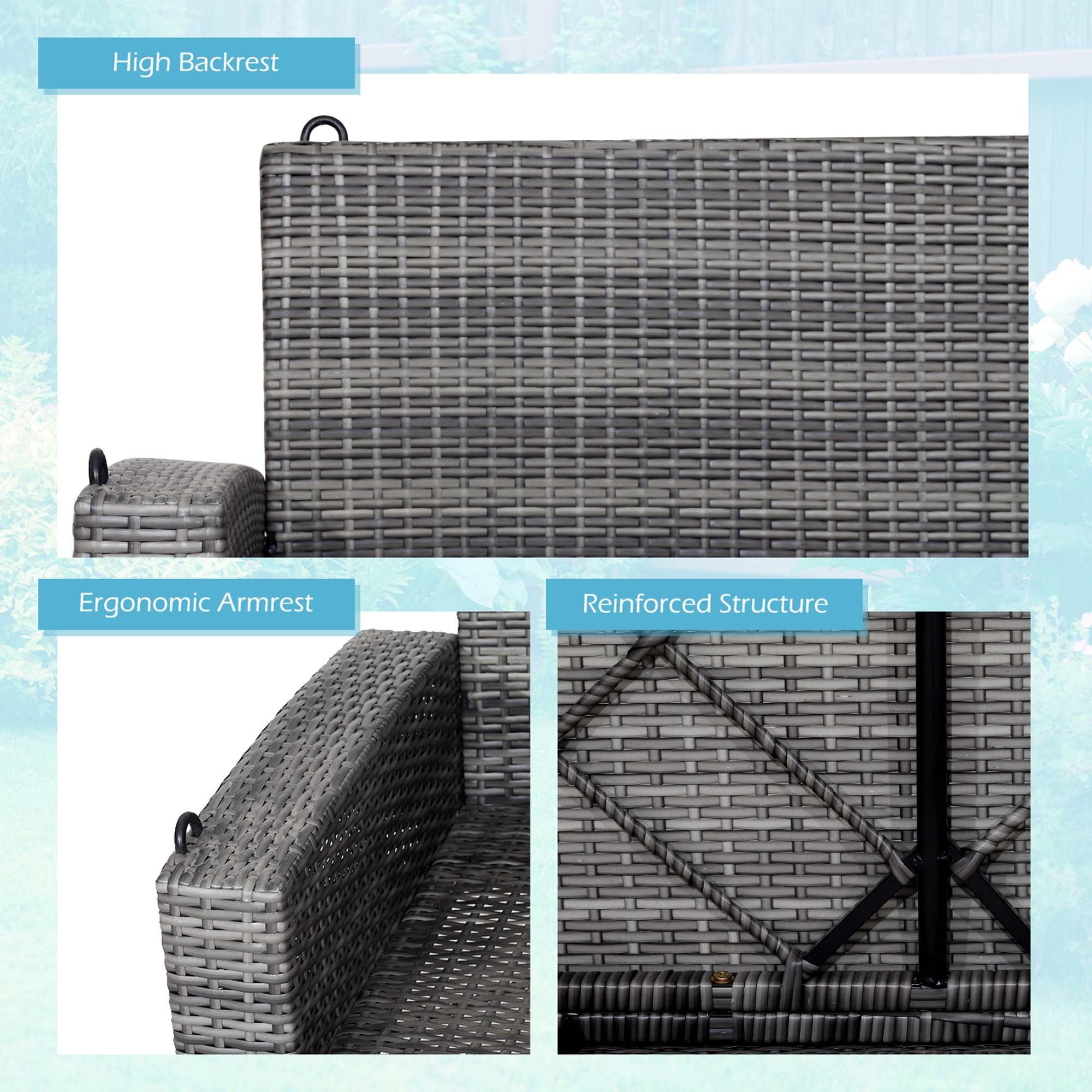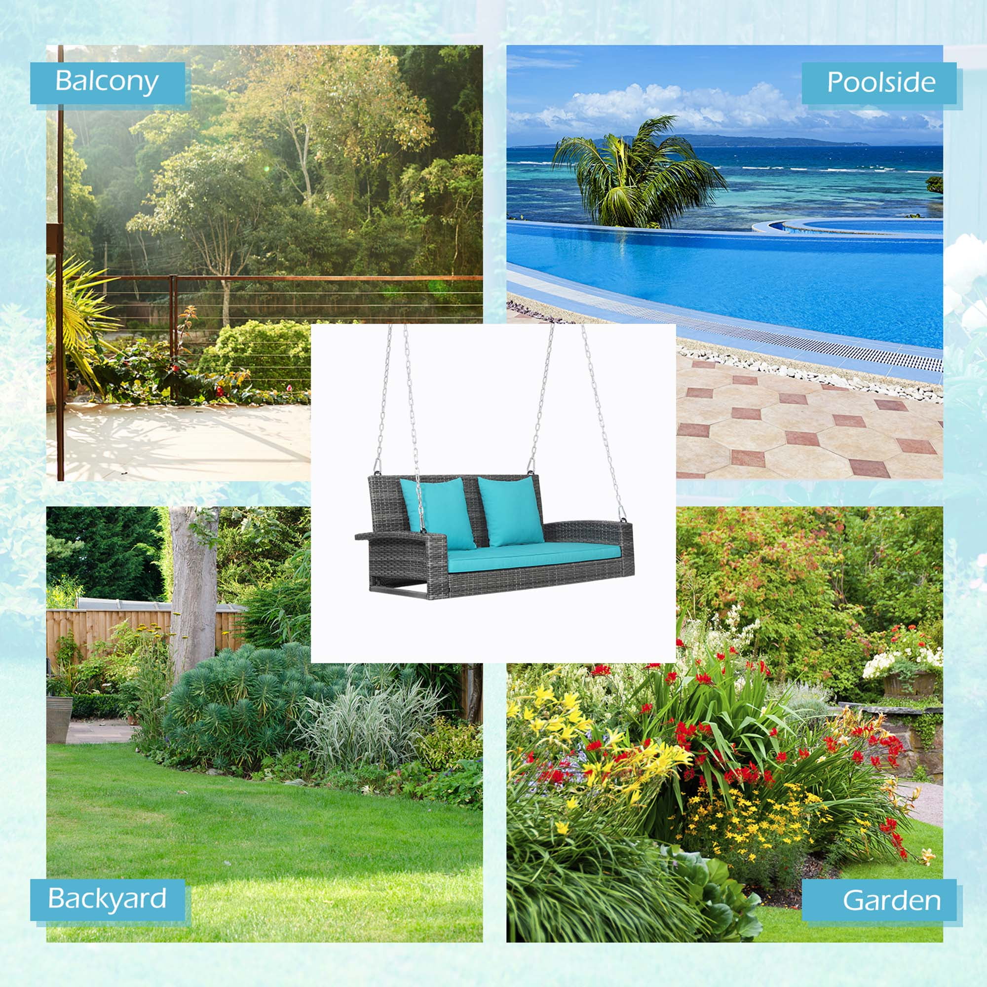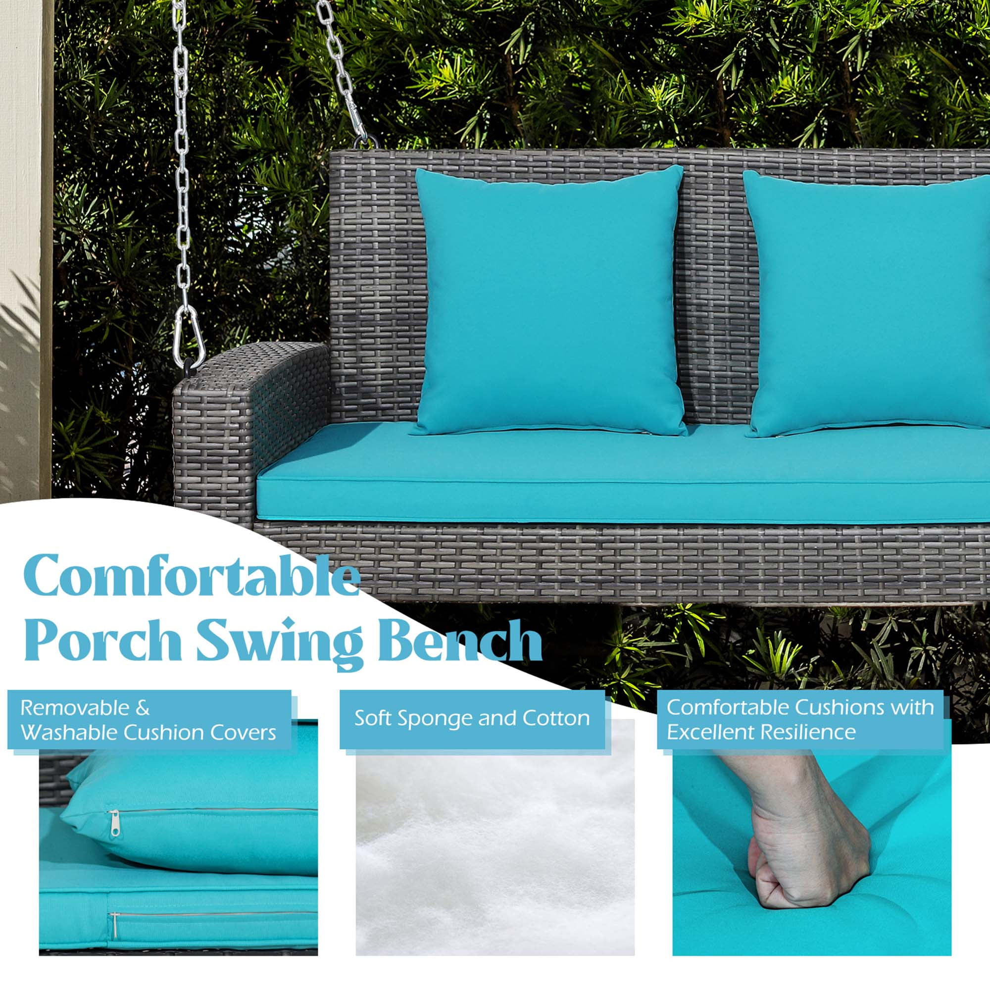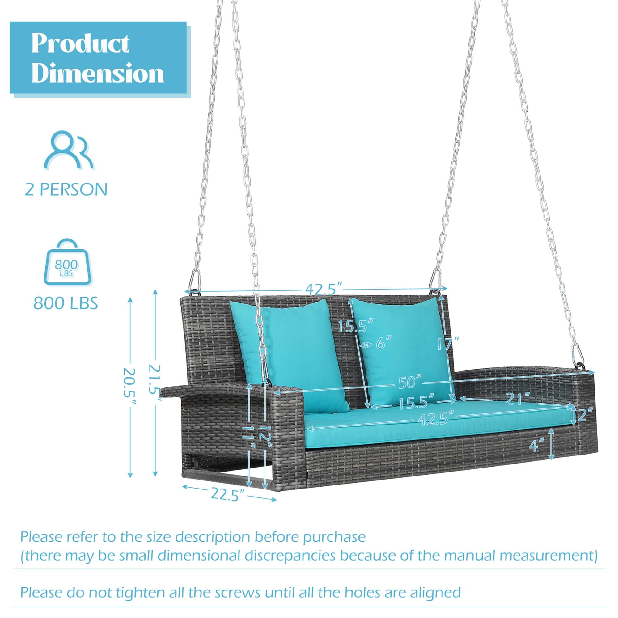 Description: Enjoy swinging back and forth on our 2-person patio swing chair! The main frame of the swing chair is made of heavy-duty steel pipes, which ensures high stability and security. And the rust-resistance steel frame with weatherproof PE rattan surface can withstand long-time outdoor use. Coming with a long seat cushion and 2 back cushions filled with soft sponge, the swing chair offers a comfortable sitting experience to you. And the heavy-duty steel chains with carabiners allow you to swing with high safety. Come and relax with your beloved one on our porch swing chair! Features: Wide sitting area allows you to swing with your best friend Comfortable backrest and armrests make you fully relaxed Weatherproof PE rattan withstands long-time outdoor use Sturdy steel frame for strong weight capacity which is 800 lbs Seat and back cushions filled with sponge provide much comfort Specification: Color of PE Rattan: Mix Grey Color of Cushion: Turquoise Material: PE Rattan, Steel, Polyester, Sponge Overall Dimension of Swing: 50” x 22.5” x 21.5” (L x W x H) Dimension of Seat Cushion: 42.5” x 21” x 2” (L x W x Thickness) Dimension of Each Back Cushion: 15.5” x 15.5” x 6” (L x W x Thickness) Fully Extended Length of Each Steel Chain: 94.5” Net Weight: 29 lbs Weight Capacity: 800 lbs Package Includes: 1 x Porch Swing 1 x Seat Cushion 2 x Back Cushions 2 x Steel Chains 1 x Instruction