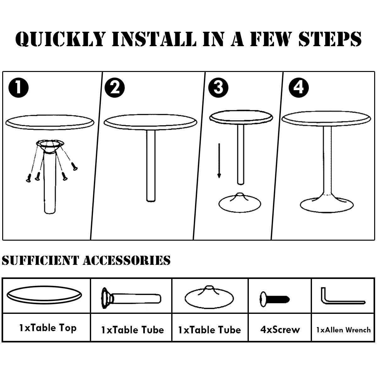 Description: This round bar table is made from MDF and metal base stable support display. Height of this bar table is 40″, so you don’t have to worry about the height drop, as many tables with adjustable height have this problem. The overall waterproof design allows you not to worry about difficult cleaning. The base that prevents rusting will not occupy too much area, and make the table look more noble and elegant. The anti-slip ring at the bottom can catch the ground. You can use it in large quantities at your bar or at your wedding. You can also buy it alone to decorate your living room or balcony. Features: Circular table can keep users from being hit by edges The obsidian pattern makes the table more noble and elegant It can be used in various occasions, weddings, bars, homes Easy to assemble according to the instruction manual Specification: Color: Black Materials: MDF, Iron Overall Dimension: 24″(L) X 24″(W) X 40″(H) Loading Capacity:265 lbs Net Weight: 16 lbs Package includes: 1 X Bar Table 1 X Instruction Manual
