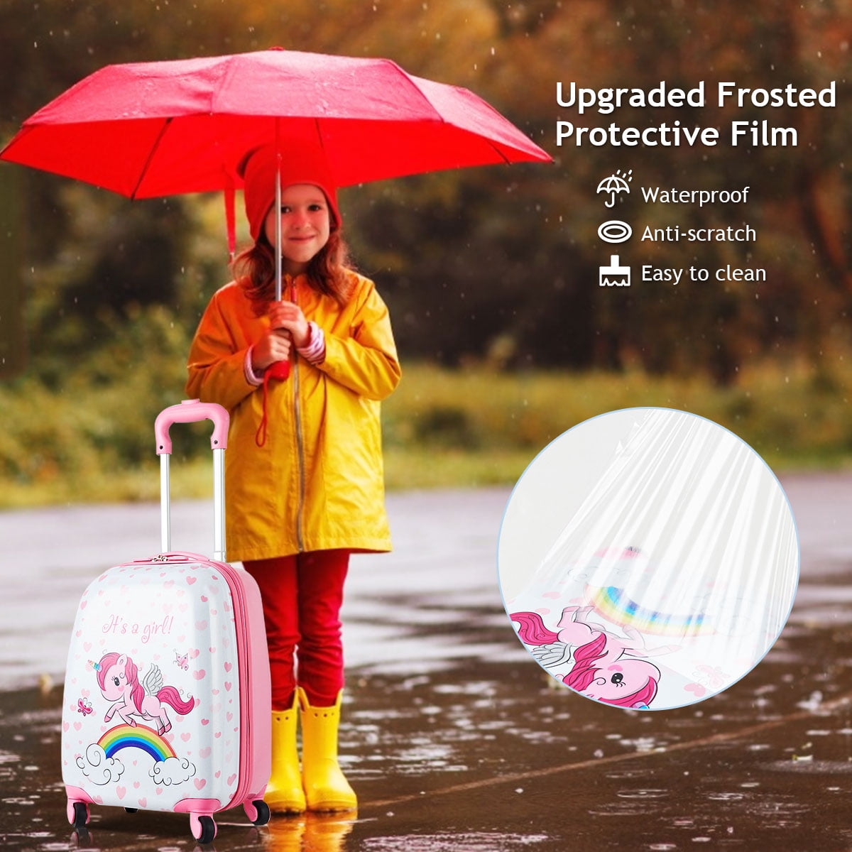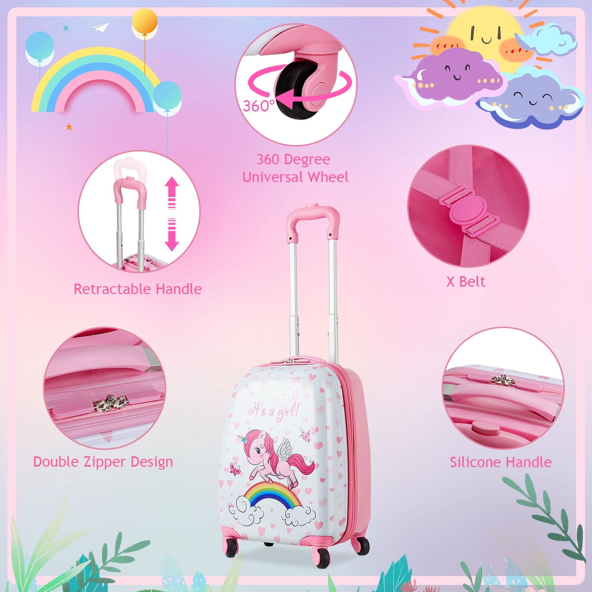 Made of premium Sturdy ABS plastic with scratchproof protective film, waterproof and easy-to-clean Dual-tube adjustable pull handle and a top grab handle for easy lifting and pulling Telescoping rod with 3 levels adjustment for kids of different heights Adorable luggage set features a colorful all-over unicorn pattern design The luggage and backpack are both lightweight, won’t be extra burden to children when they go to school or on the way to travel The length of the shoulder straps can be adjusted and wider padded shoulder strap makes the backpack more comfortable for kids Luggage interior lined with multi-use organizational pockets making it easy for packing clothes and toys Spacious zippered compartment and elastic tie-down straps to keep items neat and organized
