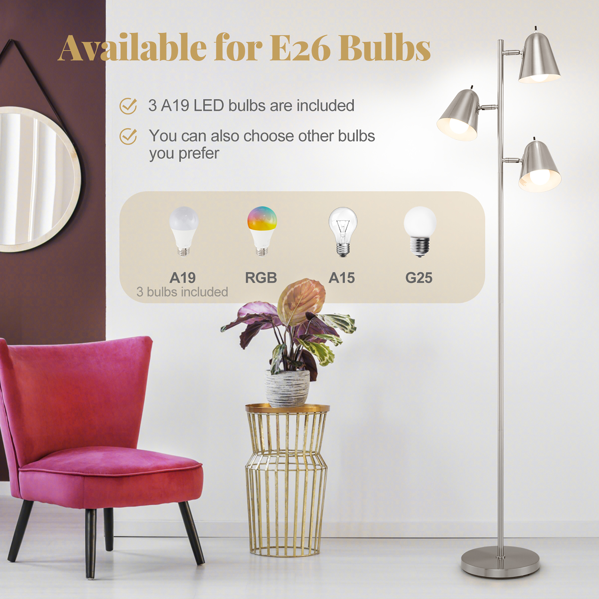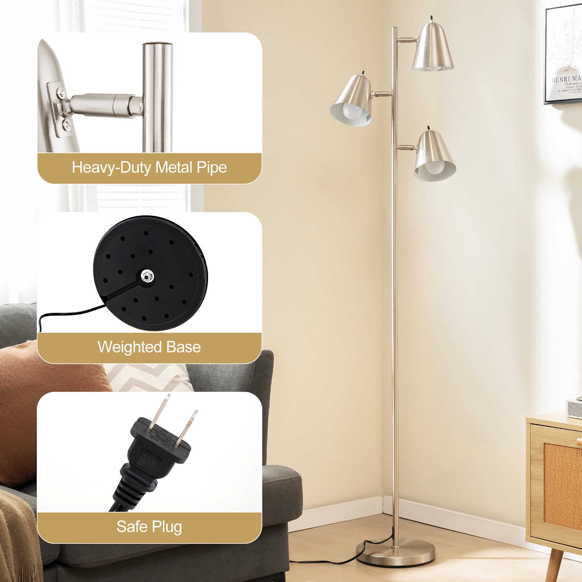 Adjustable Lampshades: Featuring 360°rotation and 90°vertical up and down, the 3 lampshades of the floor lamp allow you to direct light where you need it most. Such unique design will enhance functionality and add flexibility to your lighting setup. 3 LED Bulbs Included: This floor lamp comes with 3 energy-efficient LED A19 bulbs, ensuring you enjoy substantial illumination immediately upon setup. The lamp is available for most E26 bulbs, so you can also choose other bulbs you prefer. Individual Switch: Each of the 3 lampshades features an independent switch, allowing for personalized control over lighting. This versatile feature enables you to use one, two, or all three bulbs at once, making it easy to create the perfect ambiance for any occasion. Stylish Floor Lamp: Enhance your interior decor with this stylish floor lamp that combines modern design and practicality. Moreover, the heavy-duty metal pipe and weighted base both ensure high stability. Hassle-Free Assembly: Set up your new lamp with ease, thanks to its hassle-free assembly process. Designed for straightforward construction, this lamp allows you to quickly enjoy its functionality and style without the need for professional help. Suitable for living room, bedroom, office and so on Safe plug ensures high security Simple to assemble, saving time and effort