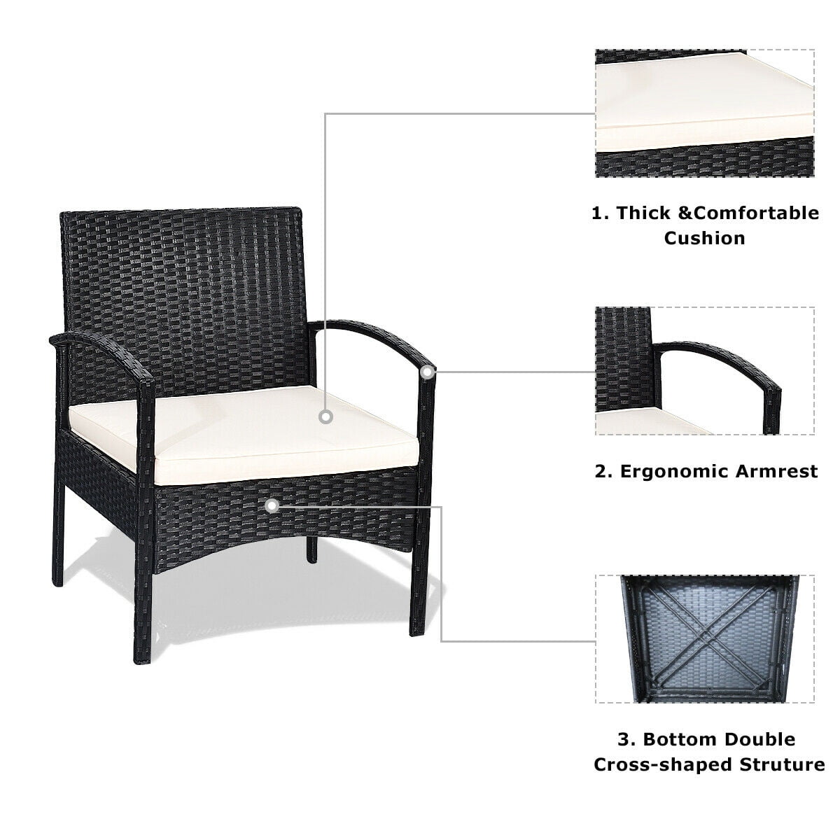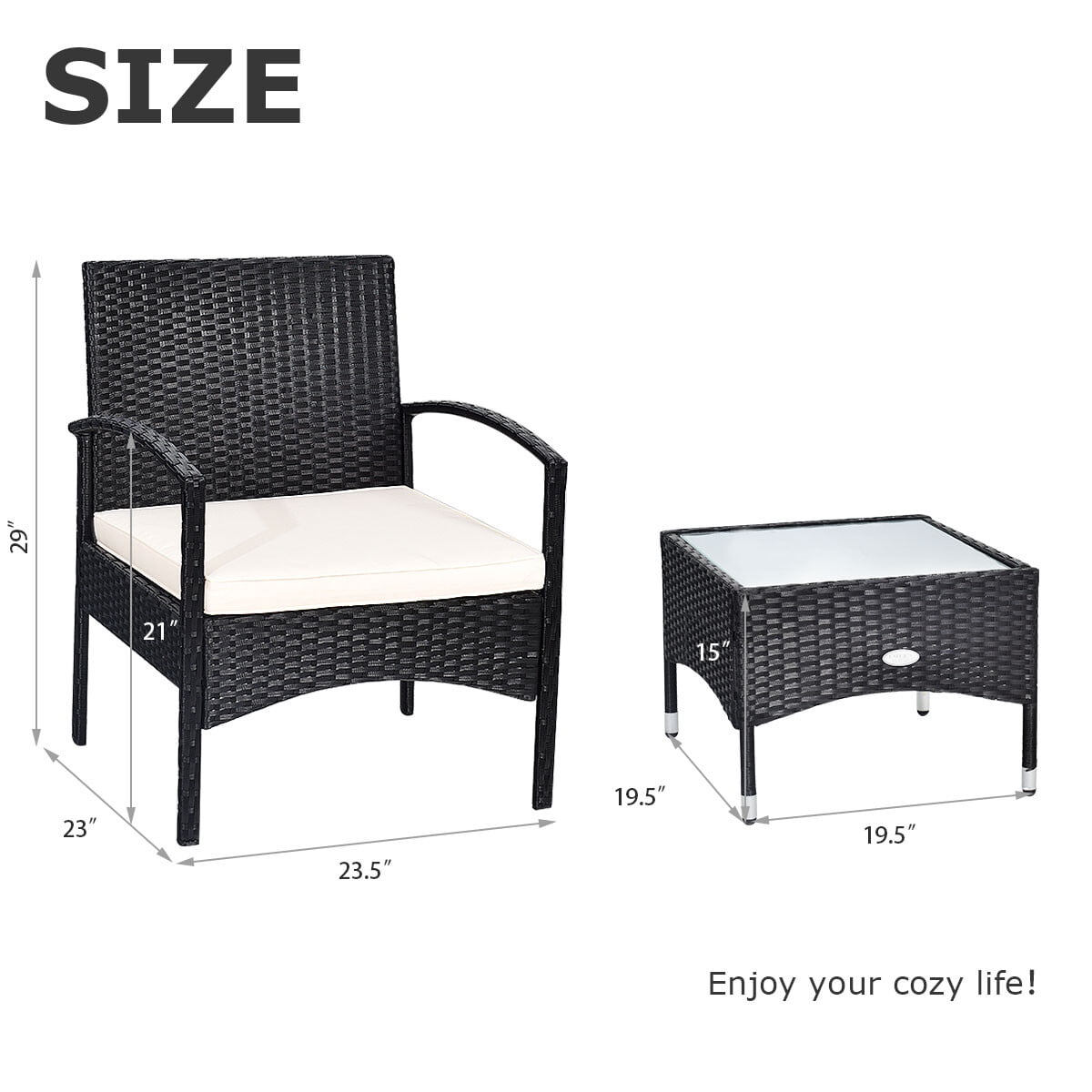 Description: Our 3 PCS patio wicker rattan furniture set can make your outdoor living become better. Made of premium rattan and sturdy steel materials, the chair is stable enough to hold around 330 Ibs weight. Thickened cushions will give you a comfortable seating experience and you will feel that your body has loosened up a bit. Because the whole frame is lightweight, you can easily transport the chair to the yard or beside a swimming pool. Put some drinks and snacks on the table which equipped with a milky white tempered glass and sit on the chair, you can talk with your relatives and your family or just to have a great relax. Features: Sturdy rattan and steel materials for long service time Thick sponged cushion is soft and the cover is washable Weatherproof materials ensure the furniture set to be placed outside all year around Coffee table has a tempered glass top that is solid and easy to clean Specification: Color: Black Rattan Material: PE Materials: Polyester, Sponge, Steel, Wicker Maximum load bearing of chair: 330 Ibs Maximum load bearing of table: 110 Ibs Size of chair: 23.5” * 23” * 29”(L XW XH) Size of table: 19.5” * 19.5” * 15”(L XW XH) Package includes: 1 X 3 PCS patio wicker rattan furniture set 1 X Instruction