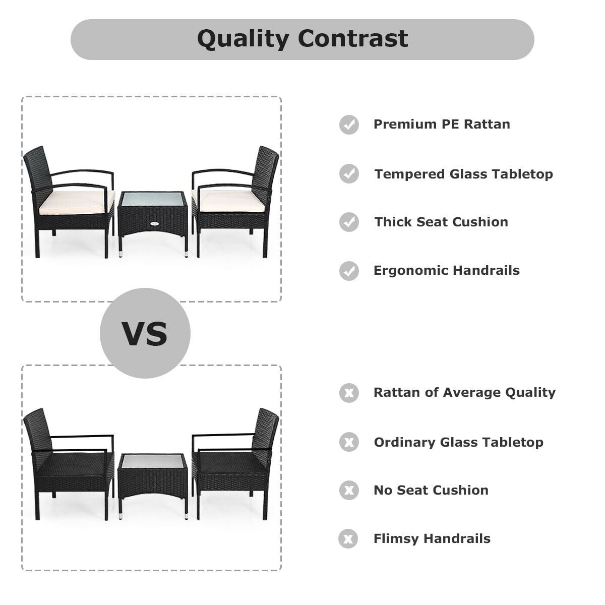 The cushions are covered with waterproof polyester cloth which is Sturdy and east to clean Good load bearing capacity which can up to around 330 Ibs Rattan set is light enough for you to carry and transport Ample tabletop space for serving drinks, snacks and fruits Ideal for placing in patio, yawn, garden, backyard and indoor Easy to install with detailed instructions
