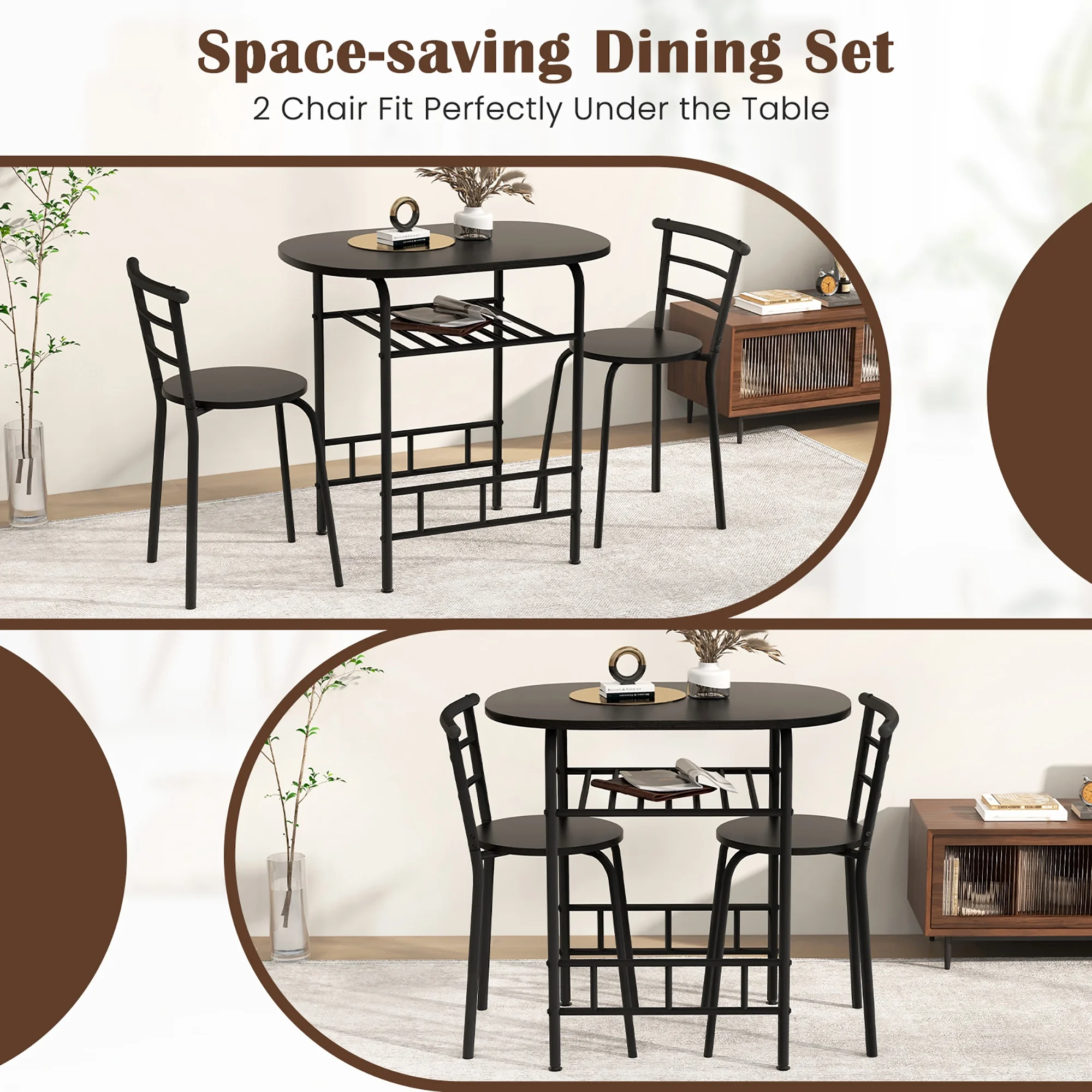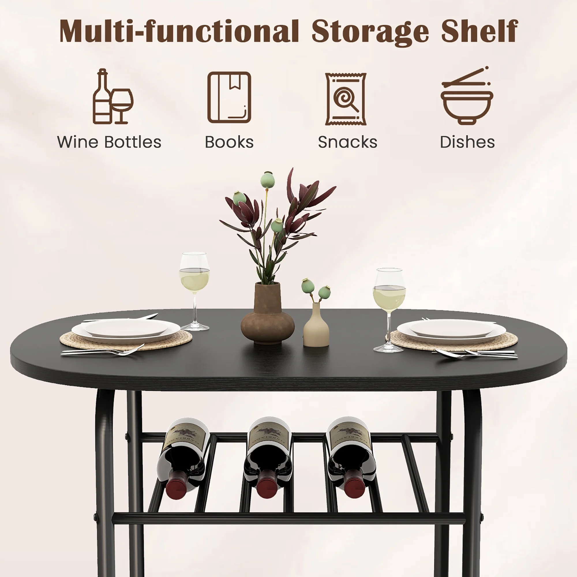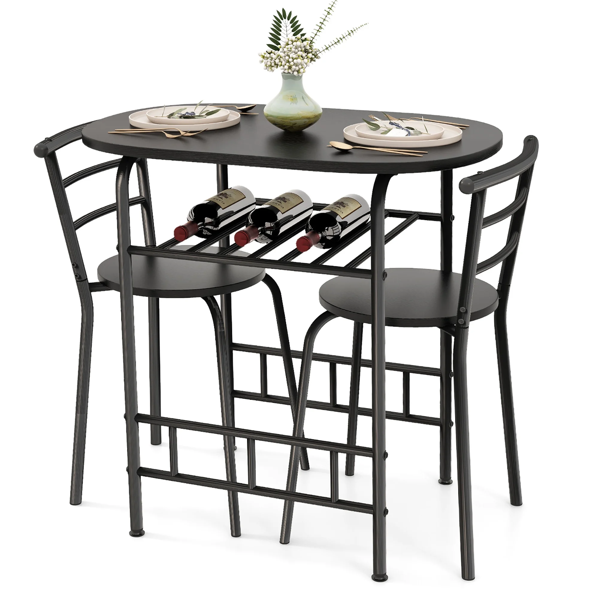 Description: Includes a dining table and 2 armless chairs. Consisting of MDF and painted iron pipes, this table and chair set can be used for many years. Under the tabletop is an extra storage rack that can be used to store red wine, magazines, cups, bowls according to your needs. The curved chair backrest is ergonomically designed to make you feel comfortable, and most importantly the curved shape fits perfectly with the edge of the table so the 2 chairs and the table can be integrated when not in use to save space. You’ll up the elegance factor of any meal when you enjoy it on this 3 piece dining set. Features: Made of MDF and iron pipes, it is Sturdy Includes a sturdy oval table and two chairs Compact design suitable for small space, such as bistro, kitchen, apartments Easy to install with clearly instruction Specification: Color: Black Material: MDF + iron Overall size of table: 31.5” x 21” x 29.5”(L x W x H) Overall size of chair: 19” x 15” x 29.5” (L x W x H) Seat diameter: 14″ Height from seat to ground: 18″ Back size: 19″ W x 12.5″ H Size of wine rack: 18.5″ L x 17.5″ W Weight capacity of table: 176Lbs Weight capacity of each chair: 220Lbs Package includes: 1 x Table 2 x Chair