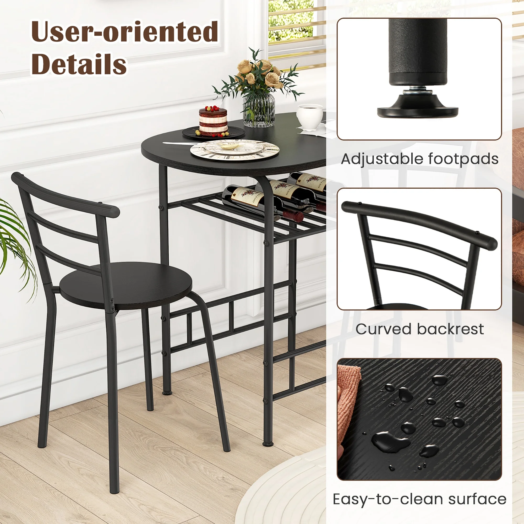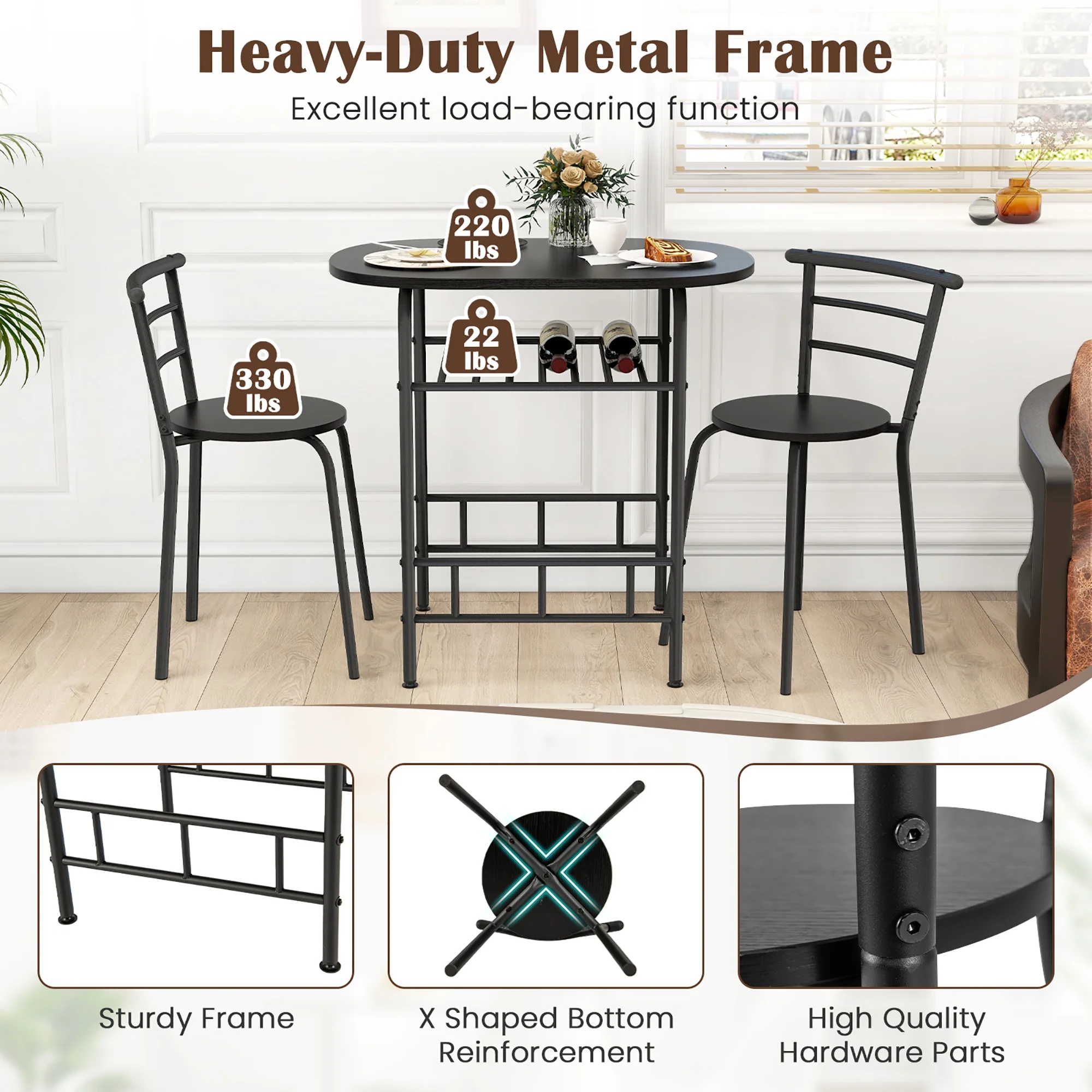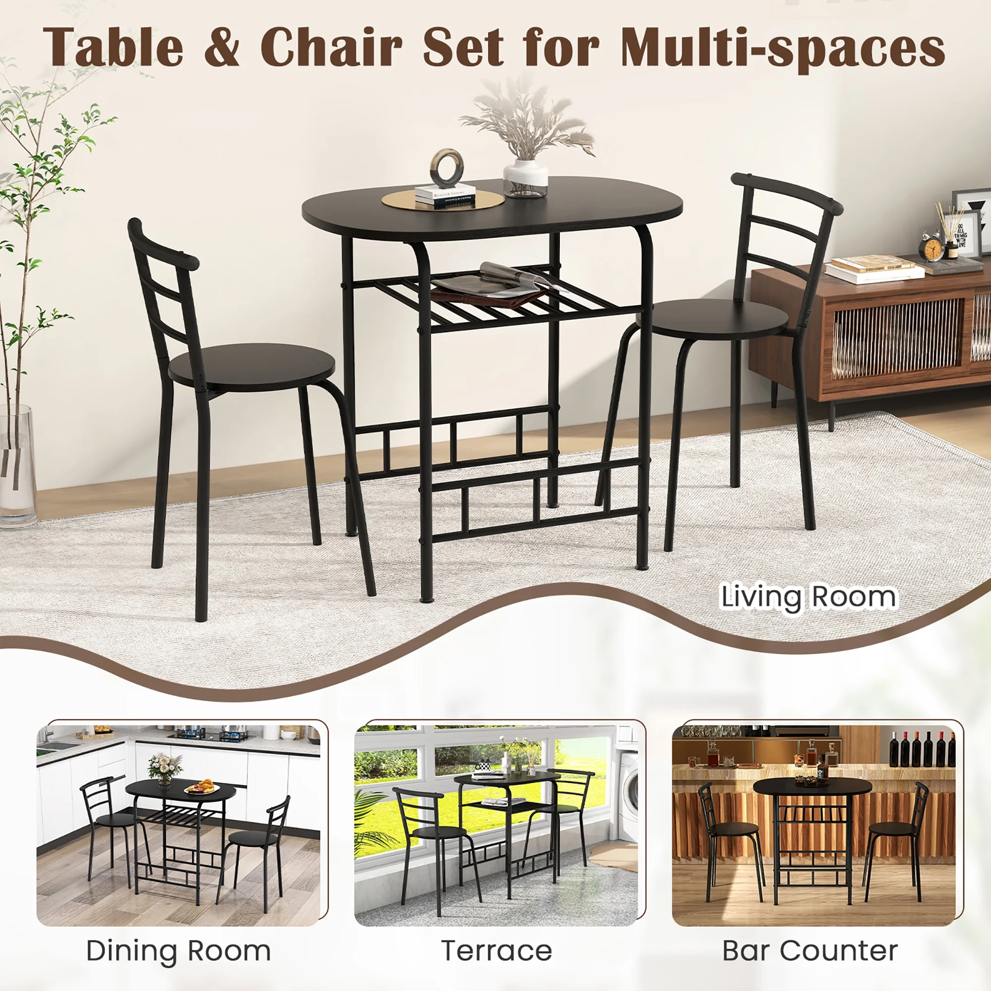 Description: Includes a dining table and 2 armless chairs. Consisting of MDF and painted iron pipes, this table and chair set can be used for many years. Under the tabletop is an extra storage rack that can be used to store red wine, magazines, cups, bowls according to your needs. The curved chair backrest is ergonomically designed to make you feel comfortable, and most importantly the curved shape fits perfectly with the edge of the table so the 2 chairs and the table can be integrated when not in use to save space. You’ll up the elegance factor of any meal when you enjoy it on this 3 piece dining set. Features: Made of MDF and iron pipes, it is Sturdy Includes a sturdy oval table and two chairs Compact design suitable for small space, such as bistro, kitchen, apartments Easy to install with clearly instruction Specification: Color: Black Material: MDF + iron Overall size of table: 31.5” x 21” x 29.5”(L x W x H) Overall size of chair: 19” x 15” x 29.5” (L x W x H) Seat diameter: 14″ Height from seat to ground: 18″ Back size: 19″ W x 12.5″ H Size of wine rack: 18.5″ L x 17.5″ W Weight capacity of table: 176Lbs Weight capacity of each chair: 220Lbs Package includes: 1 x Table 2 x Chair
