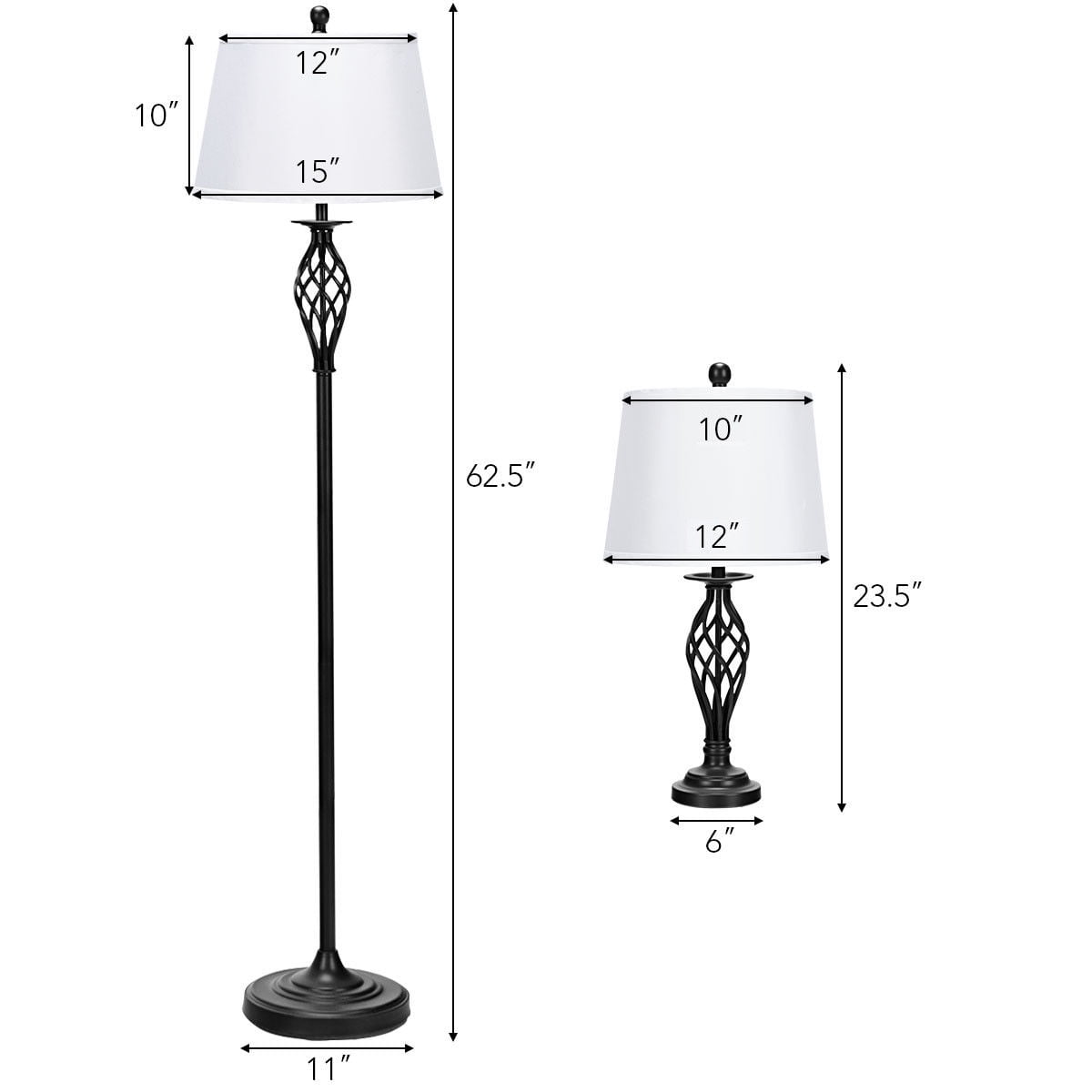 Overall dimension of the floor lamp: 15”W x 62.5”H Overall dimension of the table lamp: 12”W x 23.5”H 3-piece set includes 2 table lamps and 1 floor lamp All take one maximum 60 watt standard base bulb (not included)