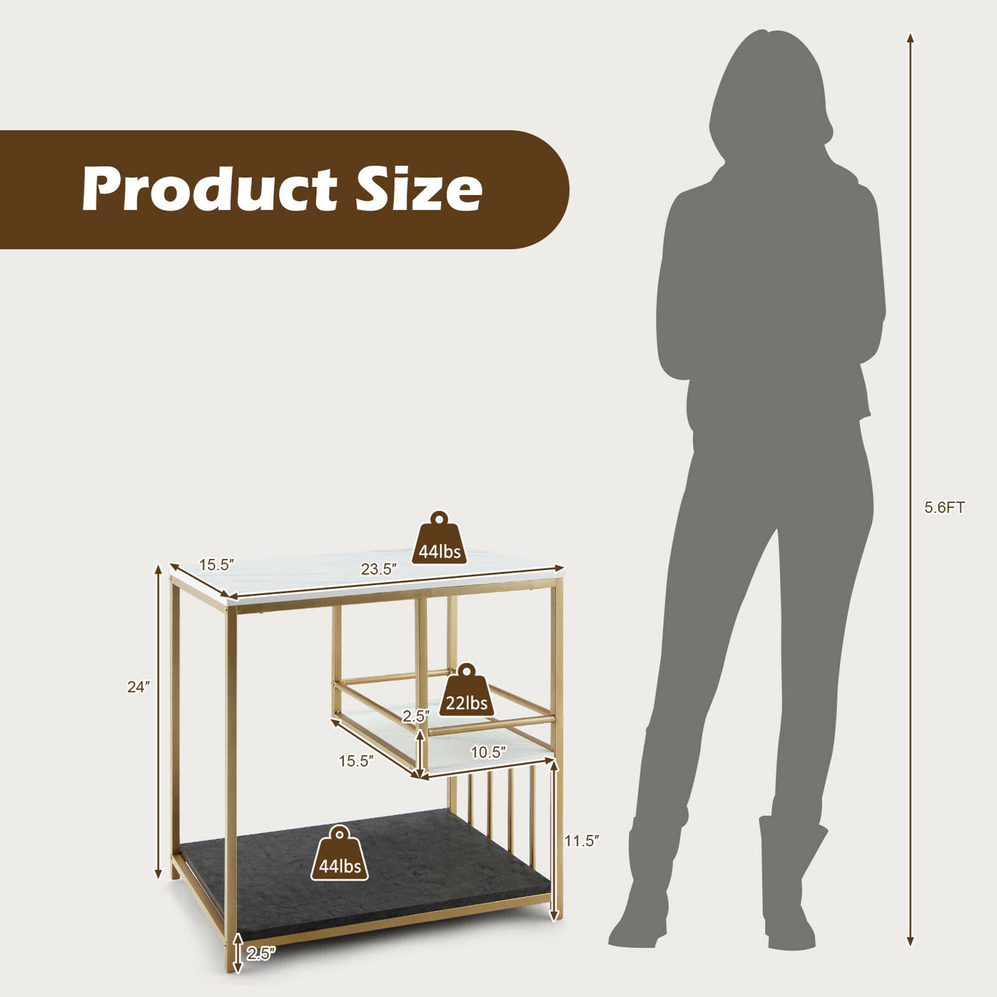 Perfect Storage Solution: The side table is designed with a wide tabletop for placement and display, a middle shelf for small items, and a bottom shelf with large space. With ample storage space, the table fits a variety of daily items, such as cups, books, small baskets, vases, and decors. Multi-function Side Table: Our product can serve as a sofa side table, a bedside nightstand, an entryway table, and more. Its compact but practical size allows it to perform well in the living rooms, bedrooms, small apartments, dorms, etc. not only as a space organizer but also as an exquisite decor. Durable Material & Sturdy Construction: Each layer is made of premium and thick boards, which are durable and waterproof for long-term use. Meanwhile, the table is constructed of a sturdy steel frame, finished to be waterproof and rustproof, to ensure stability and nice weight capacity. Features: Multi-function side table combines beauty and practicality An L-shaped design with 3 tiers provides ample storage space Constructed of the solid and rustproof steel frame to ensure stability Easy to assemble with clear instructions provided Color: Marble & Golden Material: MDF, Steel Overall Dimension: 23.5″ x 15.5″ x 24″ (L x W x H) Dimension of Middle Shelf: 15.5″ x 10.5″ (L x W) Height from Middle Layer to Ground: 11.5″ Height from Bottom Shelf to Ground: 2.5″ Net Weight: 20 lbs Weight Capacity of Tabletop: 44 lbs Weight Capacity of Middle Layer: 22 lbs Weight Capacity of Bottom Shelf: 44 lbs Package includes: 1 x Side Table 1 x User Manual
