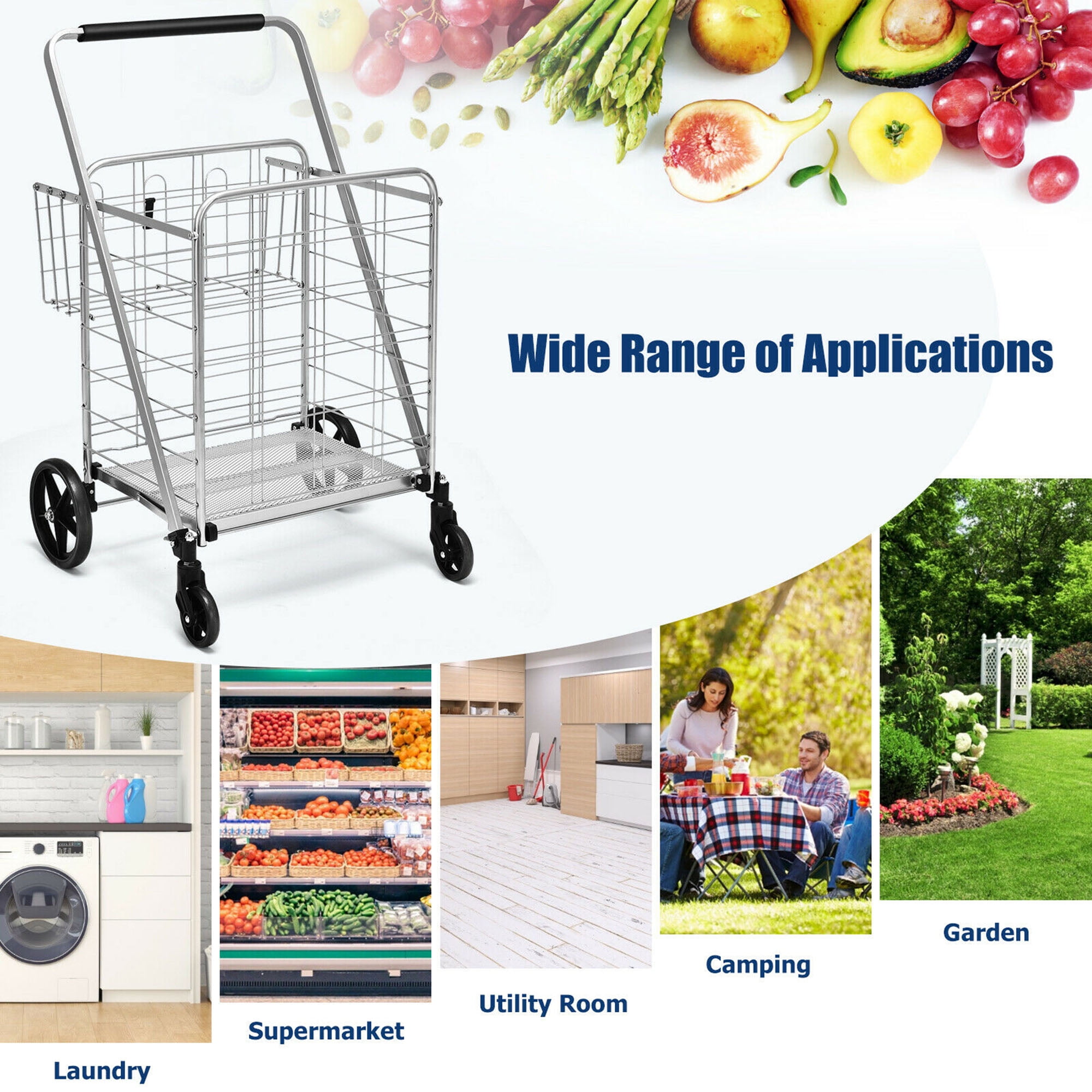 Made of strong steel frame and wide square tube, this grocery cart is rust-proof and durable to withstand up to 330 lbs weight. The main basket is spacious enough for your daily shopping. And it is designed with an extra back basket to keep small items for easy access and ensure your personal belongings safe. 360 degree swivel front wheels and large rear wheels can be easily maneuver through aisles, even on bumpy sidewalks. It is worth mentioning that intensive mesh base with rod prevents small items from falling. What’s more, it can be folded flat for easy storage. It is perfect for urban and city living, day to day grocery runs, gardening hauling and more. Features: Made of heavy-duty steel structure to ensure sturdiness and durability Spacious front basket to satisfy all your storage needs Extra back basket makes personal belongings easy access and secure storage Intensive mesh base with rod to optimize the loading capacity of 330 lbs Color: Silver Material: Steel + Plastic Overall Dimension (Fully Extended): 25” x 25” x 40”(L x W x H) Folded Dimension: 25” x 8” x 45”(L x W x H) Weight Capacity: 330 lbs Net Weight: 18 lbs Package includes: 1 x Shopping Cart 1 x Instruction