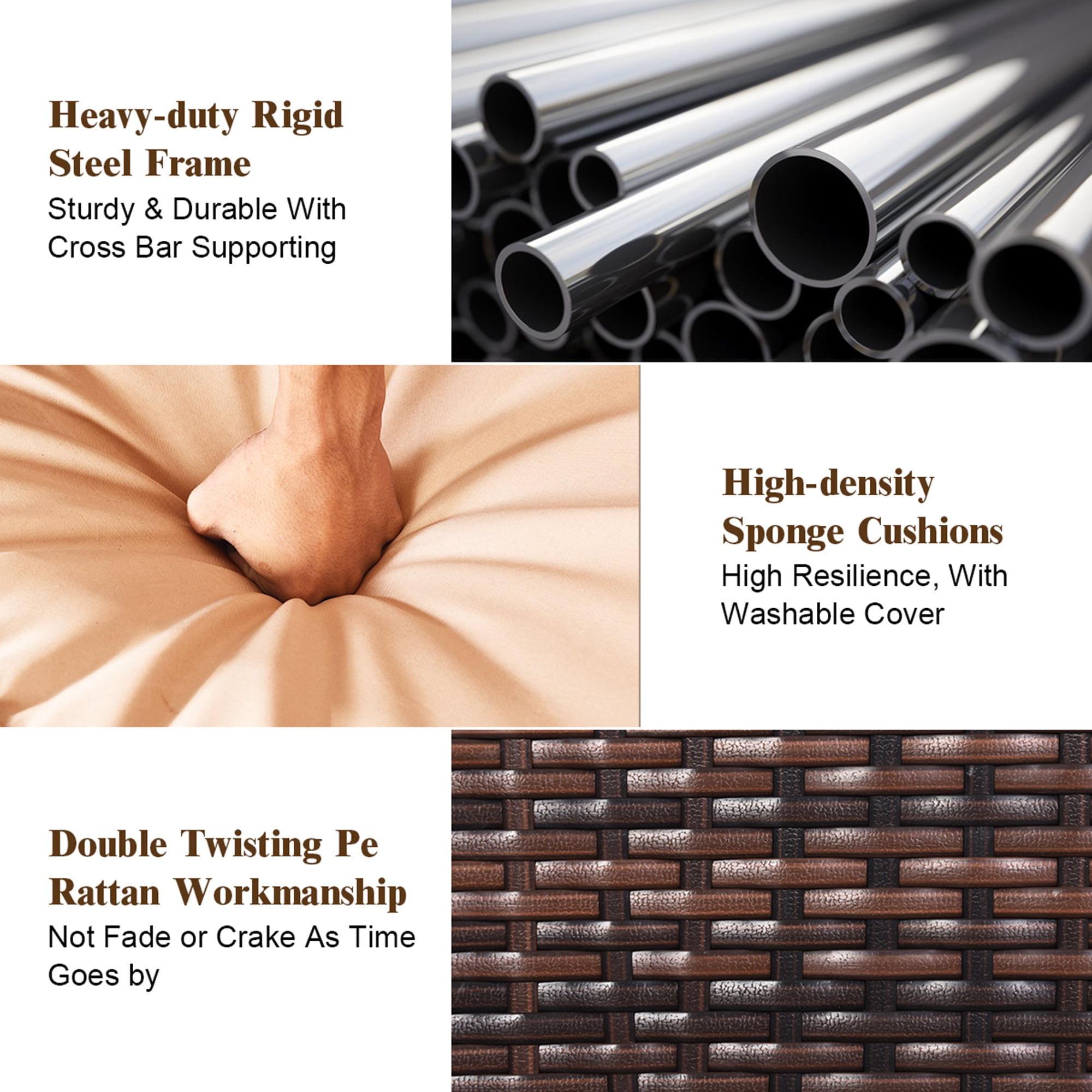 Description: Our 3-pieces rattan furniture set comes with a sofa, a chaise lounge and a coffee table, so it is perfect for patio, poolside or garden. Solid metal frame and tight rattan ensure it can serve you for a long time. Fashionable and modern style will bring new energy to your yard. The tempered clear glass top adds a touch of sophisticated elegance you’ll love. Moreover, there are thick cushions on the seats, which will provide you with a comfortable sitting experience. Covers of these cushions can be taken off because of zipper design. Do not hesitate to buy it! Features: Made of solid steel frame and high-quality rattan, Sturdy Cushions are filled with high density sponge for comfort and softness Coffee table with tempered glass for convenient using and cleaning Specification: Color: As the Picture Shows Material: Steel + Polyester Fabric + Sponge + Wicker Overall Size: 71.5” x 47” x 25” (L x W x H) Size of Loveseat Sofa: 47.5” x 24” x 25” (L x W x H) Size of Corner Lounge Sofa: 47” x 24” x 25” (L x W x H) Size of Coffee Table: 31.5” x 18” x 14.5” (L x W x H) Net Weight of Loveseat Sofa: 27 lbs Net Weight of Corner Lounge Sofa: 24.5 lbs Net Weight of Coffee Table: 19.5 lbs Weight Capacity of Sofa Set: 705 lbs Weight Capacity of Coffee Table: 110 lbs Cushion Thickness: 2.5” Seat Height: 16” Armrest Height: 25” Package includes: 2 x Two-seat Sofat 1 x Coffee Table 3 x Back Cushion 2 x Seat Cushion 1 x User Manual