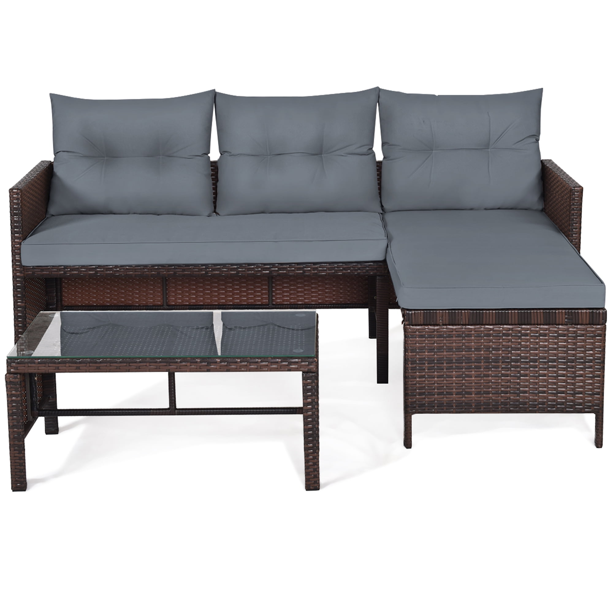 Description: Our 3-pieces rattan furniture set comes with a sofa, a chaise lounge and a coffee table, so it is perfect for patio, poolside or garden. Solid metal frame and tight rattan ensure it can serve you for a long time. Fashionable and modern style will bring new energy to your yard. The tempered clear glass top adds a touch of sophisticated elegance you’ll love. Moreover, there are thick cushions on the seats, which will provide you with a comfortable sitting experience. Covers of these cushions can be taken off because of zipper design. Do not hesitate to buy it! Features: Made of solid steel frame and high-quality rattan, Sturdy Cushions are filled with high density sponge for comfort and softness Coffee table with tempered glass for convenient using and cleaning Specification: Color: As the Picture Shows Material: Steel + Polyester Fabric + Sponge + Wicker Overall Size: 71.5” x 47” x 25” (L x W x H) Size of Loveseat Sofa: 47.5” x 24” x 25” (L x W x H) Size of Corner Lounge Sofa: 47” x 24” x 25” (L x W x H) Size of Coffee Table: 31.5” x 18” x 14.5” (L x W x H) Net Weight of Loveseat Sofa: 27 lbs Net Weight of Corner Lounge Sofa: 24.5 lbs Net Weight of Coffee Table: 19.5 lbs Weight Capacity of Sofa Set: 705 lbs Weight Capacity of Coffee Table: 110 lbs Cushion Thickness: 2.5” Seat Height: 16” Armrest Height: 25” Package includes: 2 x Two-seat Sofat 1 x Coffee Table 3 x Back Cushion 2 x Seat Cushion 1 x User Manual