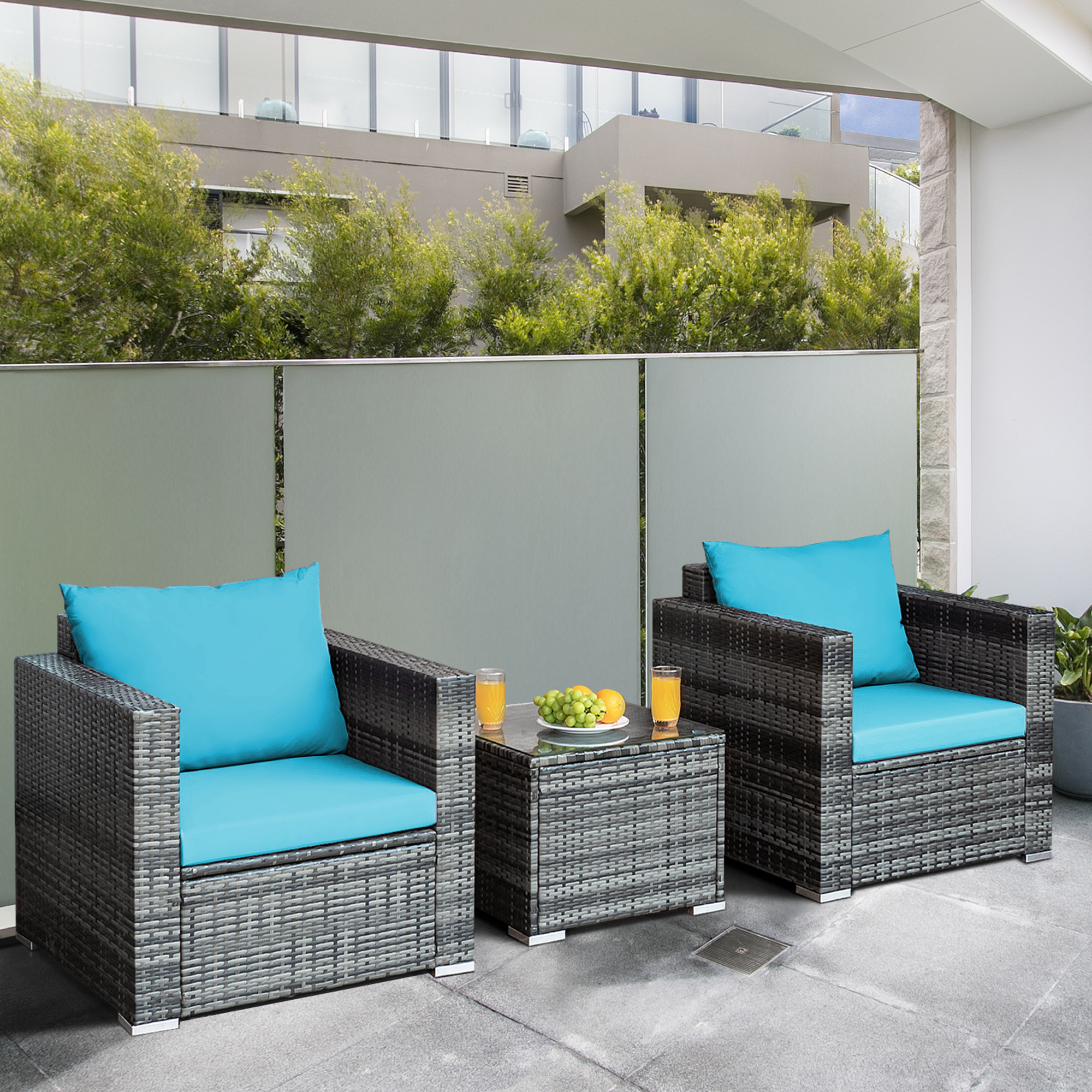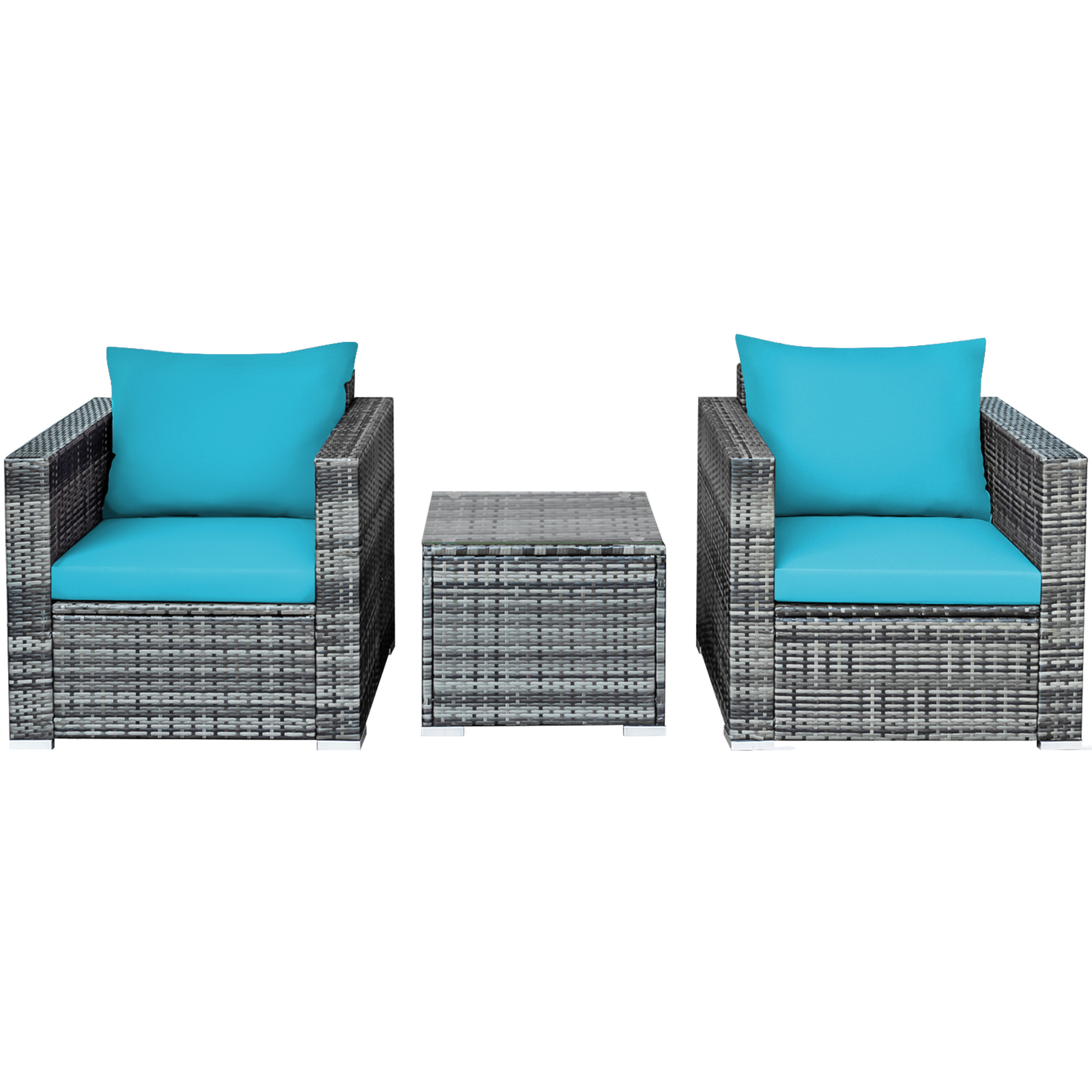 Gymax 3PCS Rattan Patio Conversation Furniture Set Outdoor Yard w/ Turquoise Cushion