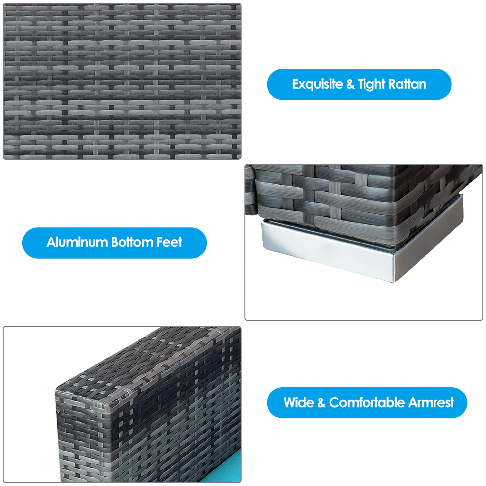 Description: Are you finding 3pcs sofa set for you home? This rattan sofa set will be a perfect choice for you. The whole set is crafted with steel and wrapped with premium wicker, which ensures the sturdiness and durability of set. Plus, the sofas are equipped with back and seat cushion add excellent comfort for you. And the cover of cushion is designed with smooth zipper for removing and cleaning easily. The coffee table is equipped with a thick tempered glass for placing foods, drinks or decors. And there are raised aluminum feet under the sofa and coffee table to protect bottom wicker. This rattan furniture set will go well with various home style, which is a perfect complement for your house. Features: Heavy-duty steel frame adds sturdiness of the sofa set Premium rattan is breathable and can serve for long time Wide armrest to support and relax your arm well Tempered glass tabletop for easy cleaning Specification: Color of Rattan: Mix Grey Color of Cushion: Turquoise Material: Steel, Rattan, Tempered Glass, Sponge Dimension of Single Sofa: 28.5”(L) x 27.5”(W) x 27”(H) Dimension of Coffee Table: 20”(L) x 20”(W) x 16”(H) Weight Capacity of Single Sofa: 400 lbs Weight Capacity of Coffee Table: 165 lbs Net Weight: 66.5 lbs Package includes: 2 x Single Sofa 1 x Coffee Table 2 x Seat Cushion 2 x Back Cushion 1 x Instructions