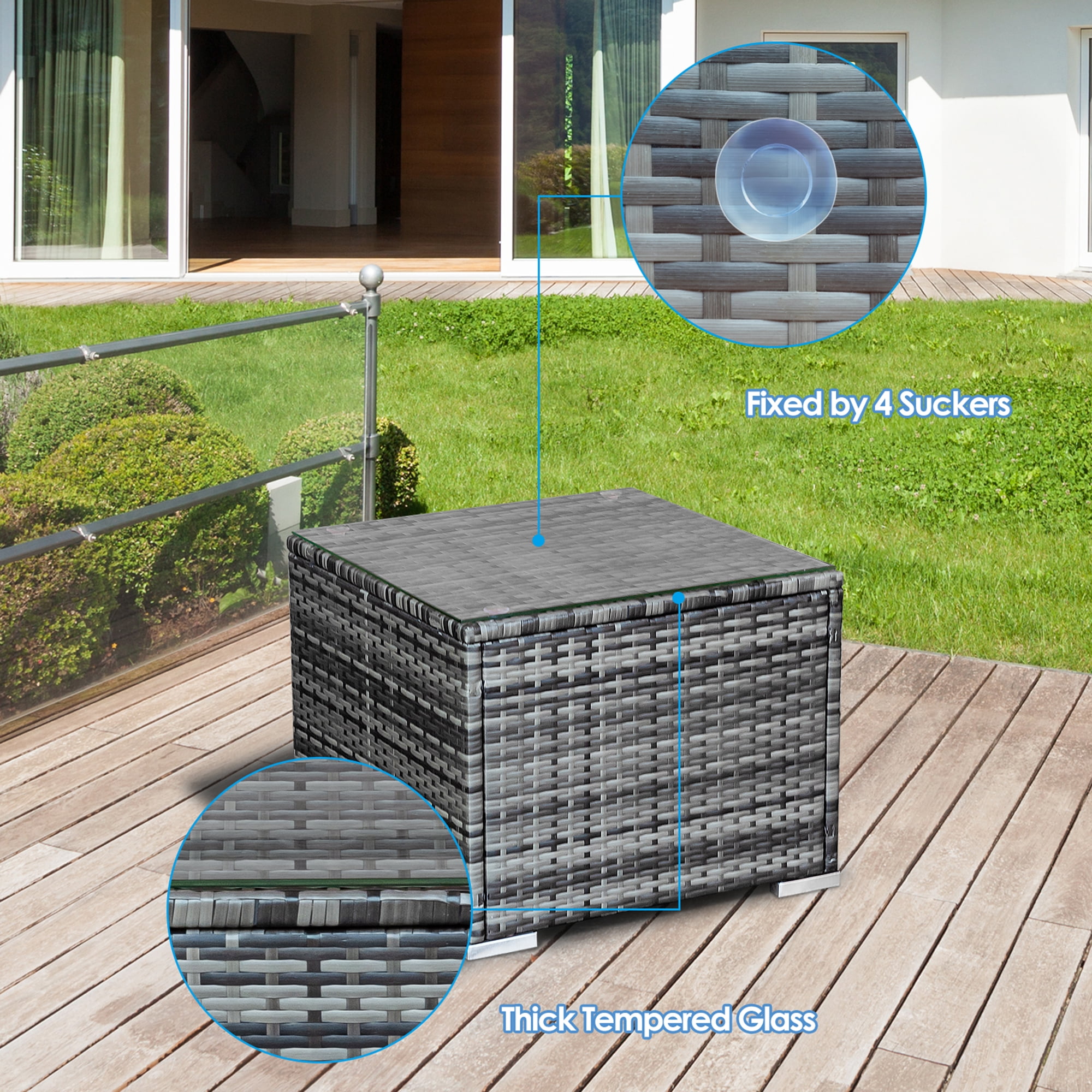 Steel Frame with Exquisite Rattan: The frame of this patio furniture set is made of steel and wrapped with PE weather-resistant wicker which ensures the stability and durability. And the set can withstand moderate change of weather in outdoor space. Thick Cushion with Removable Cover: Our set comes with 4 cushions and the sponge in cushion is thick and high resilience. They will provide ultimate comfort for your back and hip. Every cover of cushion has zipper for removing easily from the cushion. Ergonomic Design of Sofa: Two single sofas of our set have wide backrest and armrest to provide comfortable experience for you. And the height of the armrest is suitable to rest and relax your hands and arms. Besides, the aluminum feet will protect bottom rattan of sofa from scratch. Tempered Glass Top Table: Comes with a coffee table, the sofa set is great for having snacks or evening drinks. There is a thick tempered glass table on the top which has the function of heat resistance and shock resistance. And the top glass is fixed by four suckers tightly so that the glass won’t move when you are using the table. Multipurpose Furniture Set: With concise and modern style, the 3pcs sofa set is ideal to be placed in your garden, patio, balcony, poolside and backyard. Dimension of single sofa: 28.5” x 27” x 27” (L x W x H), hold up to 400 lbs. Dimension of coffee table: 20” x 20” x 16” (L x W x H), hold up to 165 lbs. Soft sponge cushions will provide you excellent comfort Cover with zipper of cushion is convenient to be washed Aluminum feet are anti-rust and will protect ground Ideal for your patio, poolside and garden Convenient to assemble according to instructions