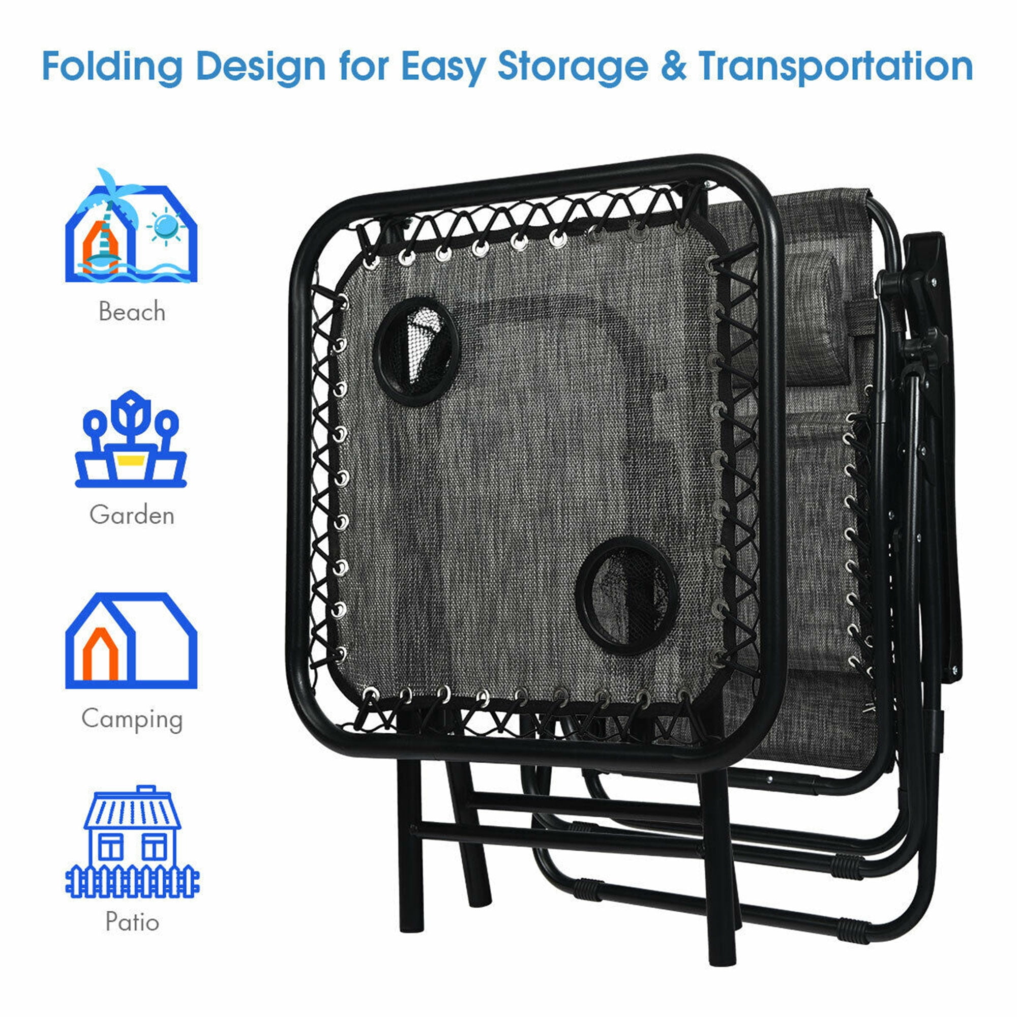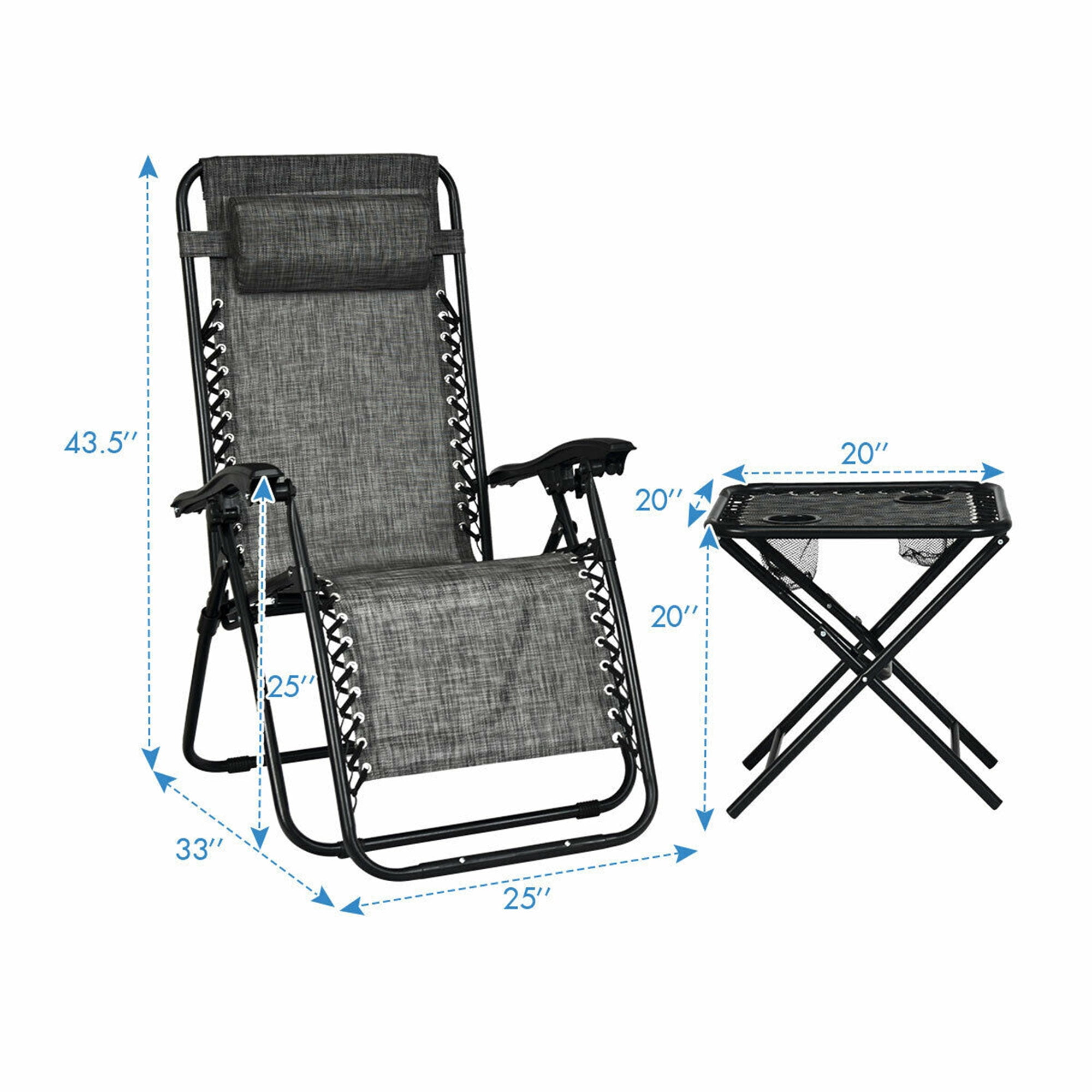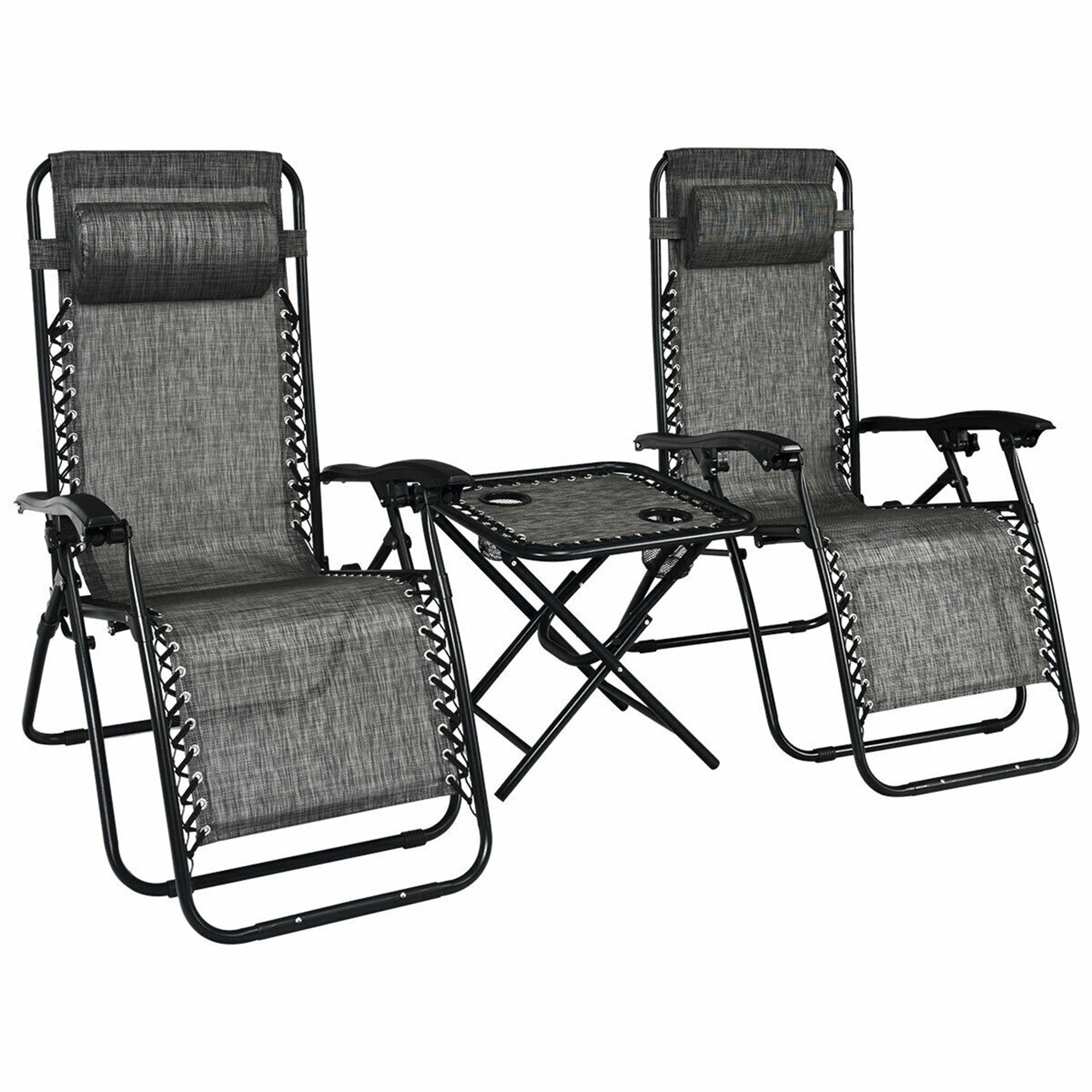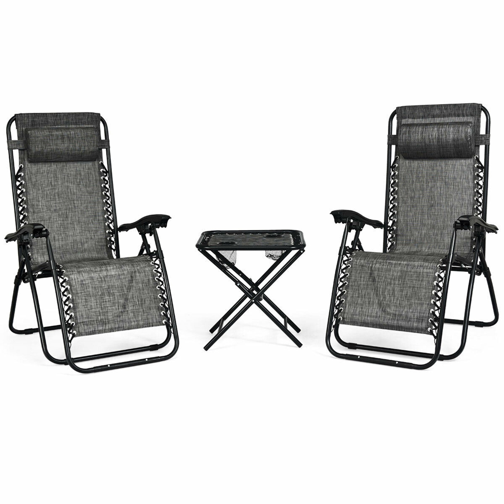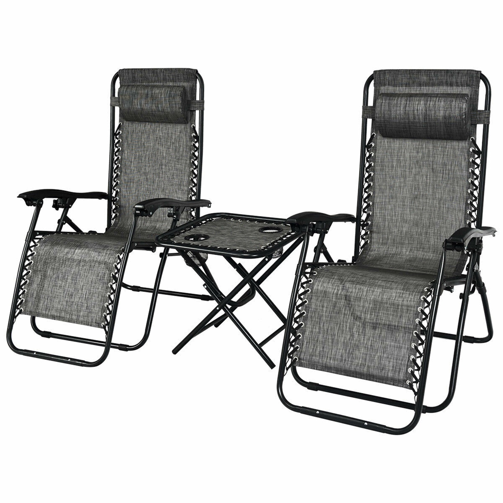 Gymax 3PCS Zero Gravity Recliner Lounge Chairs Pillows Table Portable Folding Grey