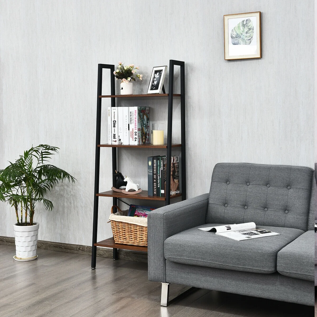 Description: This is our high quality and good looking shelf which is made of strong metal materials and durable particle board. Buy it and you’ll have a sturdy and life-long shelf. It’s very stable because of the metal x-type structure design behind the shelf. And it has four feet with adjustment pads which can be used on uneven ground. So that you don’t have to worry about the problem of falling shelves causing injuries to children. Put our 4 tiers ladder shelf in the living room and make it becomes a beautiful decoration in your home. Put in the study to be a bookshelf to help you organize files and books. The shelf also can be put in the balcony to be used as a flower rack. Features: It is made of strong metal materials and durable particle board The metal x-type structure design enhances the stability of the shelf 4 adjustment foot pads can be used on uneven ground Easy to install and have detailed instructions Specification: Material: particle board and metal Color: Brown + black Net weight: 24.5lbs Product dimensions: 22”(L) X 13.5”(W) X 54.5”(H) Height between shelves: 13” Weight capacity of each tier: 33lbs Package includes: 1 X 4-Tiers ladder shelf 1 X Instructions