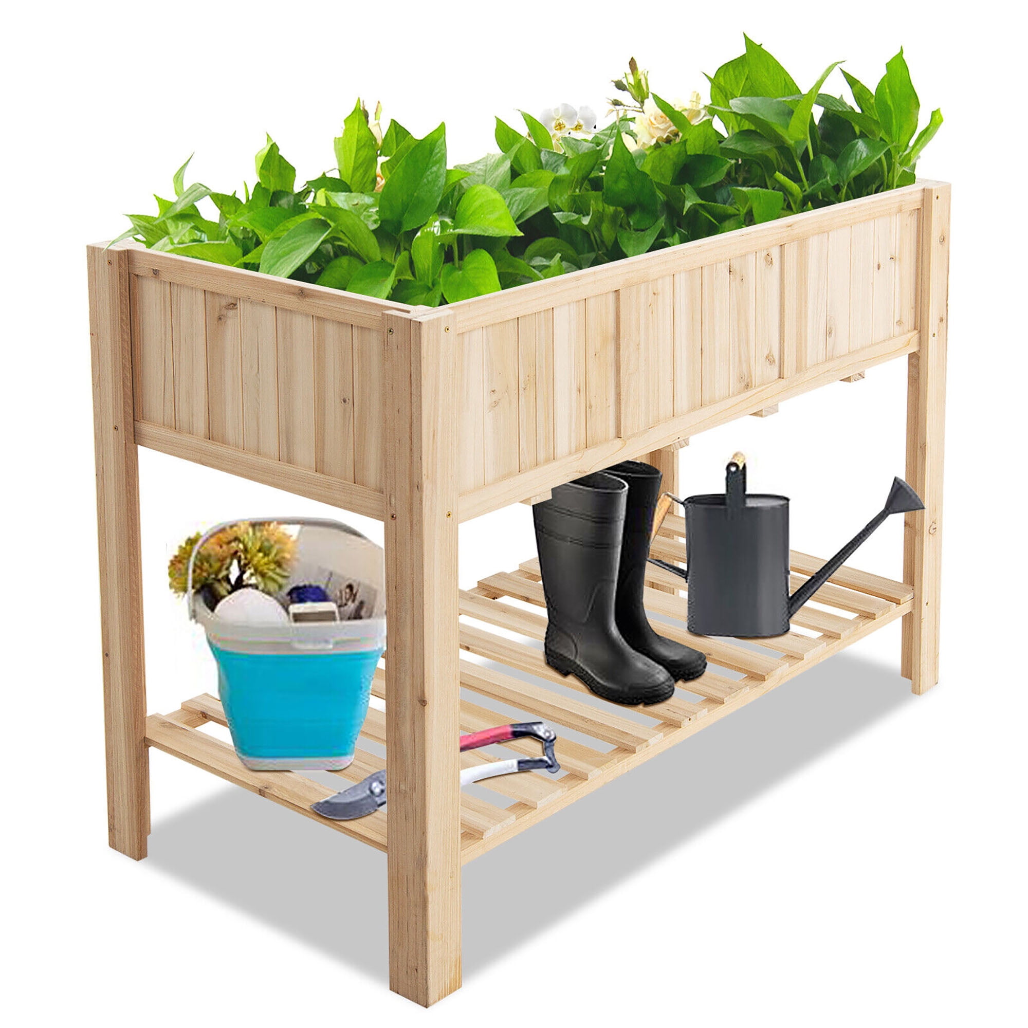 Practical 2 Tier Design: The large rectangular planter box provides 5 cubic feet of growing space,enough to keep your vegetables,flowers,and herbs grow healthily. In addition,there is a bottom storage rack for placing daily planting tools,which is convenient for you to take care of your plants. User-friendly Elevated Design: Our raised planter box is 35” tall so you can easily care for plants without bending over. The ergonomic height will bring you a better gardening experience and is very friendly for gardening enthusiasts who have back pain. Besides,it can protect your plants from small animals. Sturdy Fir Wood Structure: The garden bed is made of natural fir wood for excellent strength and durability and is suitable for outdoor use. In addition,four reinforced crossbars at the bottom of the planter box and four 2.5” thick legs make the garden bed stable and strong,bearing 309 lbs. Suitable for Various Space: Our garden bed features a natural look and a compact two-tier design,perfect for patios,backyards,gardens and balconies. What’s more,the original wood color design allows you to easily paint any color you want and draw on it to make your space more beautiful no matter where it is placed. Easy to Assemble & Maintain: The raised garden bed is easy to put together with the guidance of clear instruction manual and assembly video. Besides,a bed liner is provided to separate the planter box from the soil,making it easy to keep the planter clean. And the non-woven liner is permeable and breathable,which is beneficial to plant growth. Ergonomic height is friendly to those who have back pain Thick wooden legs and reinforced crossbars ensure great stability Solid and waterproof fir wood is Sturdy and stable Compact and natural design ideal for many spaces Easy to paint and draw on it to customize a special garden bed Simple structure and detailed instruction allows quick assembly
