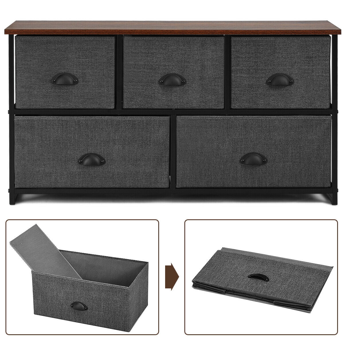 Description: The drawer organizer unit is a simple and highly functional unit with a spacious top and five fabric drawers to keep the clutter in control. Made of Sturdy steel frame and thick medium density fiberboard , this drawer storage unit is solid enough to serve a long time. This chest of drawer comes with 5 folding fabric bins, which provides plenty storage space for you. More, the drawer of soft fabric surface won’t damage your article. Ideal for workout gear, leggings, yoga pants, extra blankets and more. Great for closets, bedrooms, bathrooms, guest rooms, nurseries, playrooms, entryways and more. Features: 5 drawers with two different size Non-woven fabric drawer of soft touch protect your articles Reinforcement of bottom and front with MDF plate improve drawers’ weight capacity Suitable for home and office use Easy installation and detailed instructions Specification: Color: Black Material: Steel, MDF, Non-woven Fabric Net weight: 21lbs Product dimensions: 39.5”(L)X12”(W)X21.5”(H) The top measures: 39.5”(L)X12”(W) Medium Drawer dimensions: 11.5”(L) X 10.5”(W) X 8.5”(H) Large Drawer Dimension: 19”(L) X 10.5”(W) X 8.5”(H) Weight capacity of drawer: 5.5lbs Weight capacity of table top: 66lbs Package includes: 1 X 5 drawer chest of drawers 1 X Instructions