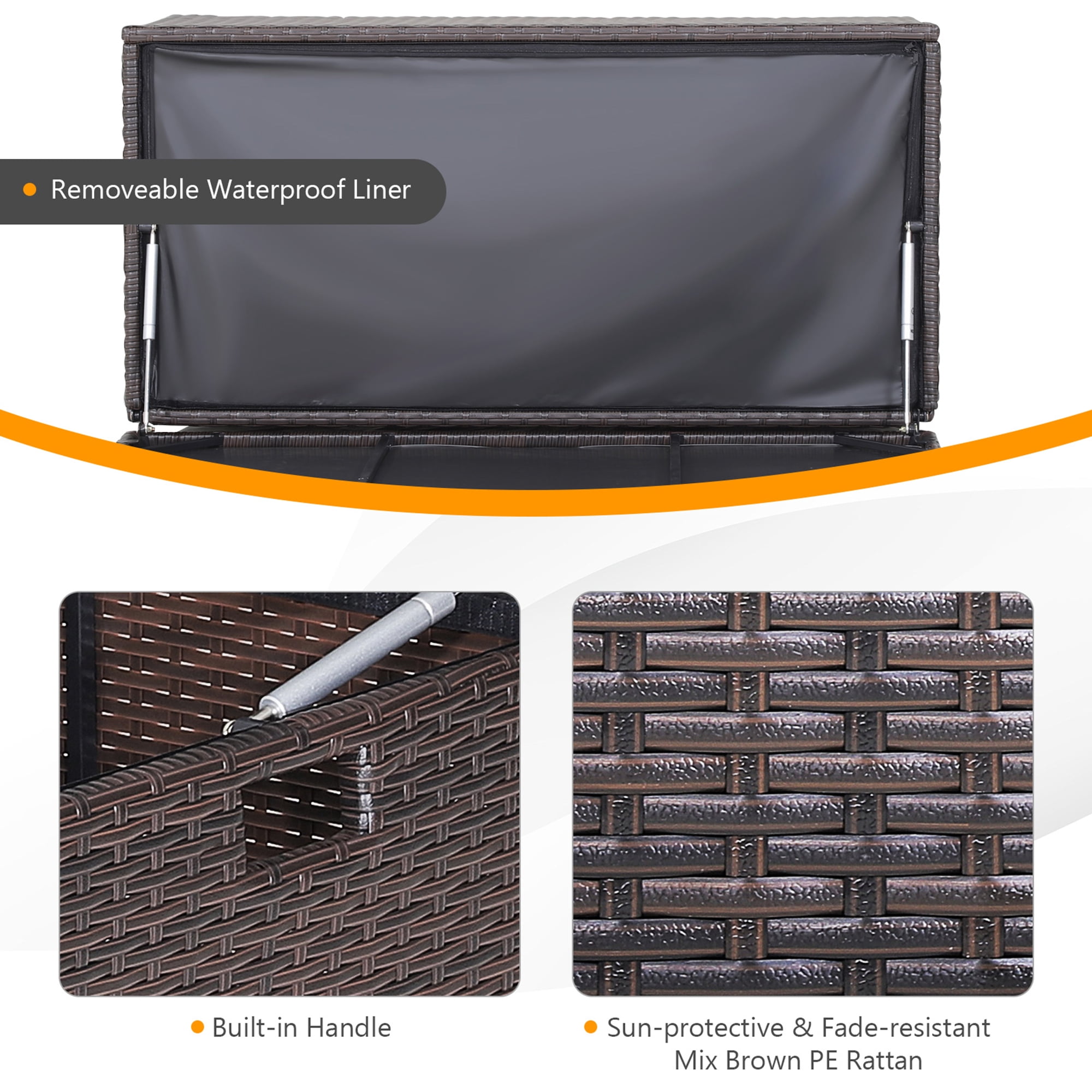 50 Gallon Storage Capacity: This outdoor storage box features 50 gallon inner capacity,which can store multiple back cushions and seat cushions at once. In addition to storing cushions,it can accommodate blankets,gardening tools and sports equipment as well. Protective Liner: The waterproof liner with PU coating effectively protects your items from raining to keep them dry. For long lasting use,we suggest you do not leave it outside on raining days. And it is removable with zippered design. Moreover,the sun-protective and fade-resistant mix brown PE rattan,as well as the rustproof steel frame make the storage box Sturdy and stable for outdoor use. Pneumatic Rod for Safety: This garden deck bin is equipped with the premium pneumatic rod with the sturdy triangular structure that is convenient for you to open and close the lid. Meanwhile,it is child-friendly for safe protection. When the lid is closed,this outdoor storage box serves as a side table thanks to its multifunctional design. Hassle-free Movement: Featuring 2 universal wheels which are smooth,non-slip and quiet,this outdoor storage container is convenient for you to move wherever you want,such as patio,garden,backyard or poolside. And the built-in handles on both sides make movement easier. Easy to Assemble: The straightforward instruction and all included accessories facilitate the installation. Please do not tighten all the screws until all the holes are aligned. Overall dimension: 40” x 20” x 20.5” (L x W x H),inner dimension: 38” x 18” x 16.5” (L x W x H). Please refer to the size instructions before purchasing to avoid unnecessary trouble. Sun-protective and fade-resistant mix brown PE wicker for high durability Sturdy and rustproof steel frame for strong stability Easy and safe to open and close with pneumatic rod Serve as a side table when the lid is closed 2 universal wheels for effortless movement 2 built-in handles for great convenience Suitable for patio,garden,poolside and backyard,etc Clear instruction for simple installation