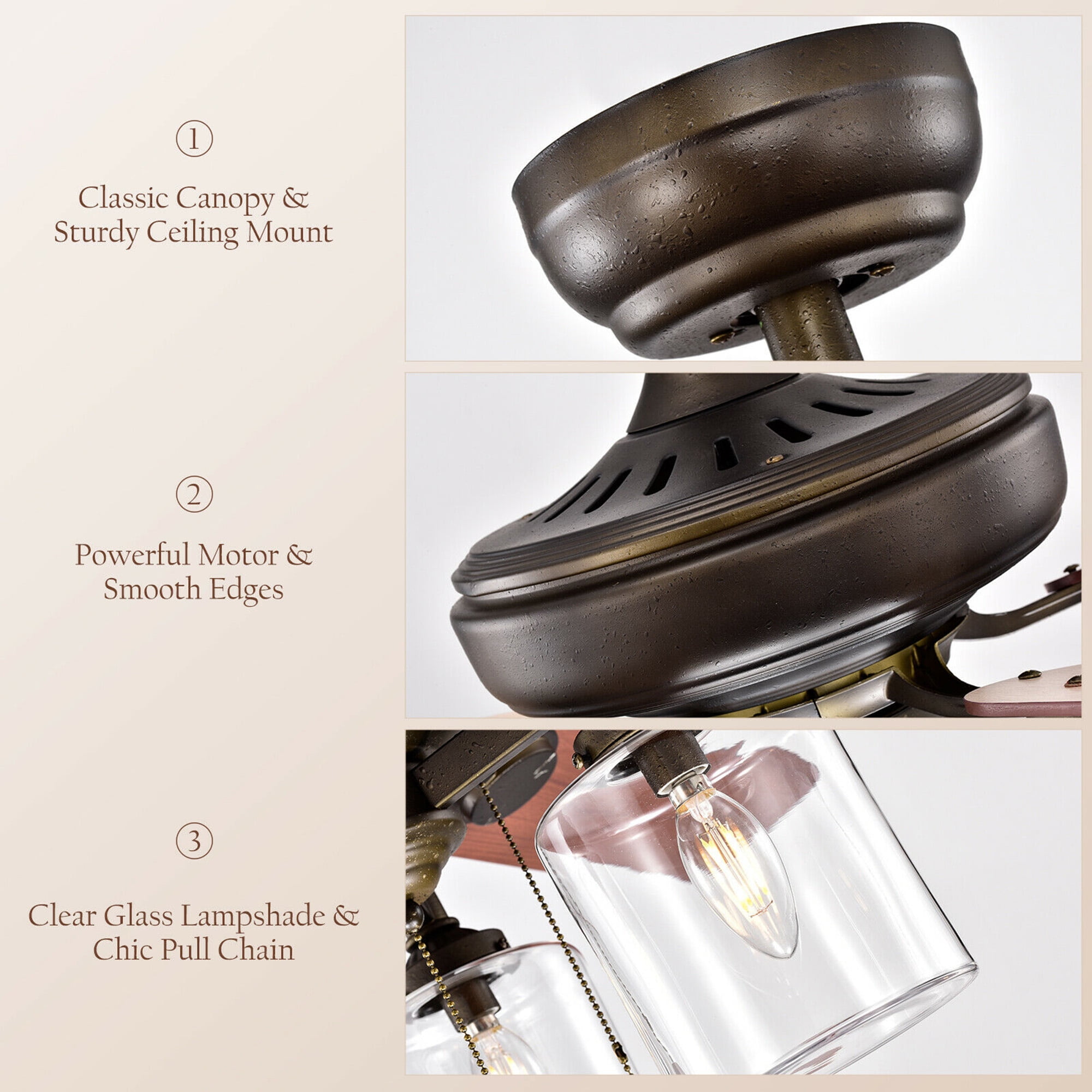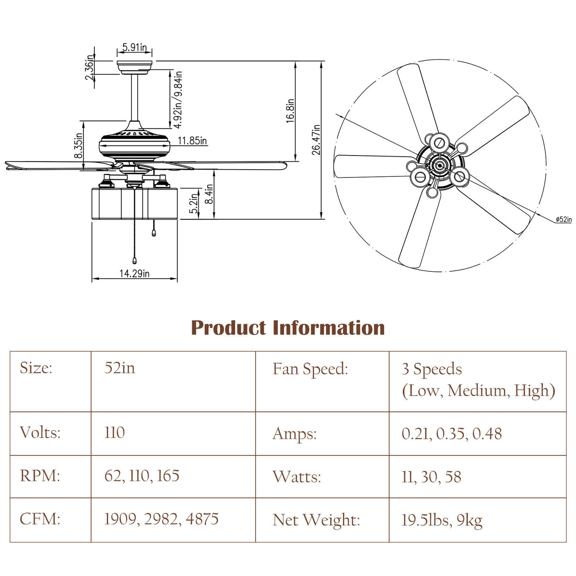 Classical Ceiling Fan with Clear Glass Lights: Bronze-finished retro ceiling fan with clean lines provides a simplistic neutral aesthetic to elevate your interior decoration style. There are 2 optional colors of wood blades for you to choose depending on your flooring colors. And 3 clear glass lampshades can refract bright light. 3 Adjustable Speeds & Pull Chain Control: 3 rotating speeds (9w, 26w, 67w) can be adjusted easily to your needed setting by pulling the chain. The other chain is the light switch, which is easy to control. The pulling chains are long enough for you to reach, so you don’t need to worry about the length. Powerful Motor & Reversible Function: The premium motor delivers comfortable airflow in quiet performance, which won’t disturb your sleeping or working. Switching the reversible button, the ceiling fan will change the wind direction. Corotation enhances heat airflow movement in winter and reversion generates a breeze in summer. Replaceable Downrods & Quick Assembly: This ceiling light is equipped with 2 downrods (5”/10”), which can help adapt to different ceiling heights. With all parts labeled, you can assemble the light fan step by step following the instructions without knowing any electrical knowledge. Match with Various Occasions: Specially designed with 3 functions of lighting, air flow & decoration, this ceiling fan lighting provides you with a bright and breezy room. The beautifully crafted metal fan fits the living rooms, bedrooms and dining rooms providing an impressive eye-catching style. Easy-to-use pull chain control makes speed shift & light switch a breeze Bronze finished fan with wood blades fits various decoration styles 3 clear glass lampshades cast bright light (bulbs are not included) Step-by-step instructions & labeled parts make assembly easier