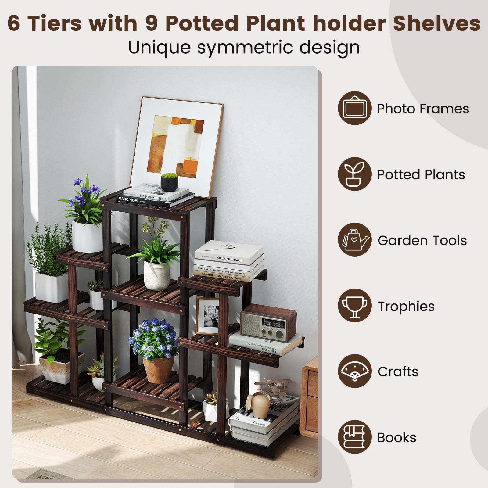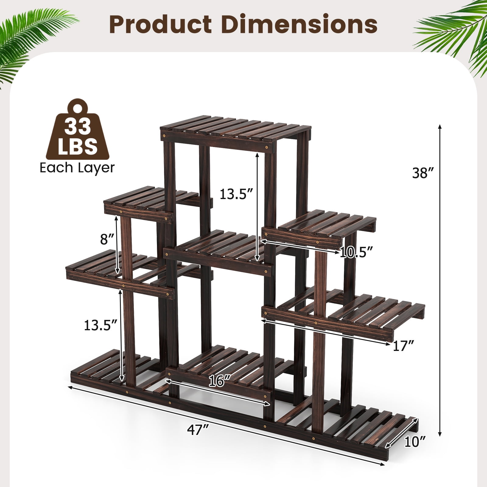 Description: Our wood flower rack is made of solid wood which is Sturdy and eco-friendly. Its carbonized surface absorbs impurities from the air, making it an excellent partner for plants. Not only that, insects don’t like it and it has a unique smell. The structure of the 6 layers allows you to place 9 flower pots of different sizes. The hollow design not only increases the breathability of plants, but also allows excess water to flow down, thus saving water. Its irregular patterns and symmetrical patterns give it a unique shape, and you can put it in your living room for all kinds of items. Spray paint on surfaces can be waterproof, so you can put it outside. Features: Carbonization can absorb impurities in the air and give off a unique fragrance Its irregular wood grain and symmetrical structure give it a unique shape The surface of rack is painted with waterproof water-based paint It is multi-functional and can suitable for many occasions Specification: Color: carbon baking Main material: solid wood Overall size: 47.5”x 10” x 38” (L x W x H) Net weight: 12 lbs Each layer loads: 22lbs Interval height: 9”, 13.5”, 14”, 15” Package includes: 1x 6-Tier Flower Wood Rack 1x Instructions