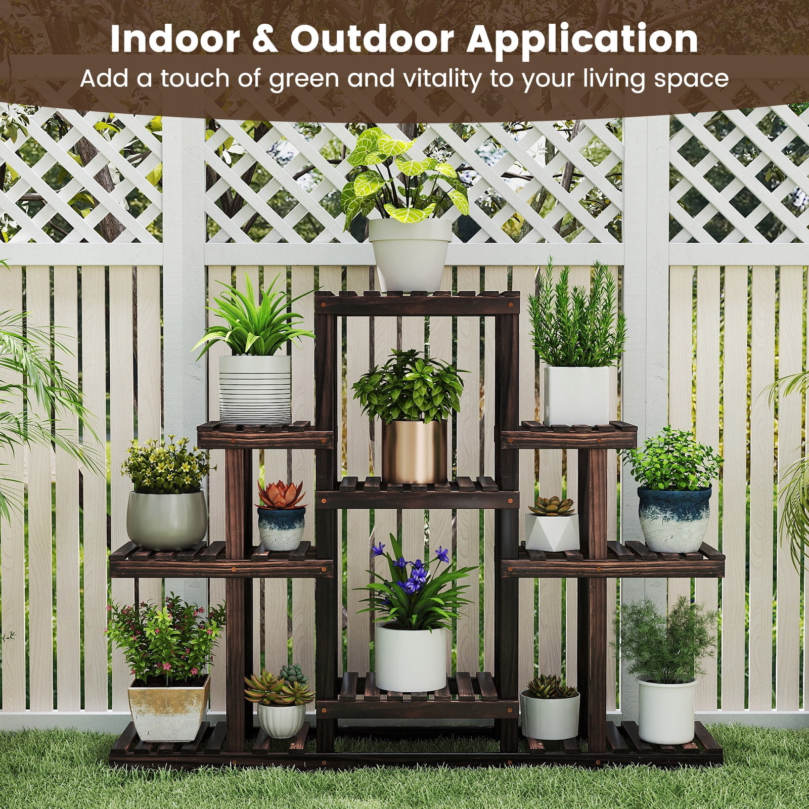 The rack is made of natural solid wood which is environment friendly and Sturdy 6-tier wood shelf provides large spaces for plants to grow in flower pots of all sizes Hallow design can increases the circulation of air and ensures breathability of the plants Water comes out of the bottom of the pot to automatically water the plants below Carbonization of the surface increases the deformation resistance of the flower stand.