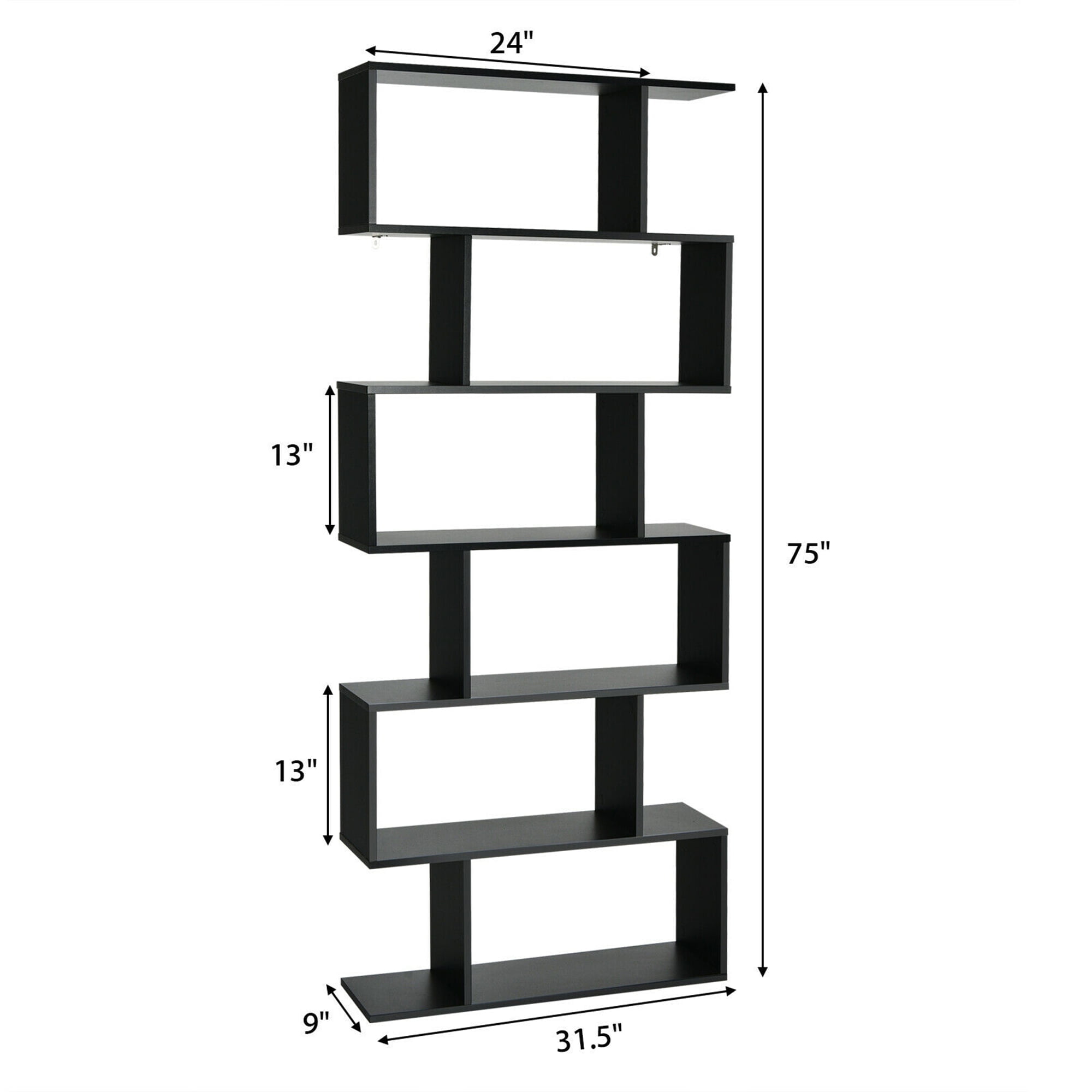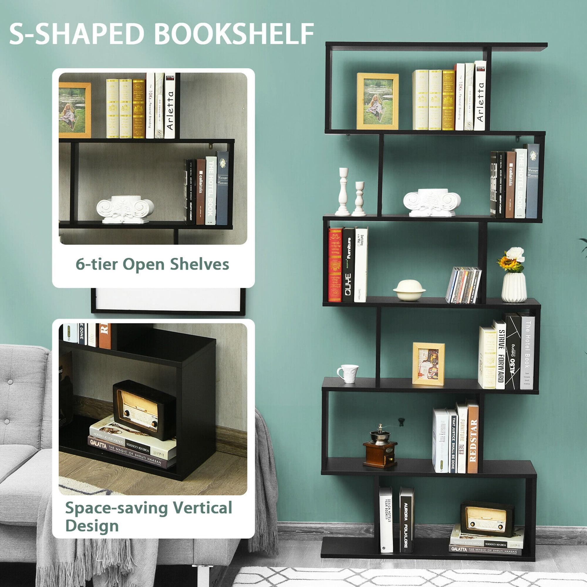 Gymax 6 Tier S-Shaped Bookshelf Storage Display Bookcase Decor Z-Shelf Black