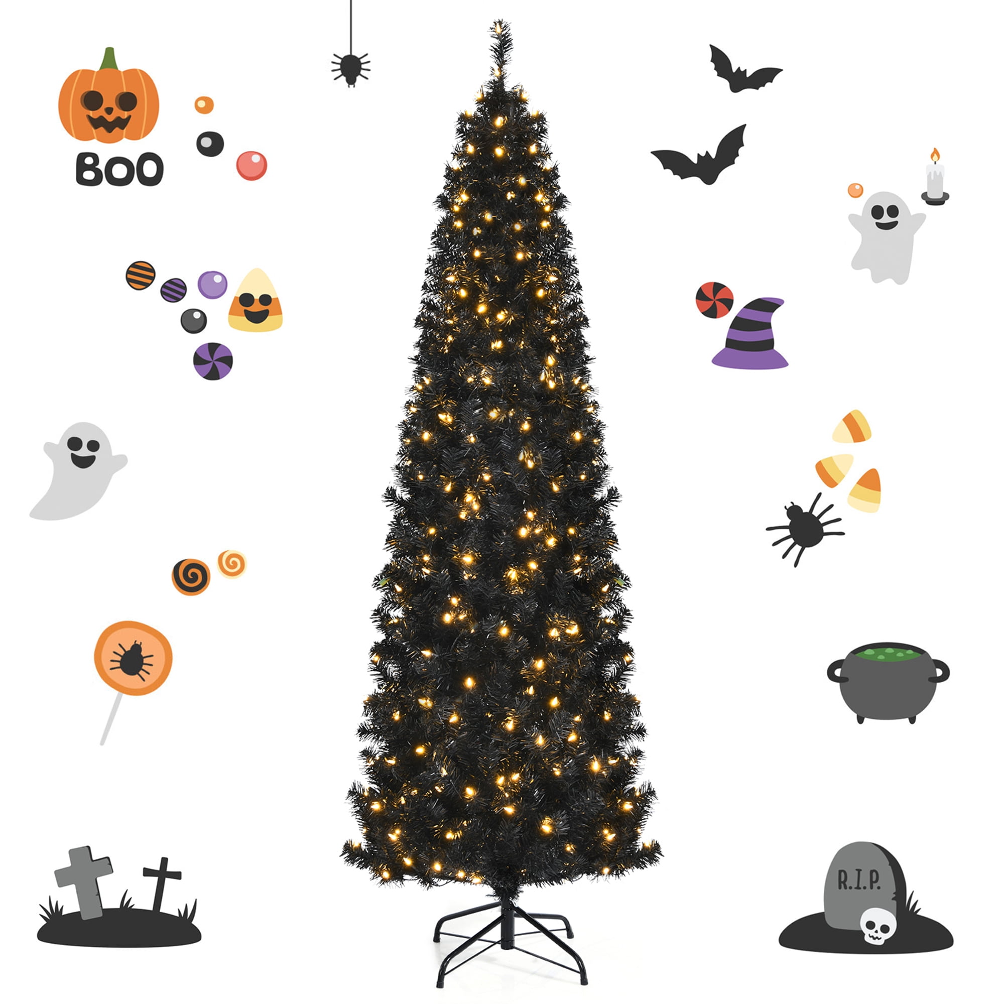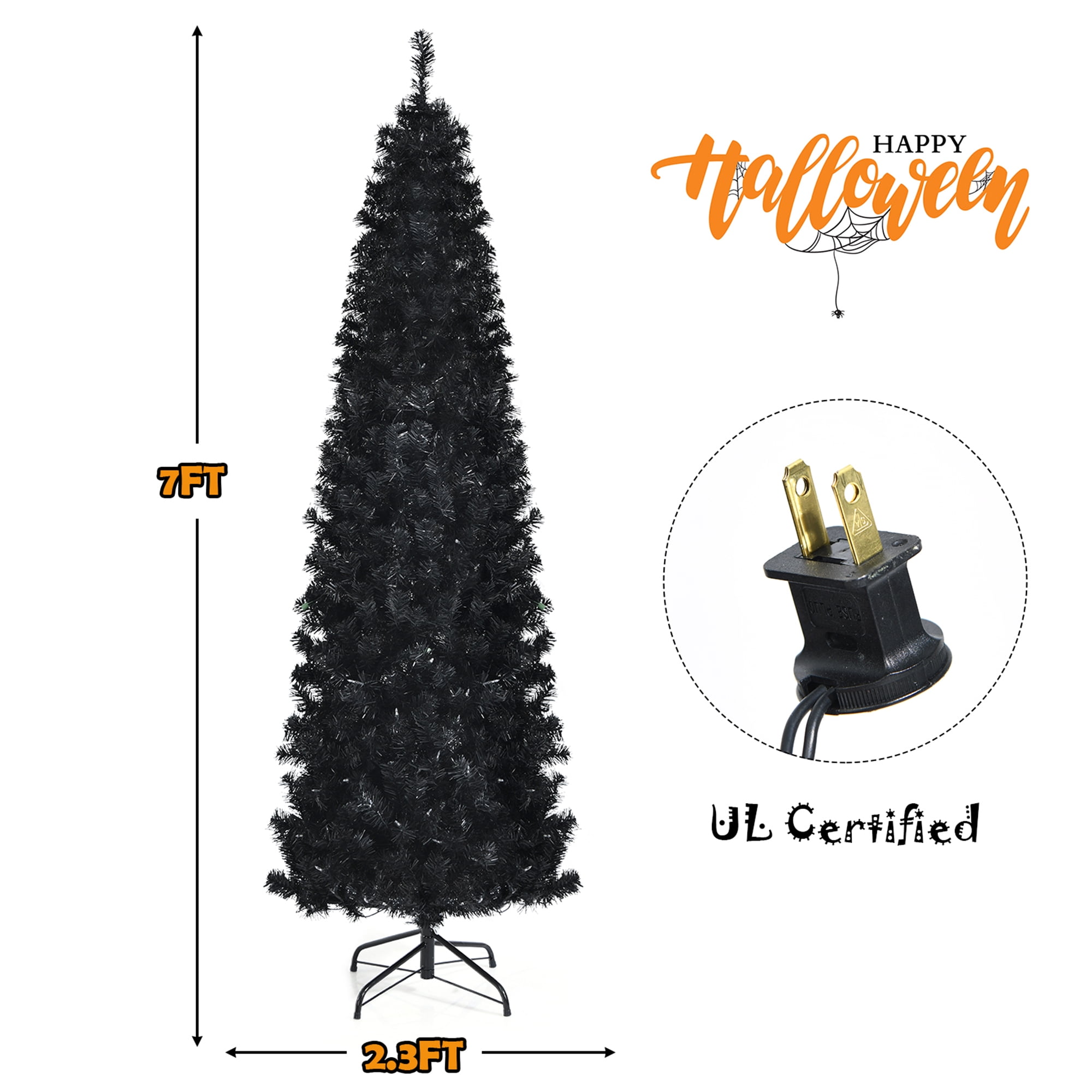 This 7 feet tall black Christmas tree provides you with more using choices. It’s able to match various party themes, such as Christmas and Halloween party. It can always bring a strong festive and pleasant tone to you. Featuring about 818 branch tips, this slim pencil tree provides a lush, full and natural appearance. You can add extra ornaments on the tree with your family members to customize your dreamed tree. And it comes with 350 pre-strung warm white LED lights to make itself more attractive in the evening. If one bulb is burnt out, you can replace it with spare bulbs which come with the package. Made of 100% new PVC, this Christmas tree with hinged structure can serve for you for years to come. Features: Warm white LED lights can be replaced with spare bulbs if burnt out An ideal decoration tree for both Halloween and Christmas use Convenient hinged branches and 3 sections for easy setup Color: Black Material: New PVC, Metal Overall Dimensions: 2.3′ x 7′ (D x H) Net Weight: 15.6 lbs Number of Tips: 818 Number of Lights: 350 Number of Sections: 3 Package includes: 1 X Black Pre-lit Christmas Tree 1 X Metal Stand