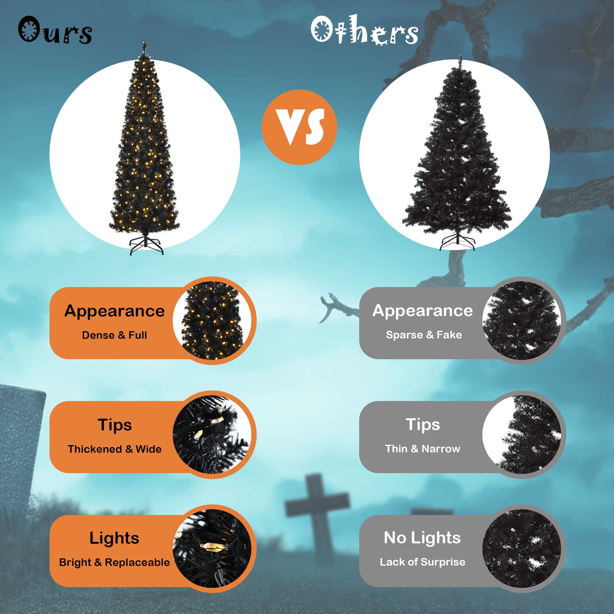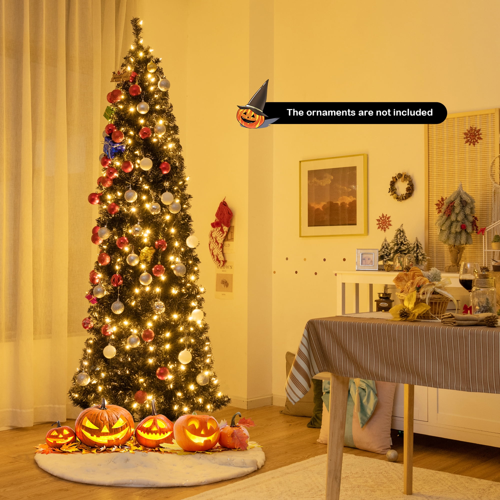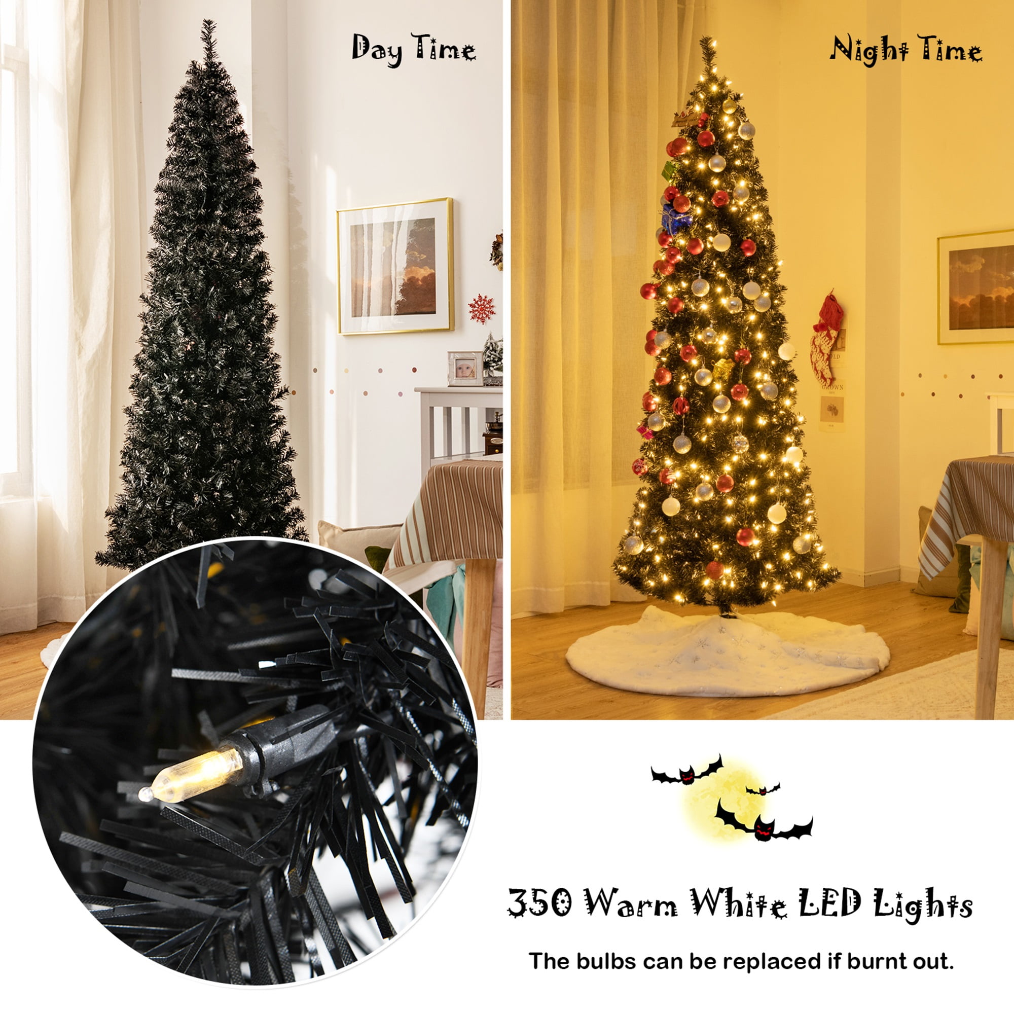 Multipurpose Black Tree: Standing at 7ft tall, this artificial Christmas tree with special black color will bring a different using experience to you. Except for LED lights, the tree has no extra ornaments, so you can release your imagination to decorate it freely. According to different ornaments on it, the tree can be used on various parties, such as Christmas and Halloween. Bright LED Light Strings: This pre-lit pencil tree is equipped with 350 replaceable warm white LED lights, aiming to make the tree more gorgeous in the night. All lights work independently, which means that you can change bulbs with spare bulbs (included in the package) if they were burnt out. 818 branch tips form a full-bodied and lush appearance